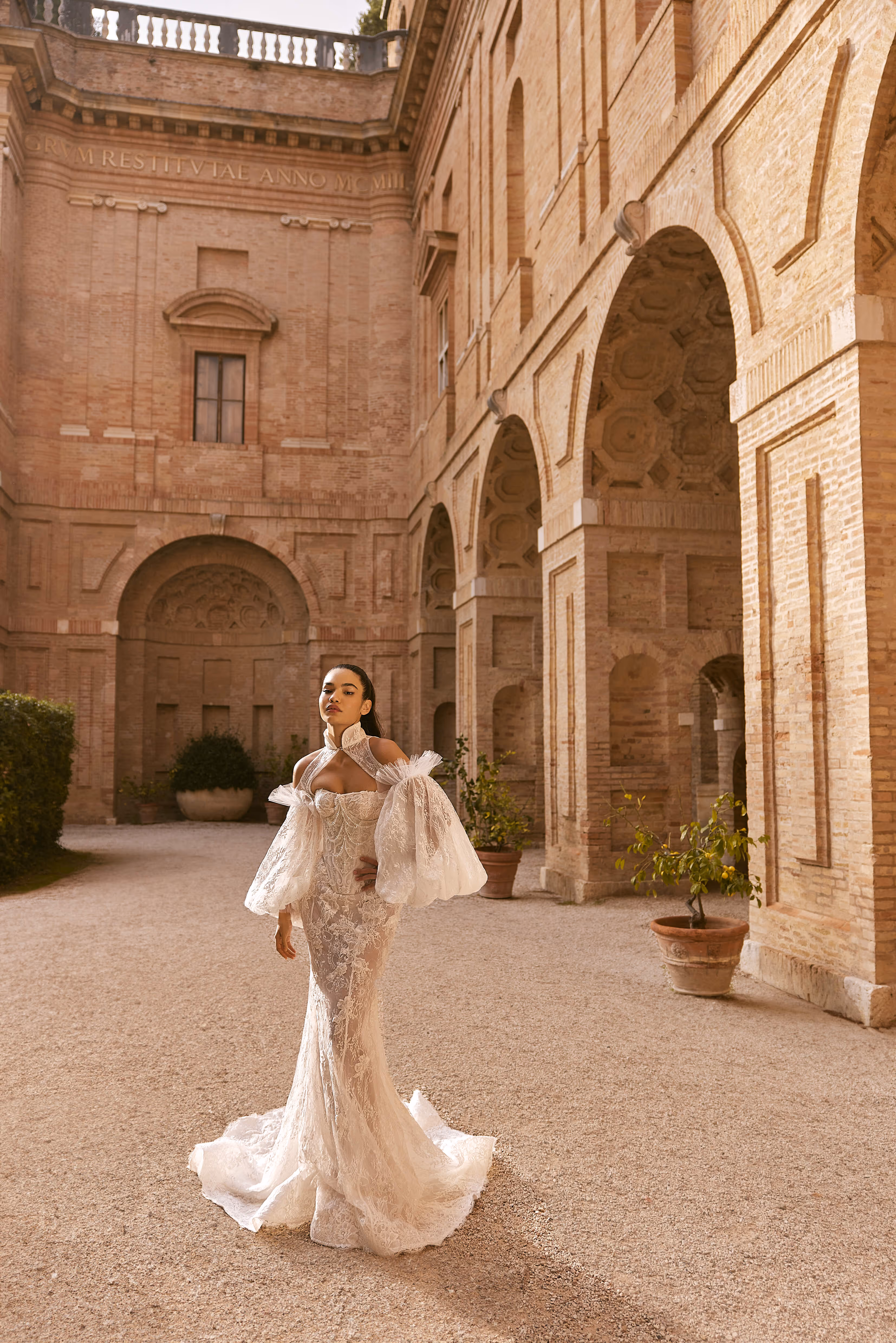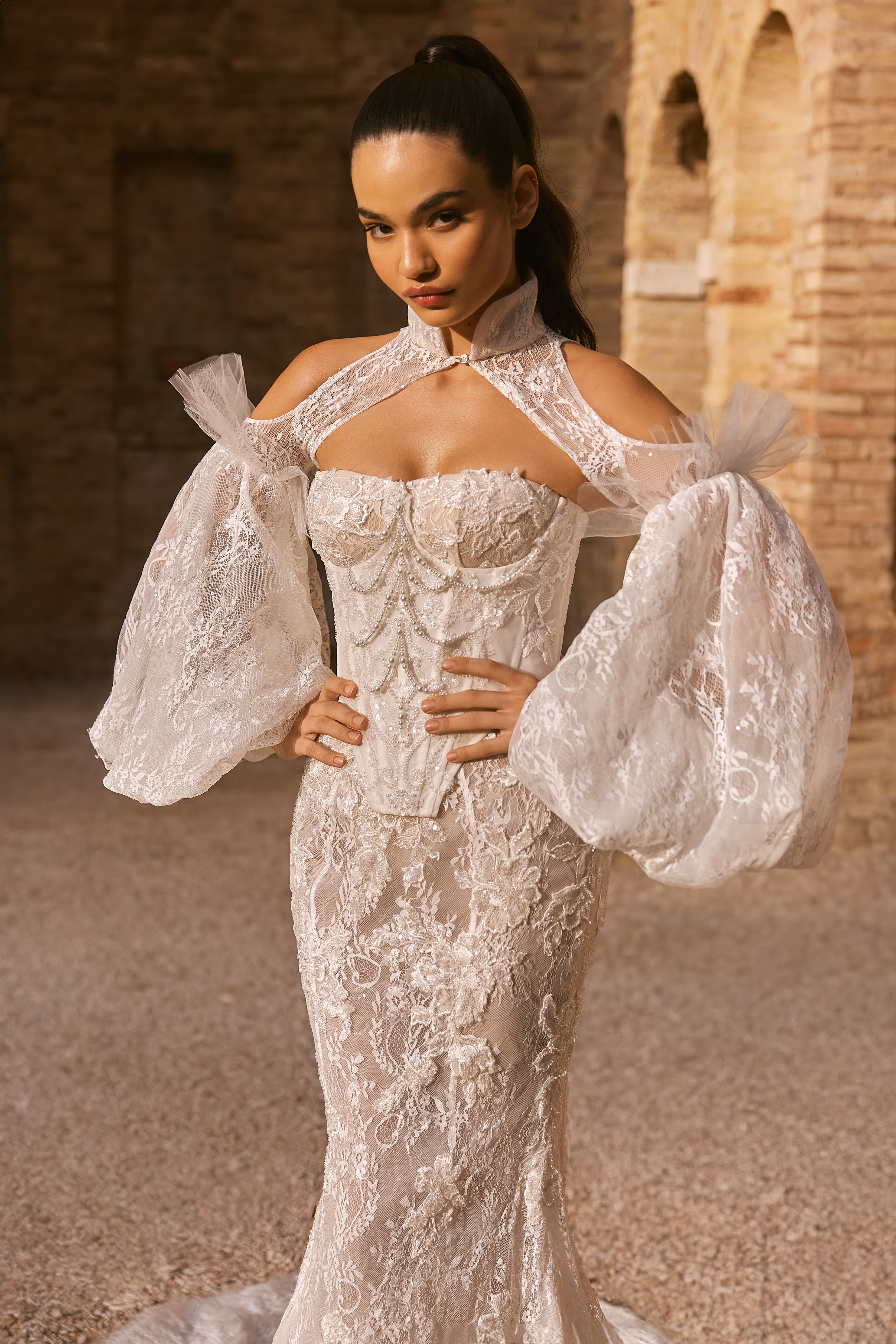 Мереживна сукня силуету «рибка» доповнена знімним корсетом, майстерно декорованим каскадами вручну викладеного каміння, що додає образу вишуканого блиску. Завершує ансамбль ефектне болеро з об'ємними рукавами, яке застібається на шиї, створюючи справжній шедевр. Для наречених, які прагнуть ідеального балансу стилю та елегантності.