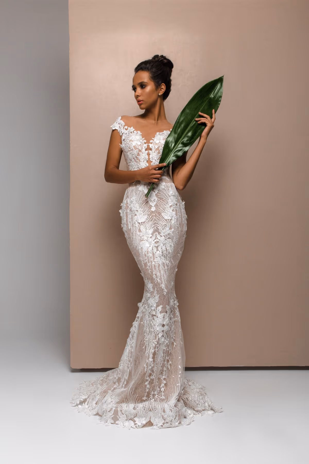 Захоплююча сукня у стилі рибка, яка прикрашена витонченим мереживом, що ніжно облягає плечі. Її облягаючий силует підкреслить ваші форми, а декороване мереживо додасть нотки романтики та чарівності. Дизайн цієї сукні надовго залишить незабутнє враження в день вашого весілля.