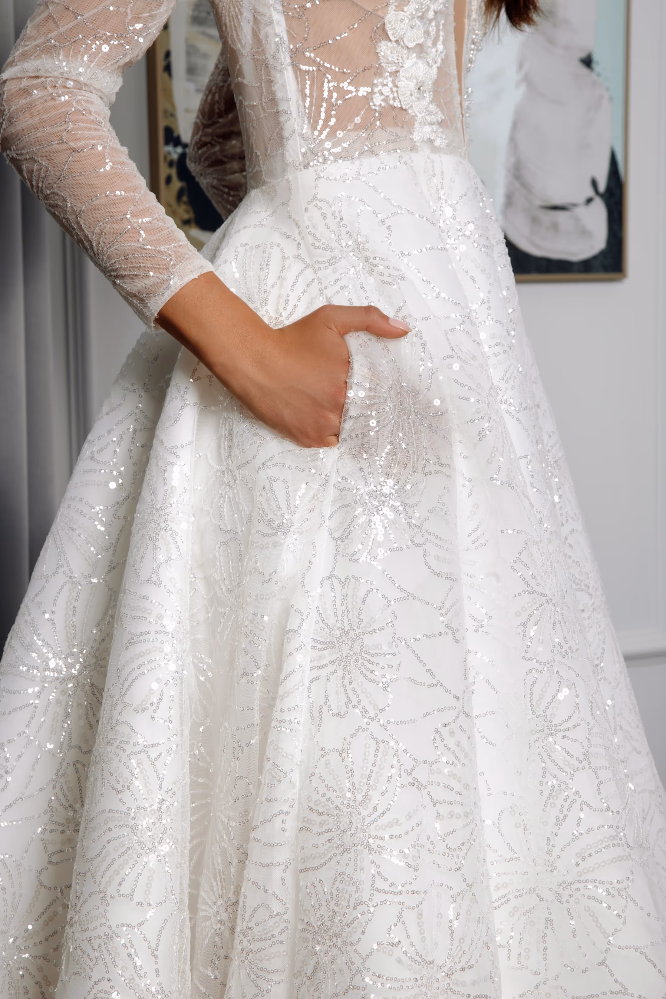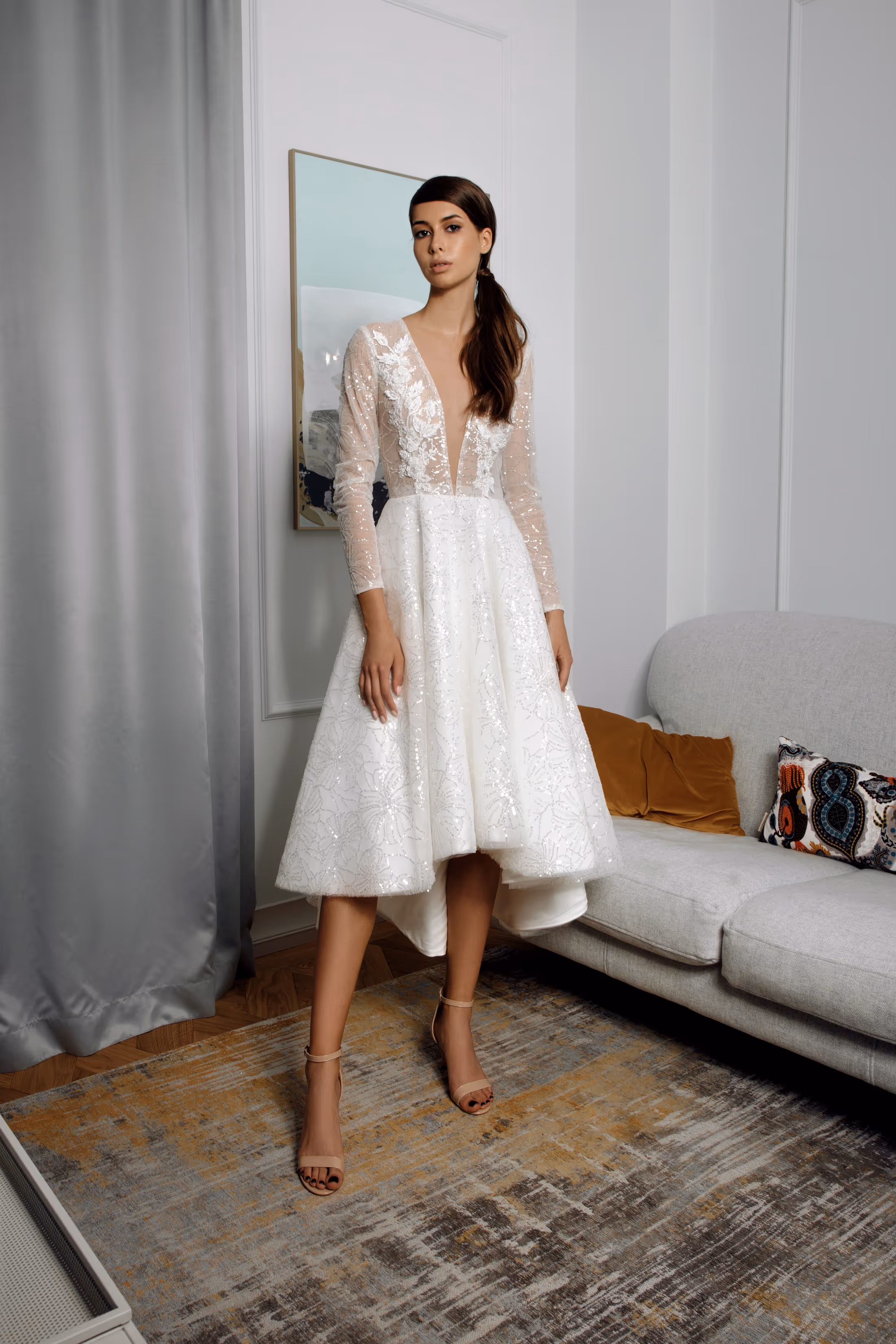 Мереживна сукня міді на довгий рукав має V-подібний виріз, що виблисковує елегантністю та вишуканістю. Вишукані деталі мережива додають нотку романтики, роблячи її ідеальним вибором для створення бездоганного та шикарного образу на будь-яку особливу подію.