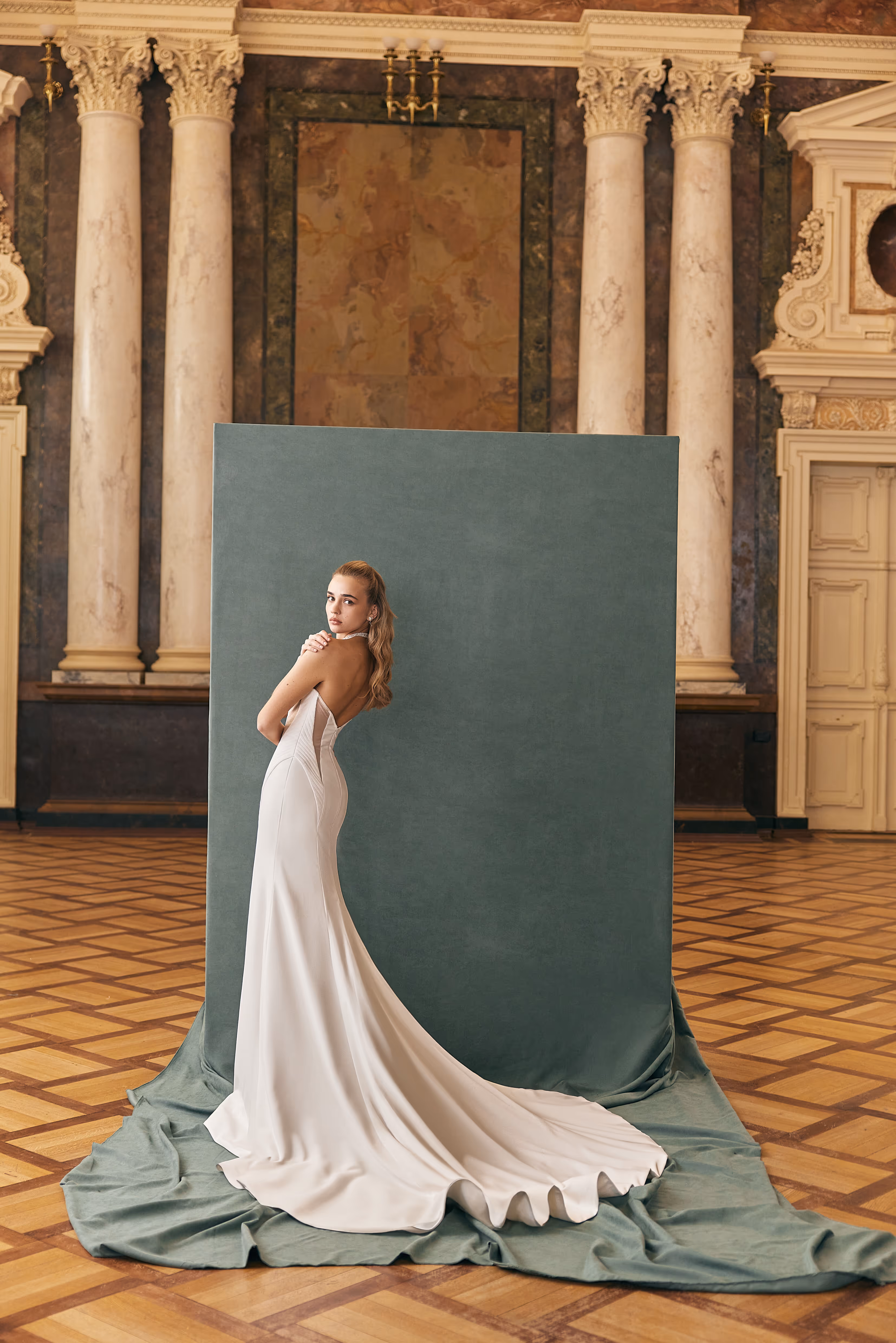 Захоплива весільна сукня, декорована імітацією прозорих і фактурних вставок, що витончено підкреслюють силует. Вишуканий бюст із загостреними чашечками додає сучасності та елегантності. Легка спідниця переходить у пишний, ефектний шлейф, що дарує відчуття розкоші в кожному русі. Ідеальний вибір для нареченої, яка прагне вишуканого та незабутнього образу.