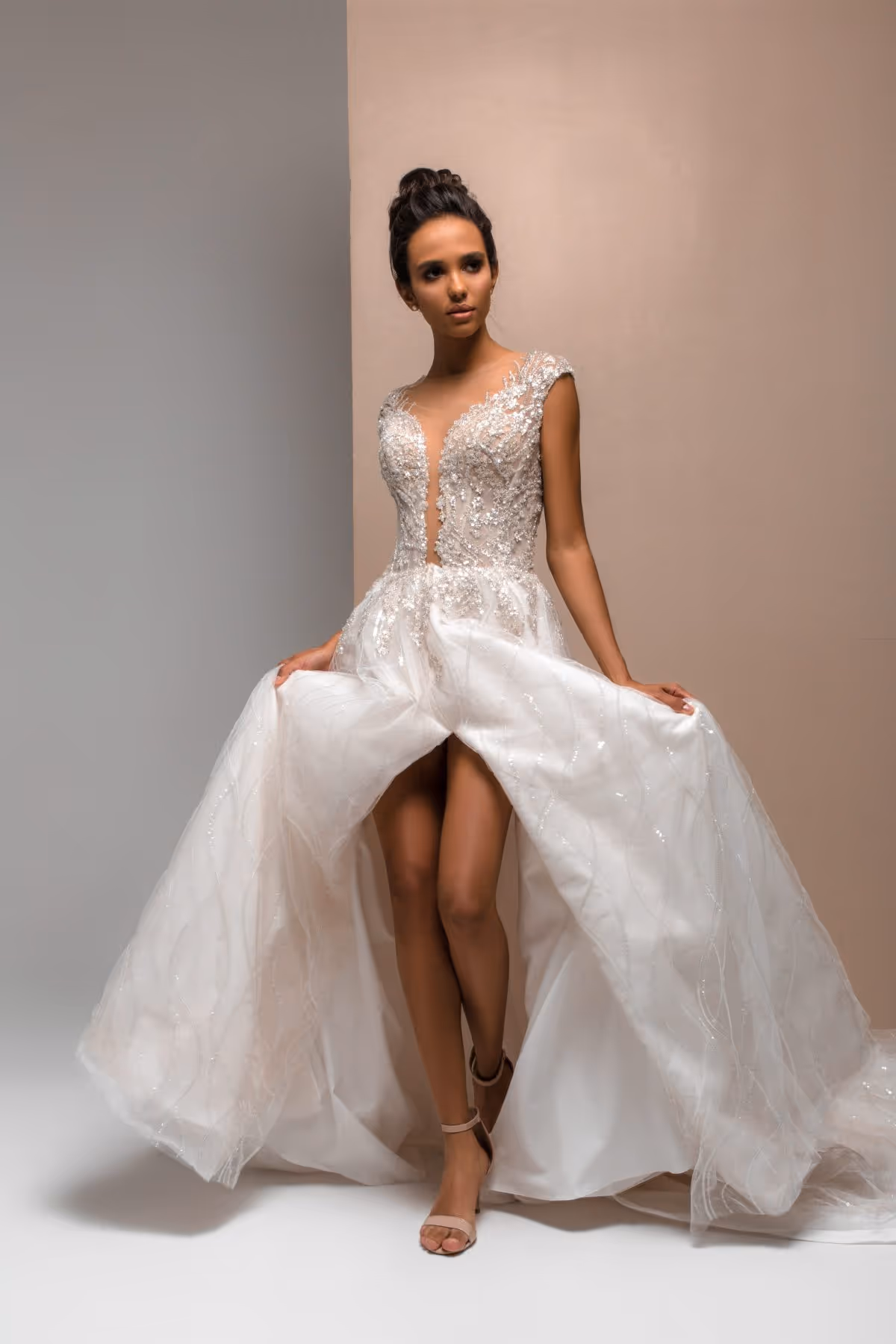 Вишукана мереживна сукня А-силуету втілює в собі вічну елегантність. Ніжне мереживо прикрашає корсет і створює романтичний образ, спадаючи по спідниці. Витончена деталізація спинки додає шарму, а невеликий шлейф ніжно підкреслює красу. З класичним силуетом і деталізацією ця сукня ідеально підійде для нареченої, яка шукає поєднання романтики та вишуканості у свій особливий день.