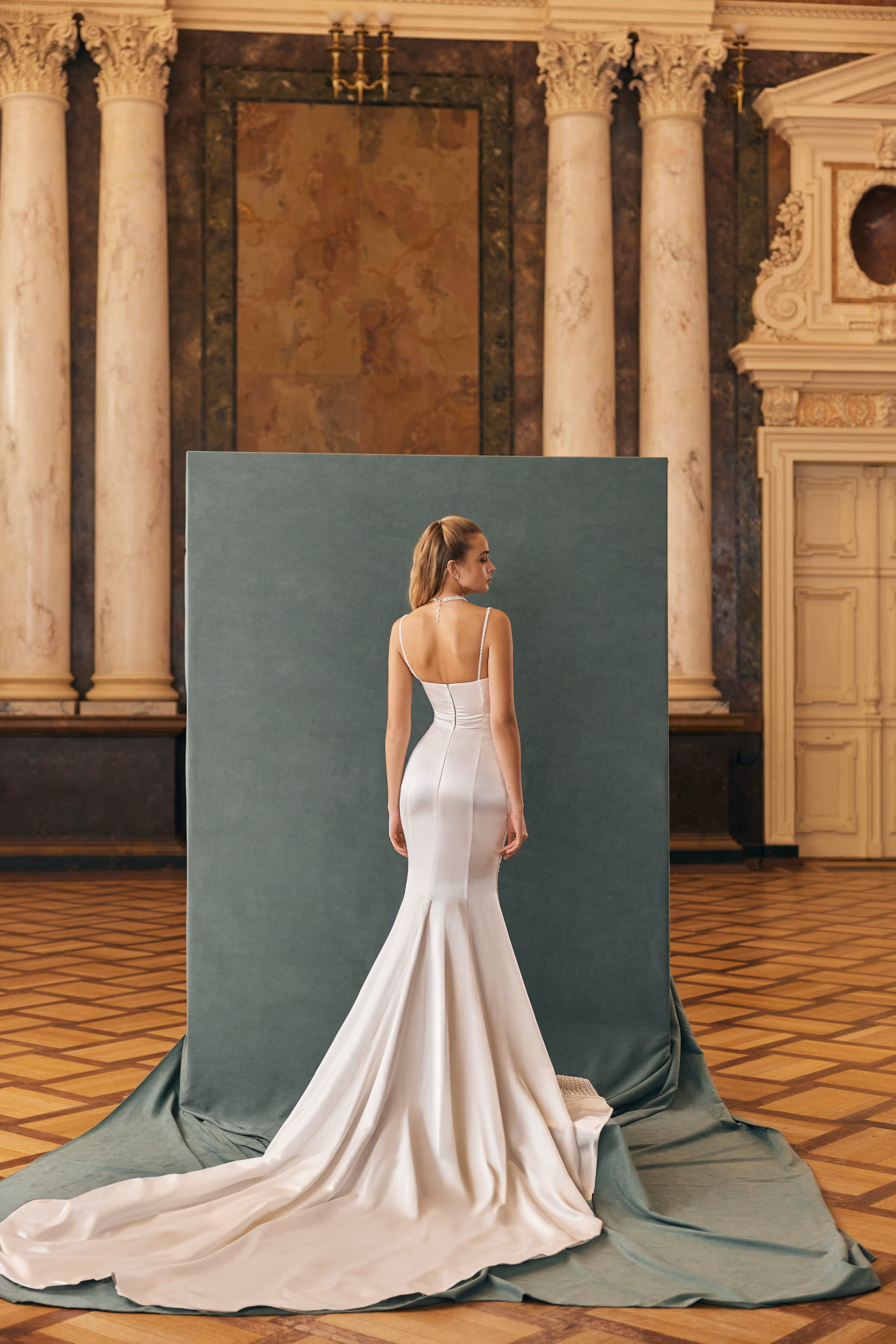 Ця сукня-рибка ніжно облягає фігуру, оздоблена мереживом з перлинами, що підкреслюють її вигини та додають романтичного шарму. V-подібний виріз декольте створює гармонійний акцент, а довгий шлейф додає драматичної величності. Окрема накидка, декорована квітковими візерунками, чудово доповнює образ, додаючи універсальності та зачаровуючи своєю ніжністю. Ідеальний вибір для нареченої, яка прагне елегантності та унікального вигляду.