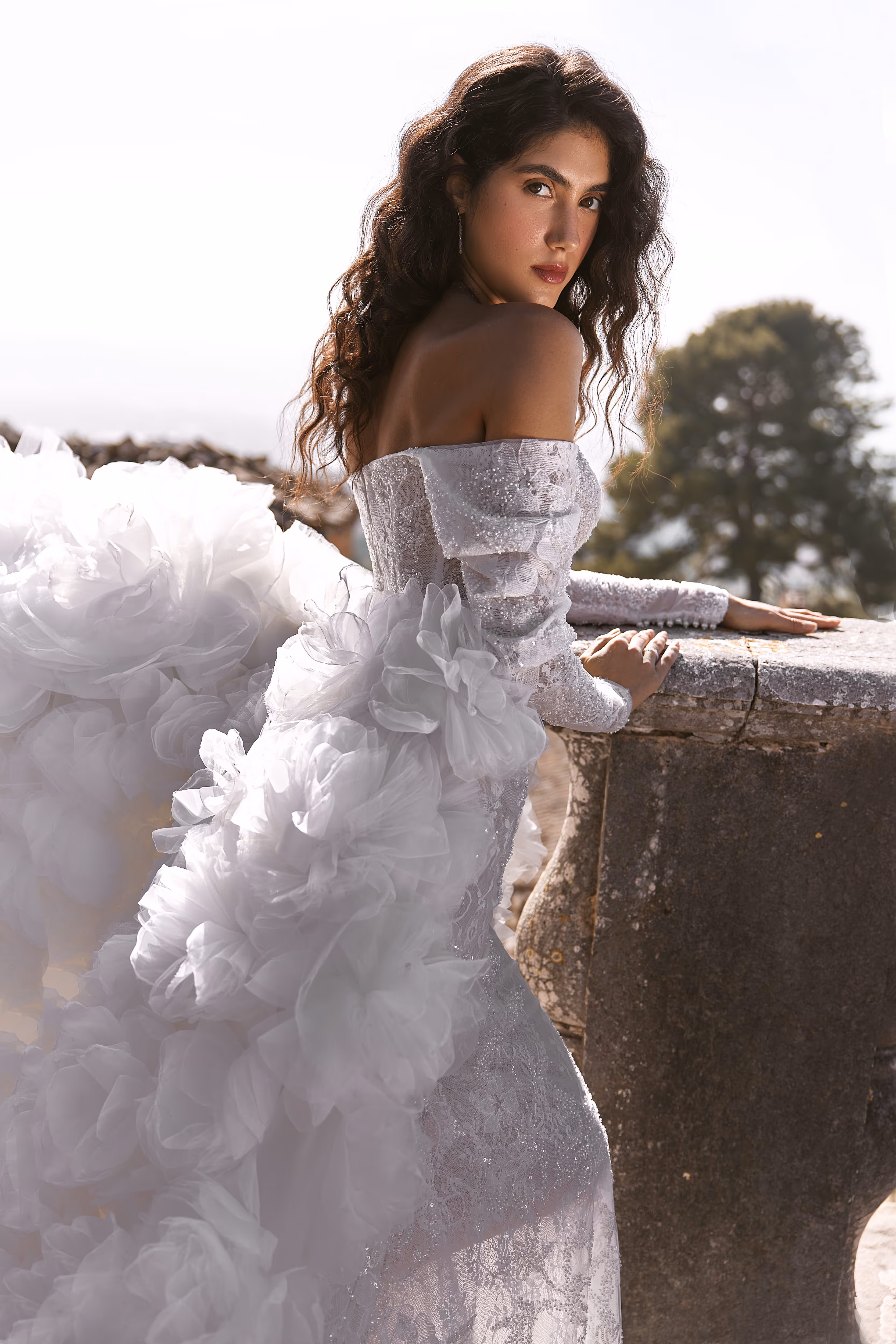 Окремі спідниця та корсет забезпечують ідеальну посадку та комфорт. Причіпні рукави з драпіруванням додають образу витонченості та граційності. А головна родзинка – об’ємний причіпний шлейф, повністю прикрашений квітами ручної роботи, який перетворює кожен крок на справжню квітучу казку. Цей дизайн перевизначає романтику, даруючи кожній нареченій відчуття грації та неповторної краси у її найважливіший день.