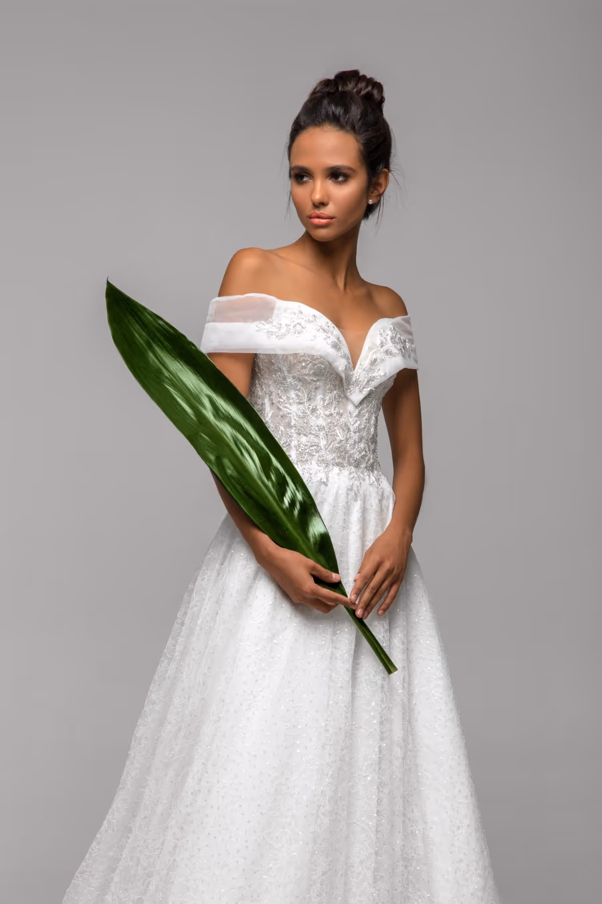 Вишукана мереживна сукня відзначається ніжно декорованими спущеними плечима та чудово вишитим корсетом, що підкреслюють її А-силует. Складні мереживні деталі додають нотку вічної елегантності, а дизайн із спущеними плечима випромінює вишуканість та шарм. Ідеально підходить для нареченої, яка шукає класичний але водночас сучасний образ, ця сукня обов'язково зачарує вас.