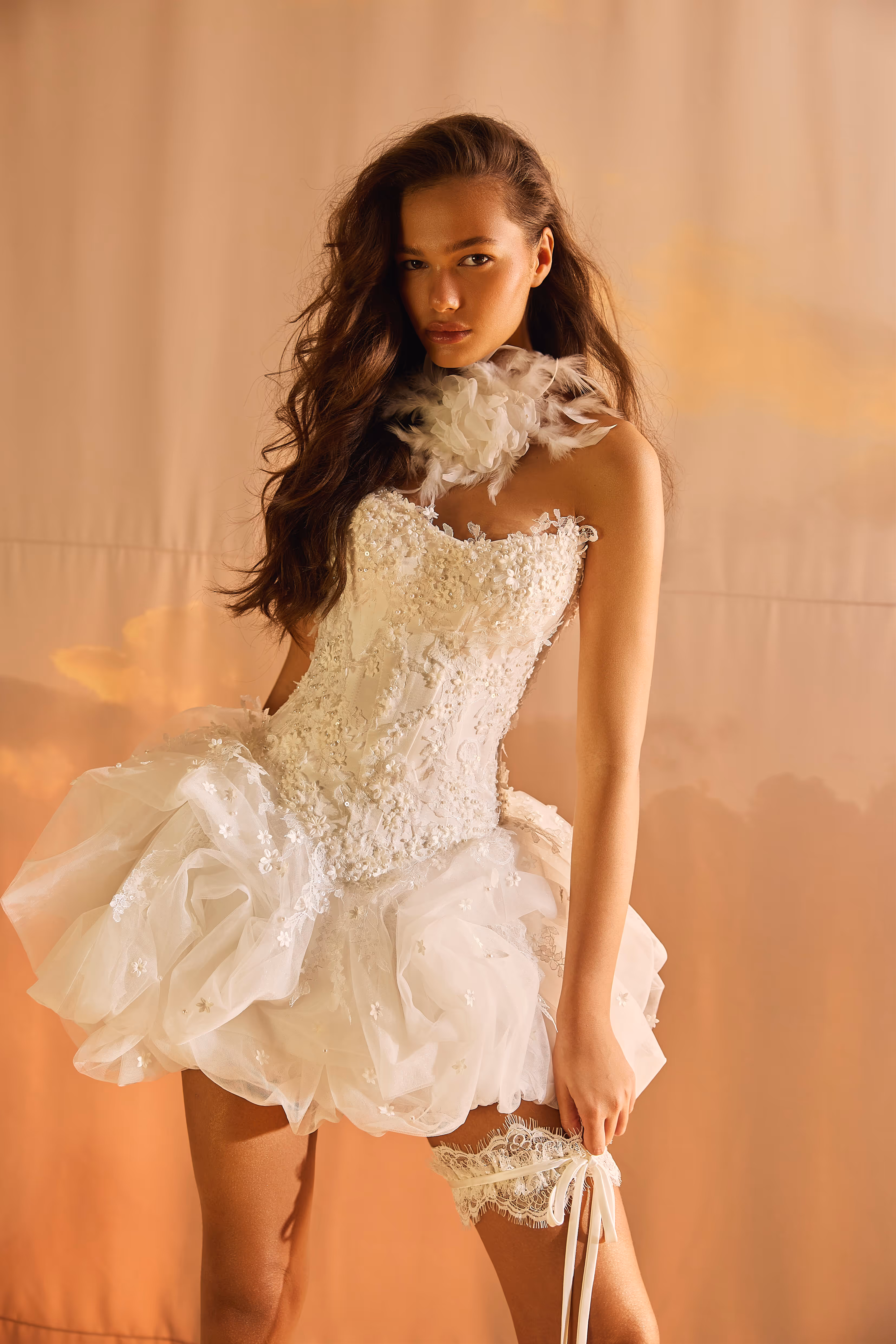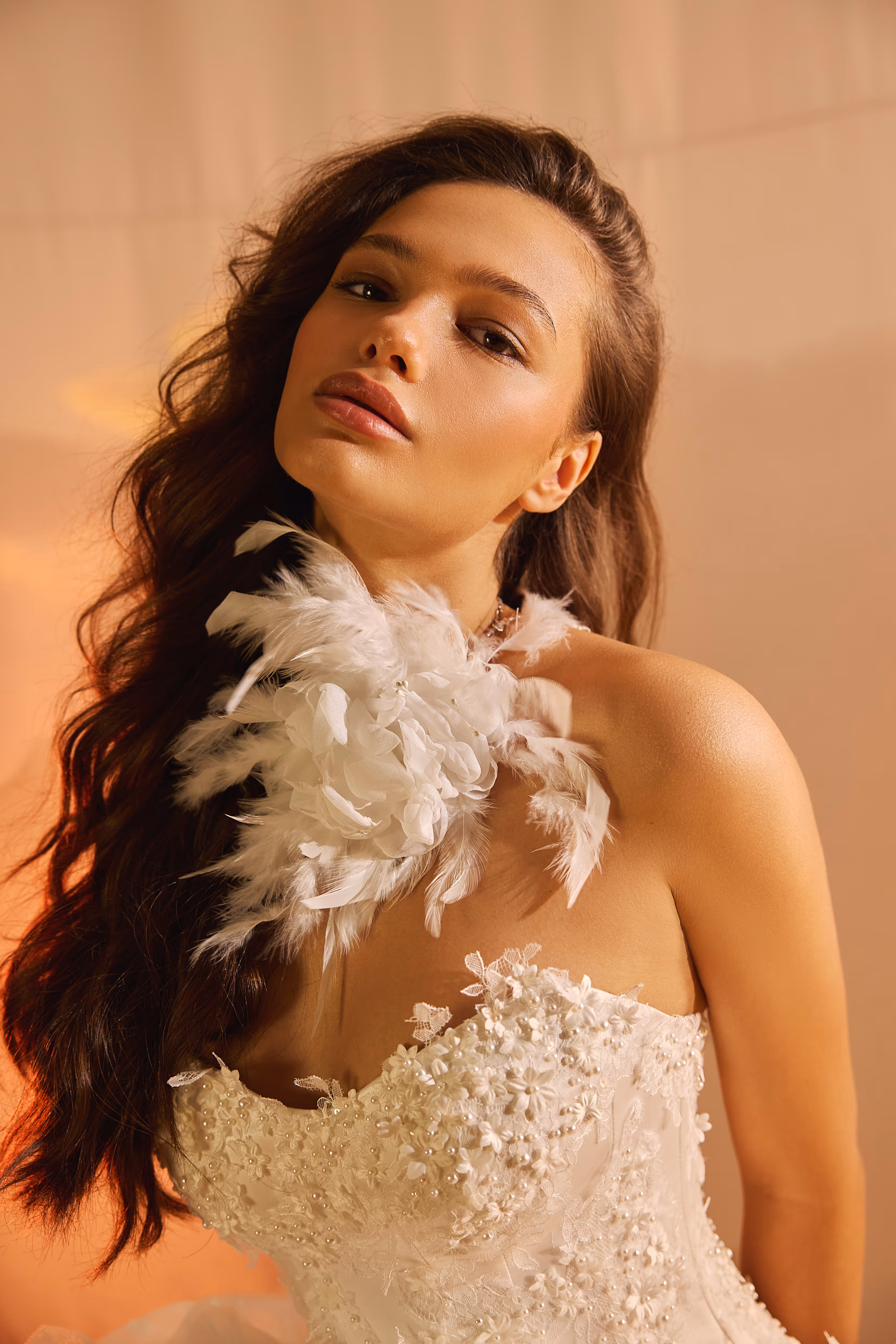 Понижений корсет на гачках, оздоблений вишуканим декором, підкреслює силует і створює бездоганну посадку. Об’ємна спідниця, прикрашена мереживом, додає образу розкоші й легкості водночас.