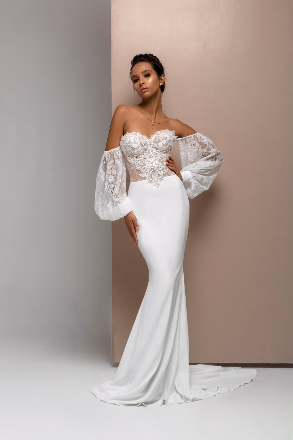 Ця вишукана сукня у силуету рибка з рукавами та витончено декорованим корсетом випромінює грацію та елегантність. Дрібні деталі на корсеті додають нотку вишуканості, а силует підкреслює природні форми, роблячи її особливим вибором для вибагливої нареченої.