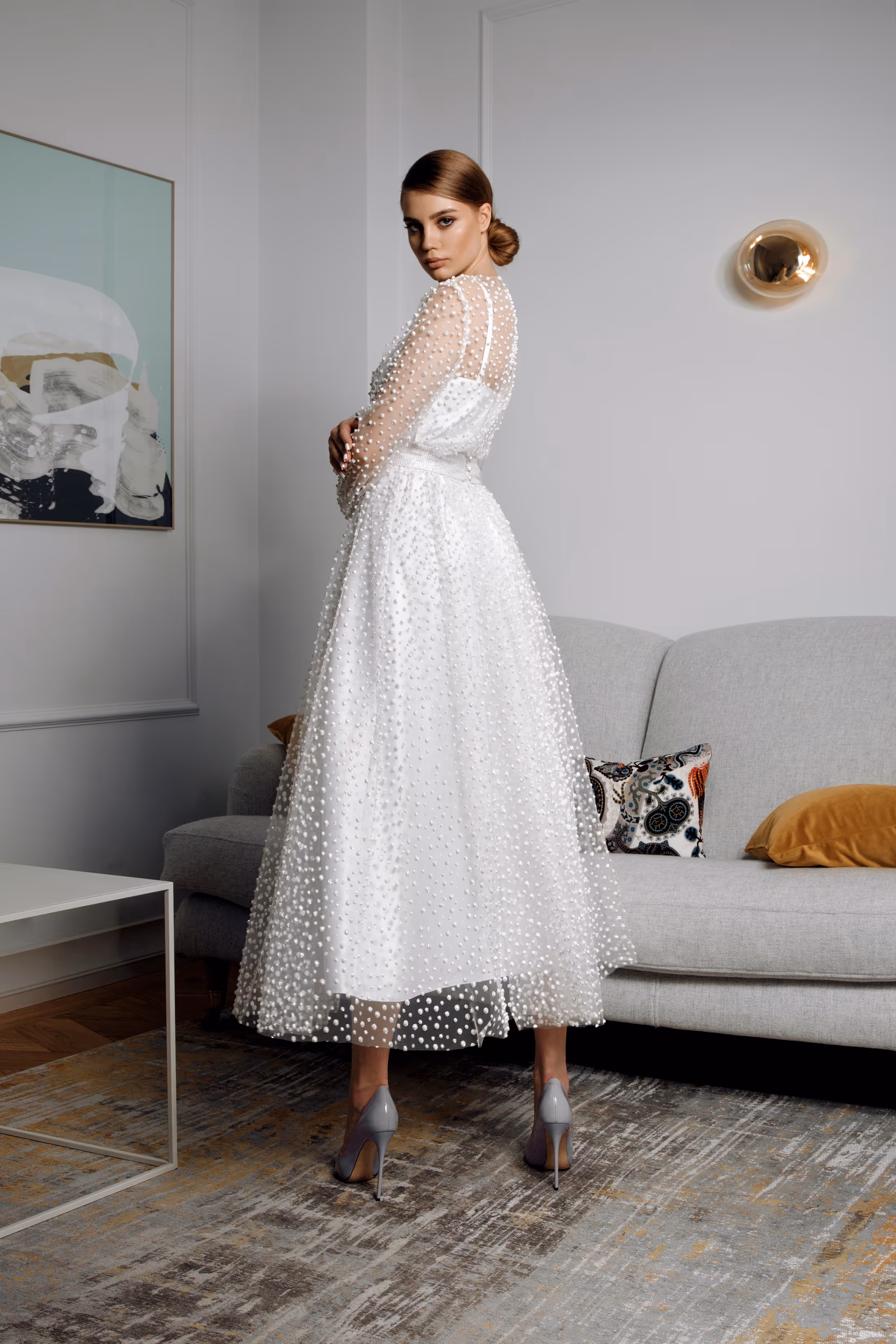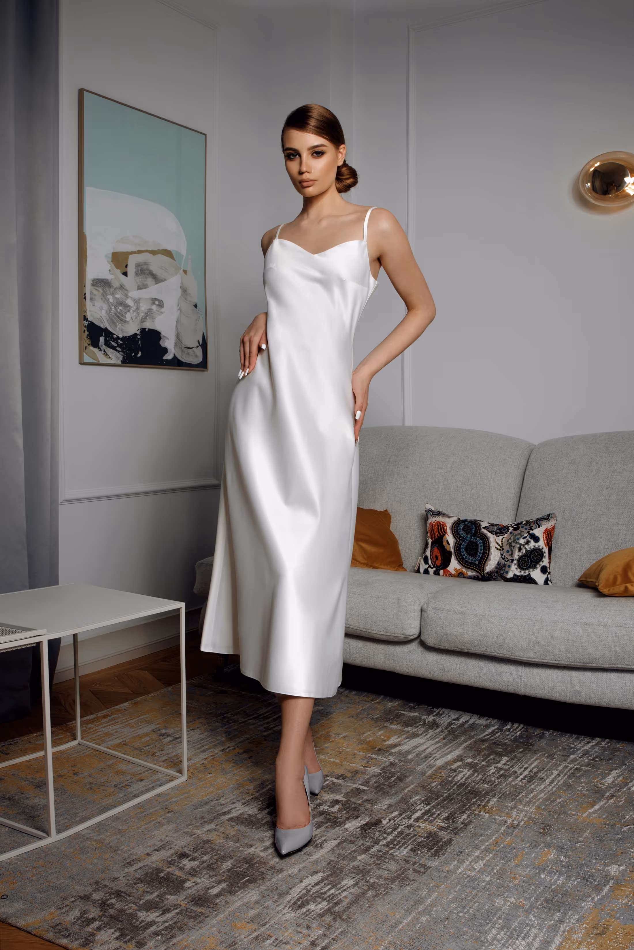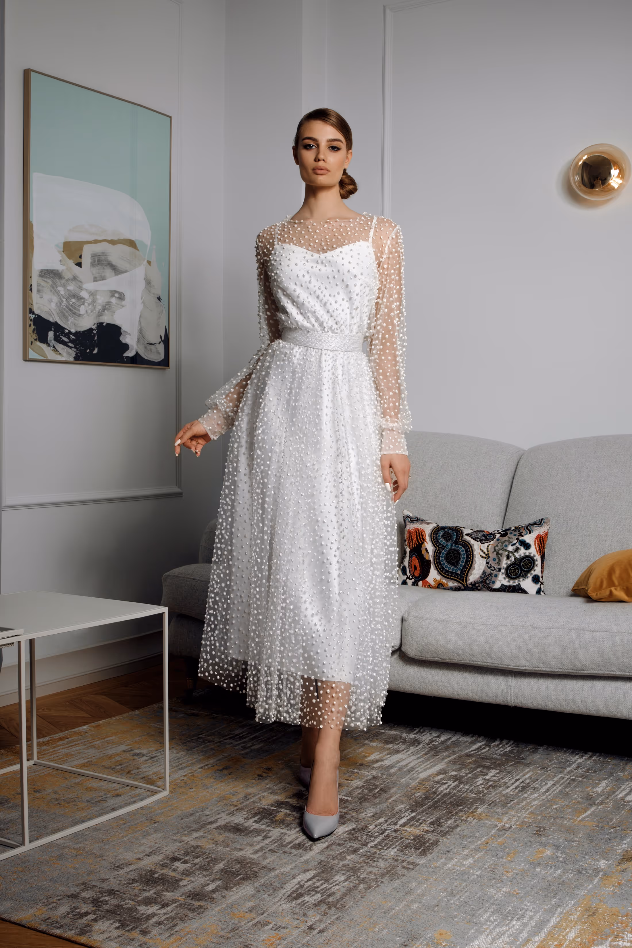 Ця ніжна сукня А-силуету має прямий силует з витонченими брительками та мереживною накидкою, яка додає нотку романтики. Знімна мереживна шаль трансформує вигляд, надаючи унікальність для різних випадків.
