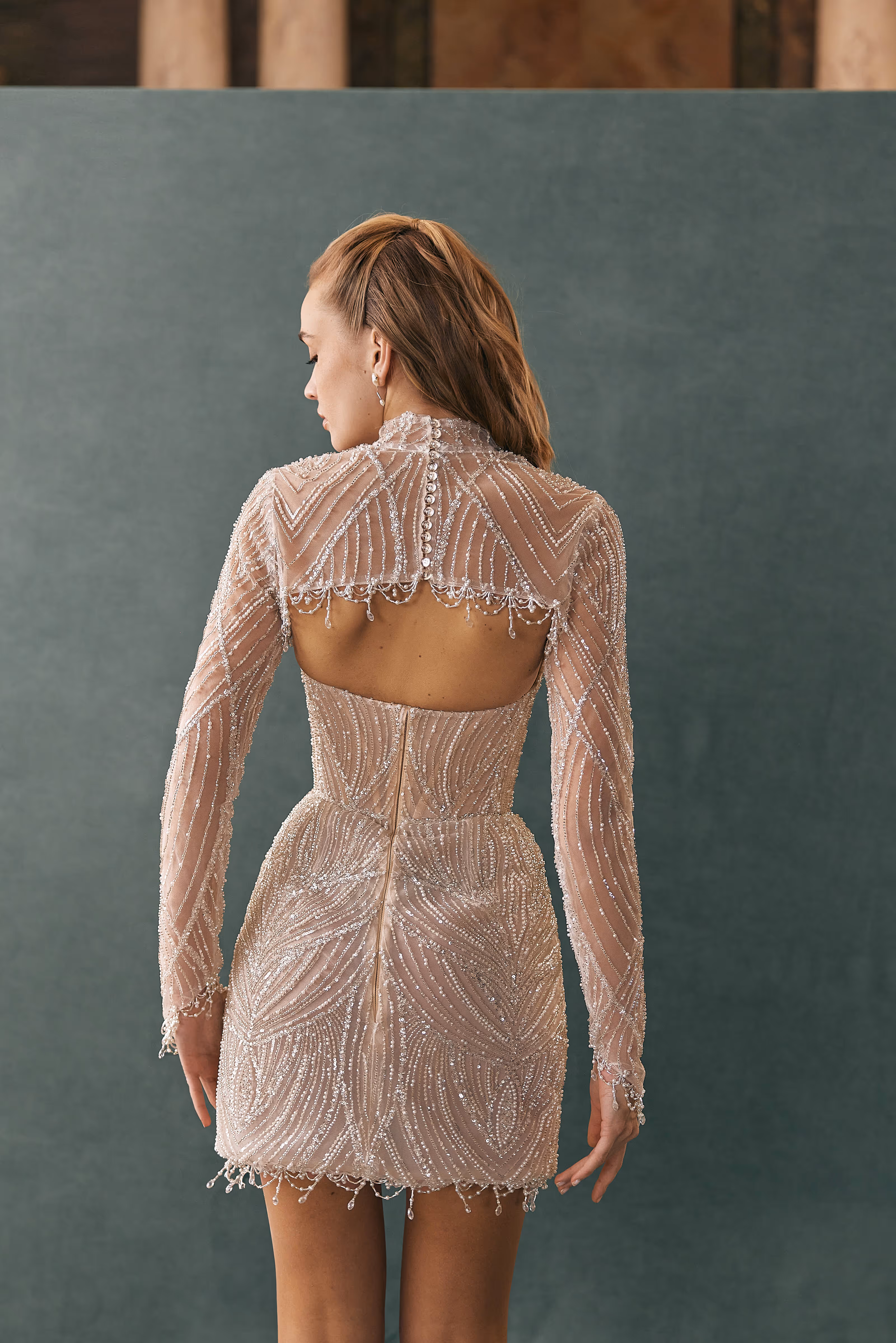 Чарівна мереживна міні-сукня, що ідеально підкреслює фігуру. Корсет із подвійними загостреними чашечками та V-подібною лінією талії створює витончений і елегантний силует. Декор додає розкішного акценту, а знімне мереживне болеро з довгими рукавами та ґудзиками на спинці додає образу вишуканості. Сміливий, але водночас елегантний вибір для сучасної нареченої.