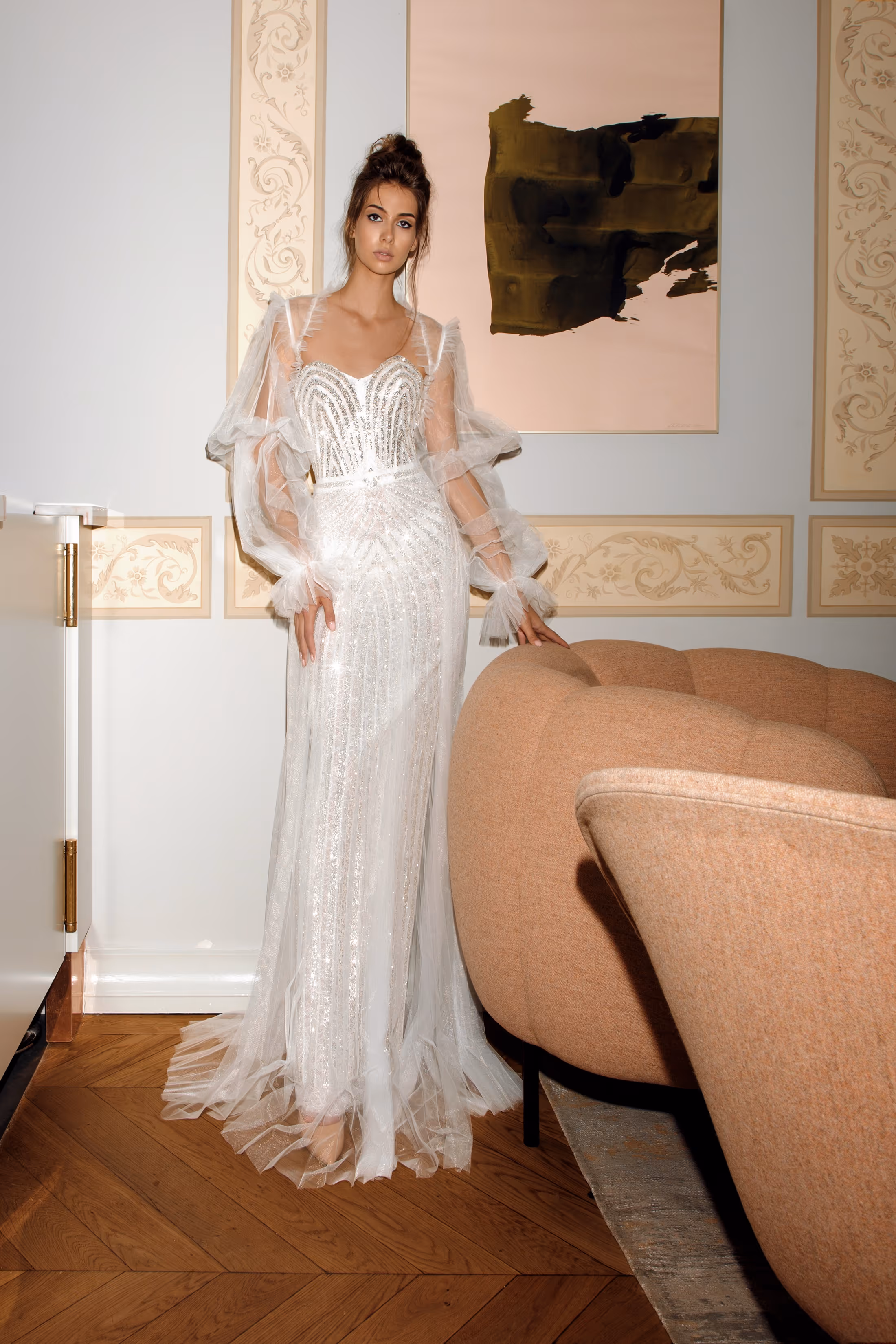 Ця захоплива сукня силуету рибка декорована блискучим мереживом, що додає образу шарму та вишуканості. Разом з болеро та відстібним шлейфом, які можна придбати окремо, цей комплект унікальний та елегантний для будь-якої нареченої.