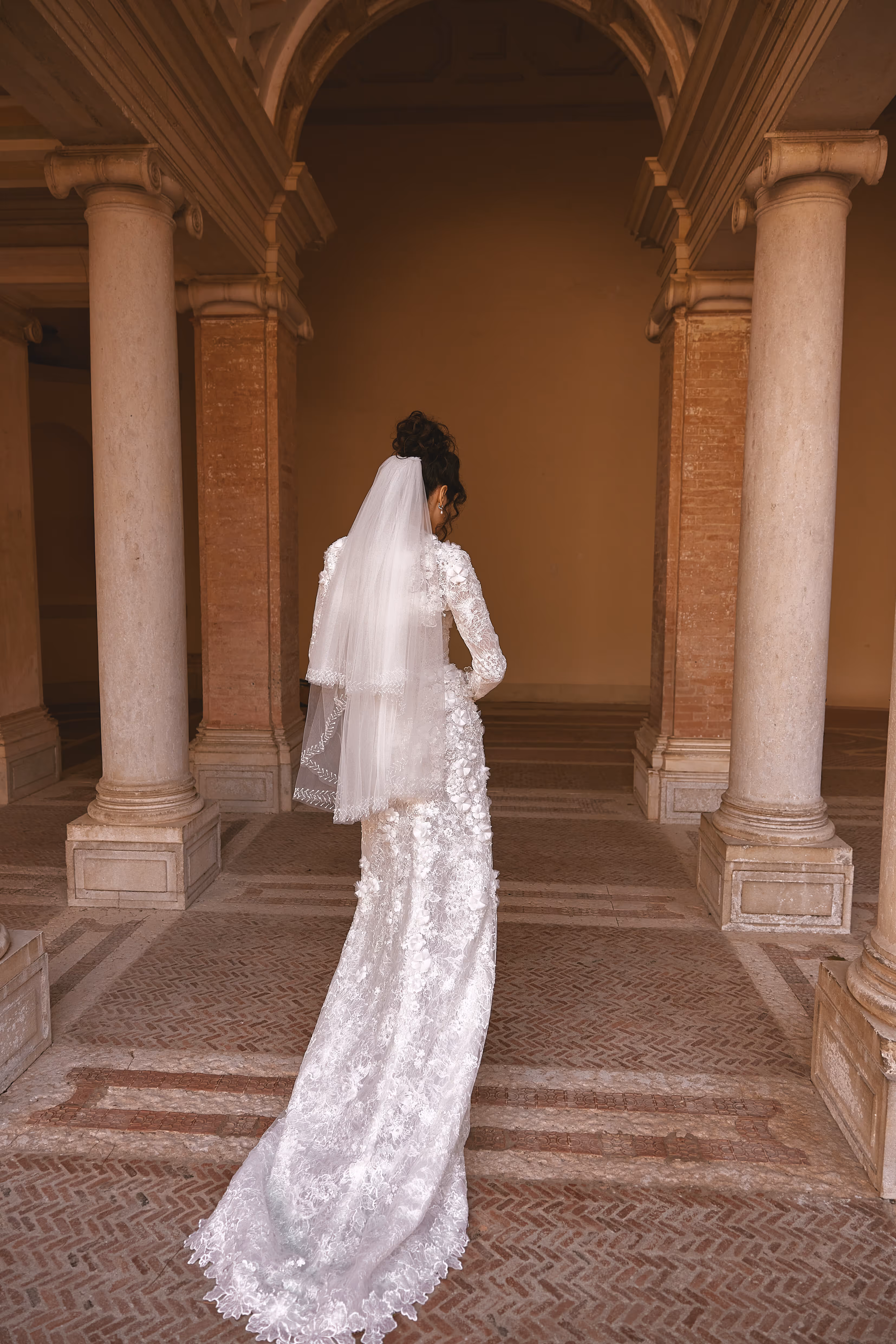 Поєднання елегантності та універсальності — ця мереживна сукня силуету "рибка" є справжнім шедевром. Вишуканий крій доповнений стильним розрізом на спідниці, який додає сучасного акценту до класичного дизайну. Витончені деталі підкреслюють красу сукні, а знімне болеро з довгим рукавом дозволяє створити два унікальних образи — класична вишуканість для церемонії та смілива витонченість для святкування.