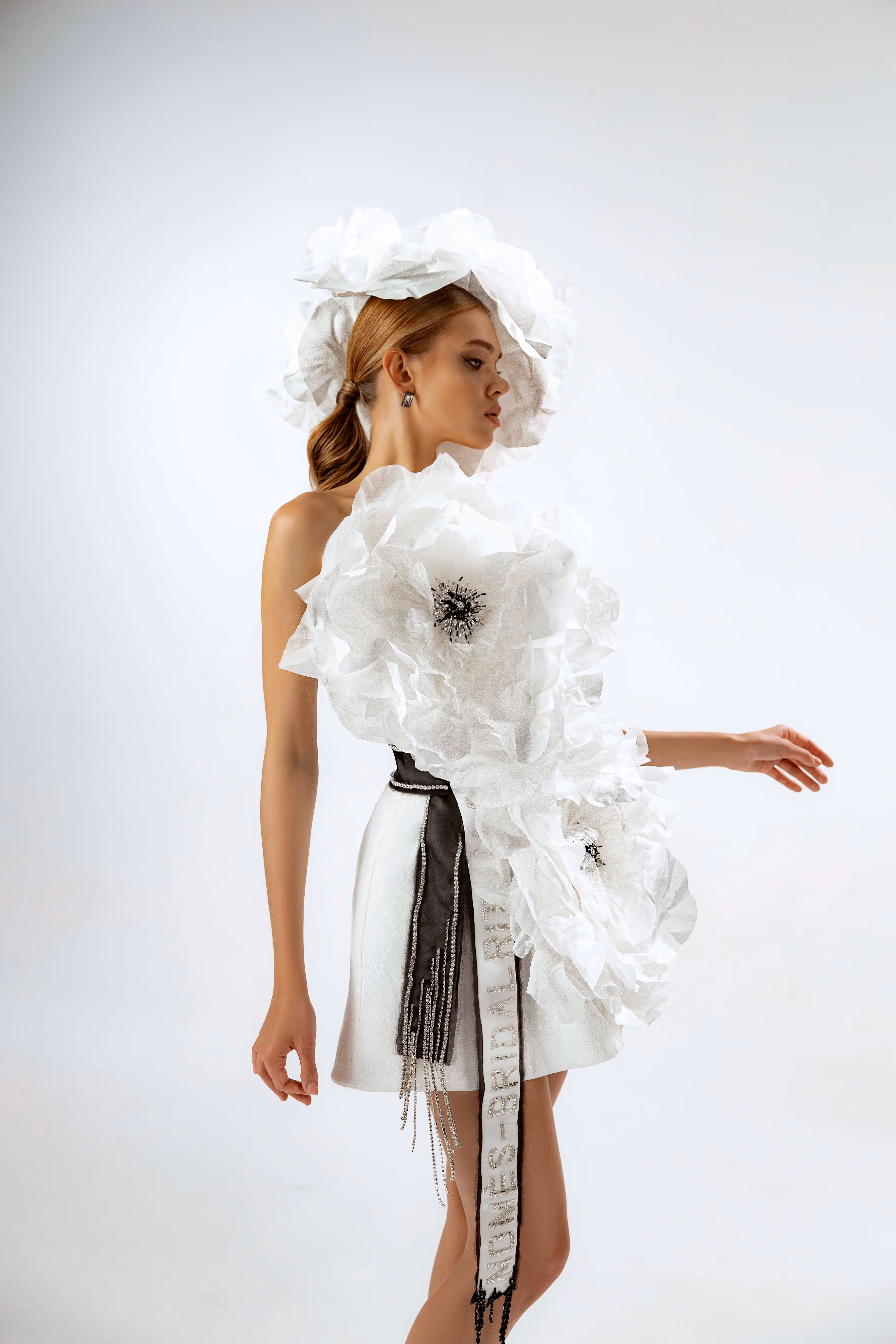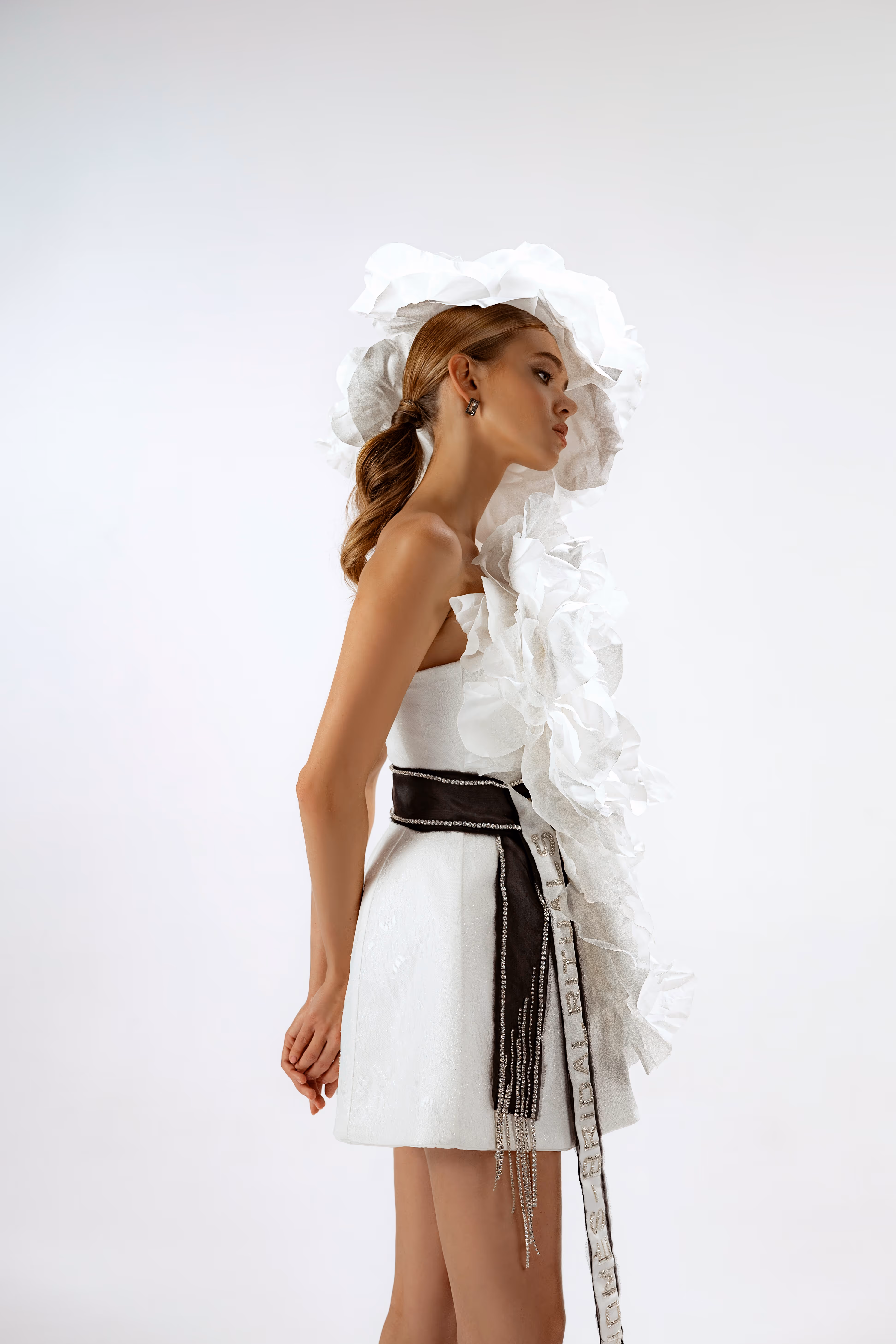 Ця весільна міні-сукня вражає своєю унікальністю та вишуканим дизайном. Вона має причіпний пояс, який підкреслює талію та додає елегантності образу. Дві акцентні квітки попереду надають сукні особливого шарму. Сукню доповнює капелюх-квітка, що завершує цей неповторний образ.