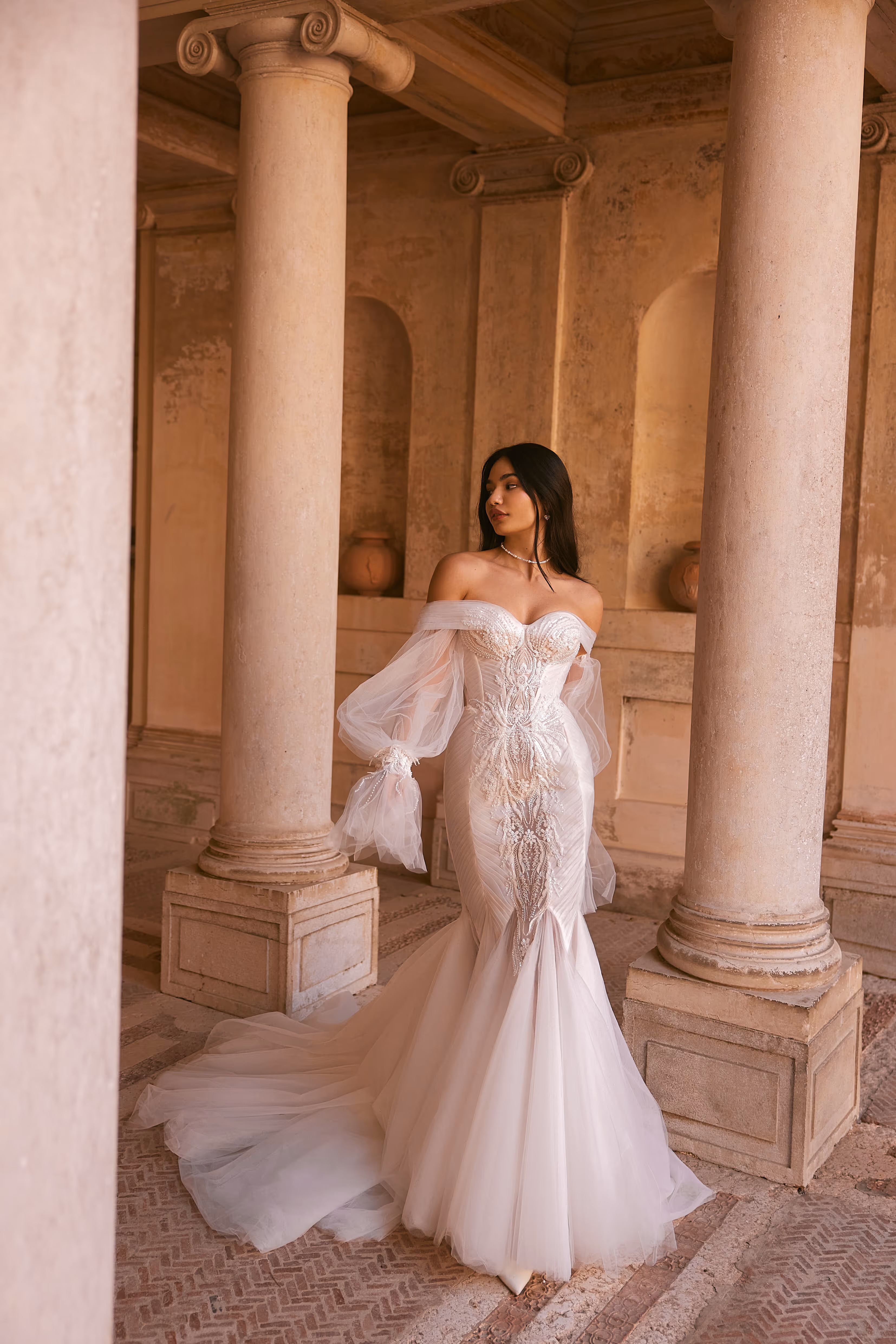 Пориньте у вічну елегантність із цією сукнею, драпірованою та прикрашеною ніжним мереживом, яке випромінює витонченість. Спадаючі плечі додають романтики, а довгий шлейф із клинами створює ефектний силует. Щоб додати образу розкоші, сукня комплектується об'ємними рукавицями, які підкреслять вашу унікальність у найважливіший день.