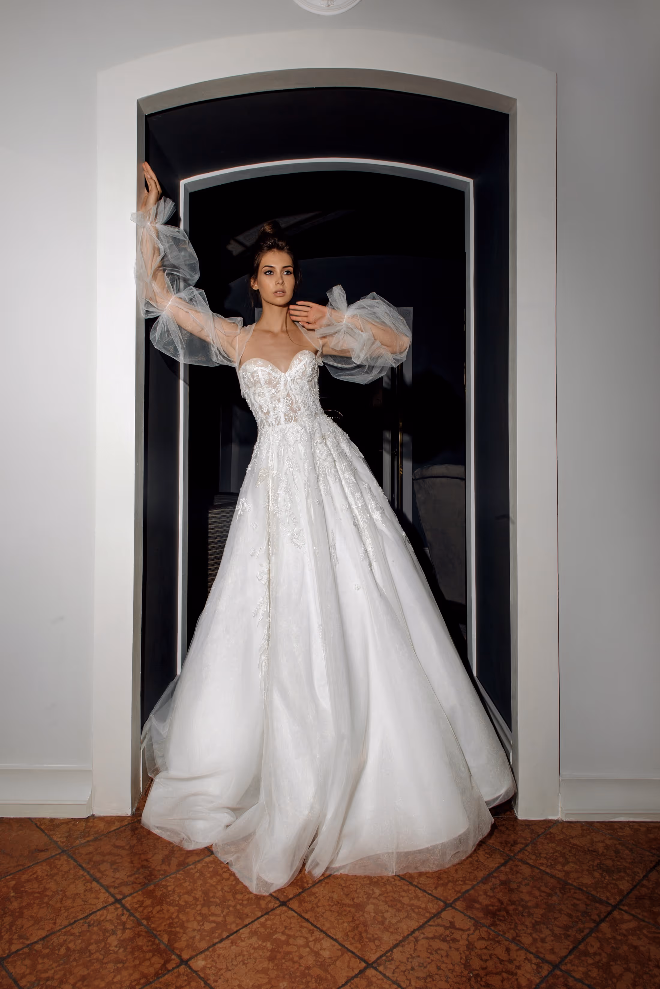 Ця розкішна вечірня сукня має довгий шлейф, який гармонійно поєднується з витончено декорованим корсетом з мережива, що спускається від талії по спідниці. Для завершення образу рекомендується додати болеро, яке додасть сукні додаткової вишуканості.