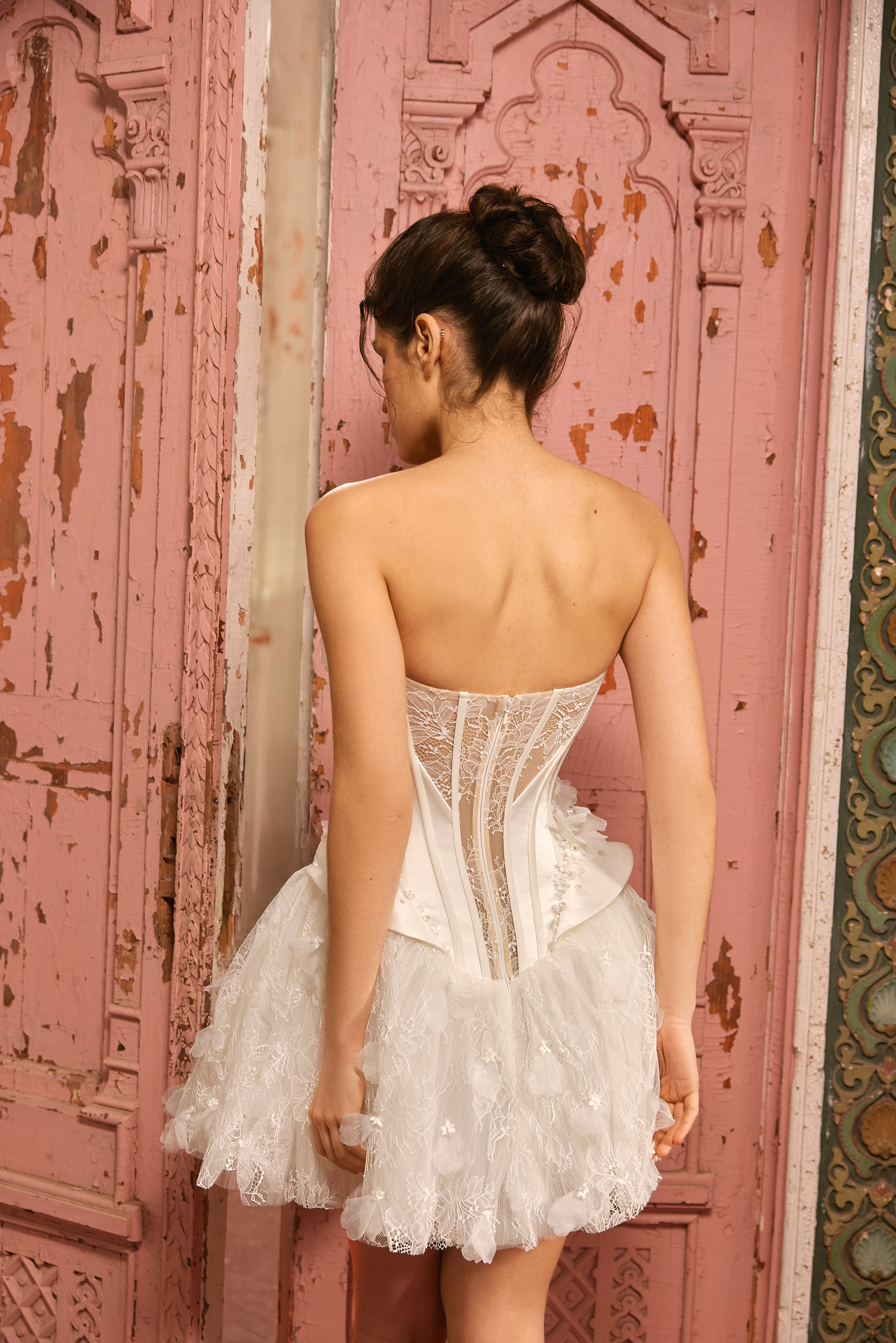 Ця міні весільна сукня з мікадо поєднує архітектурну форму та витончену деталізацію. Понижений корсет з драпіруванням на чашечках формує чіткий силует, а вставки з мережива шантиль додають образу легкості та мʼякості.