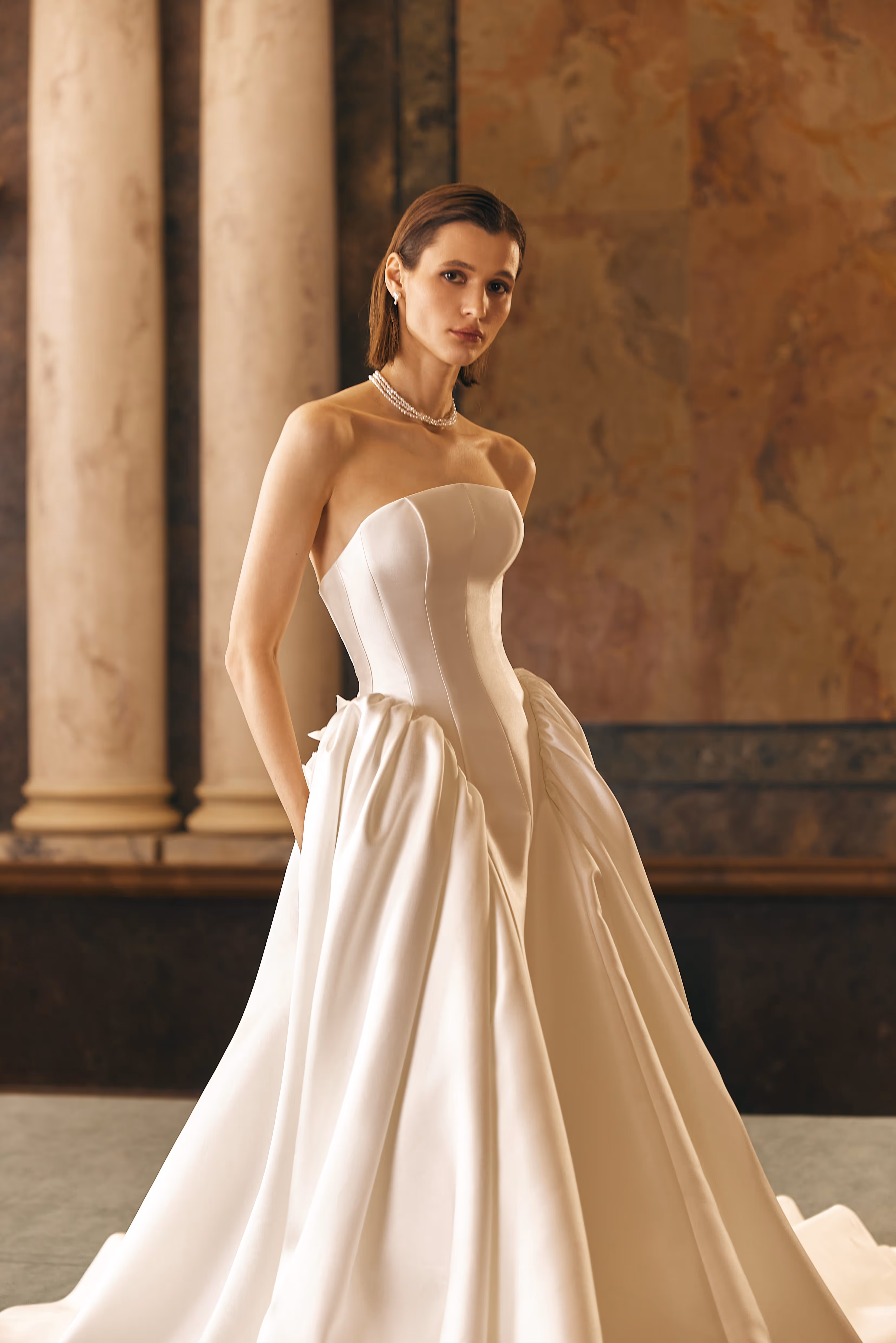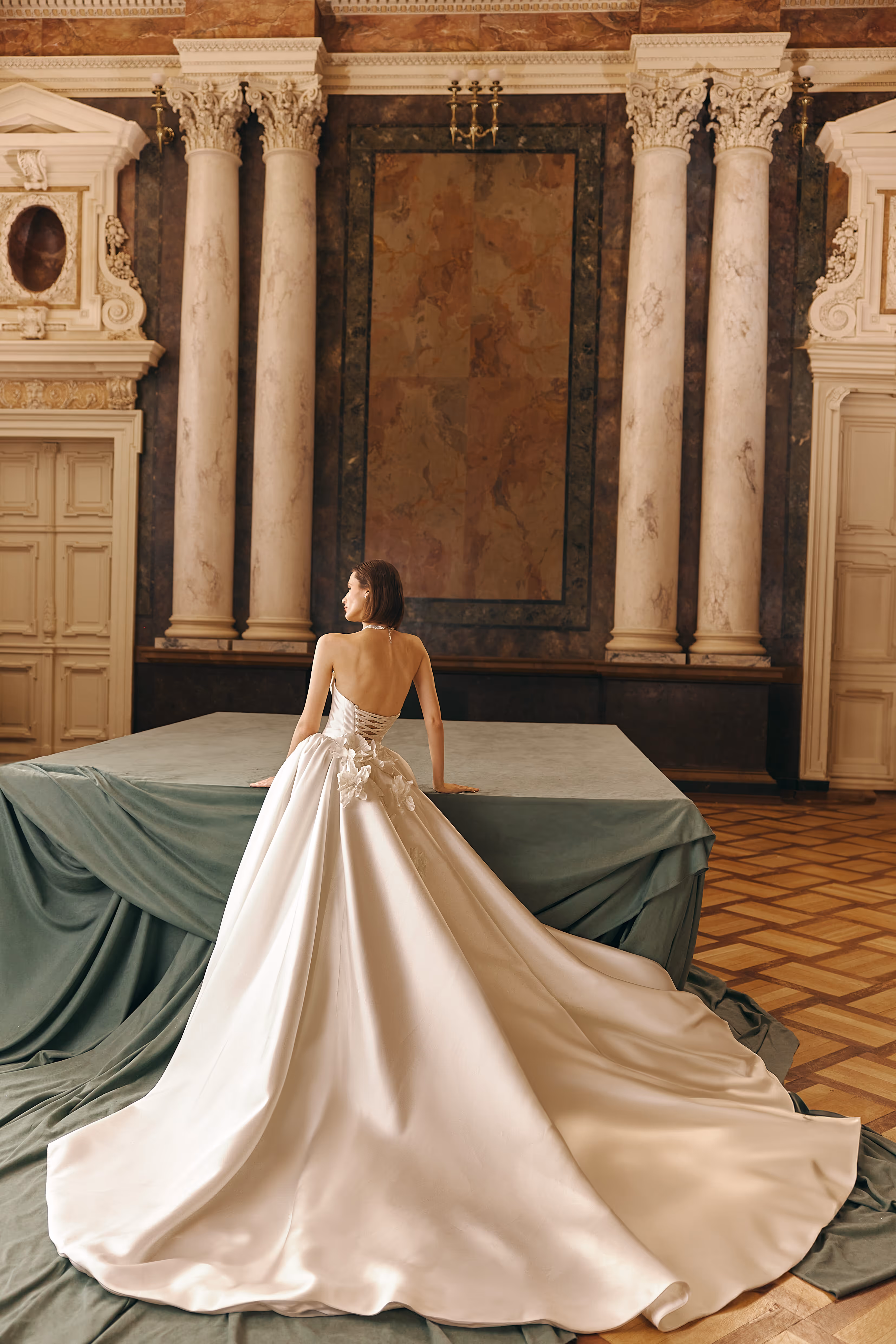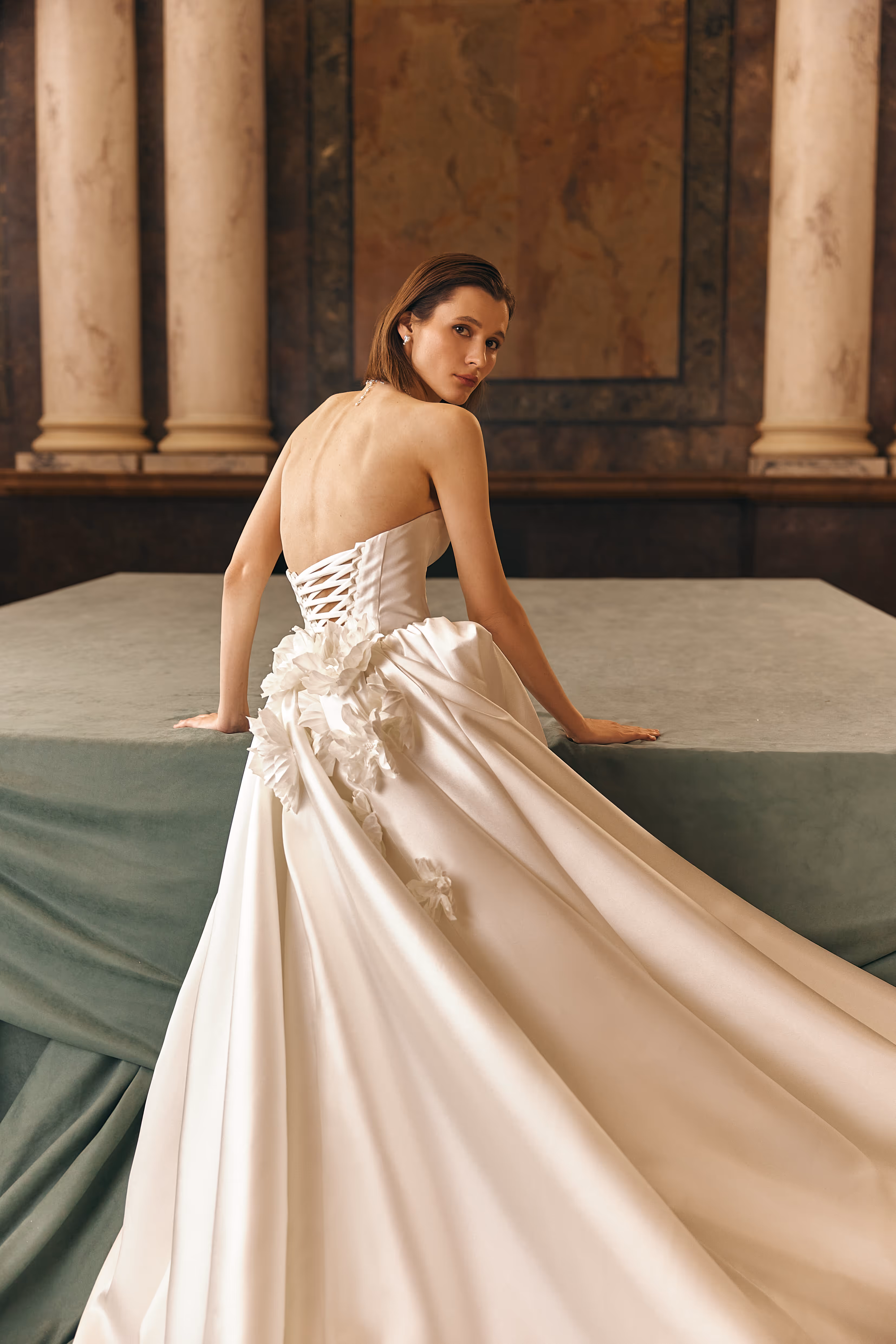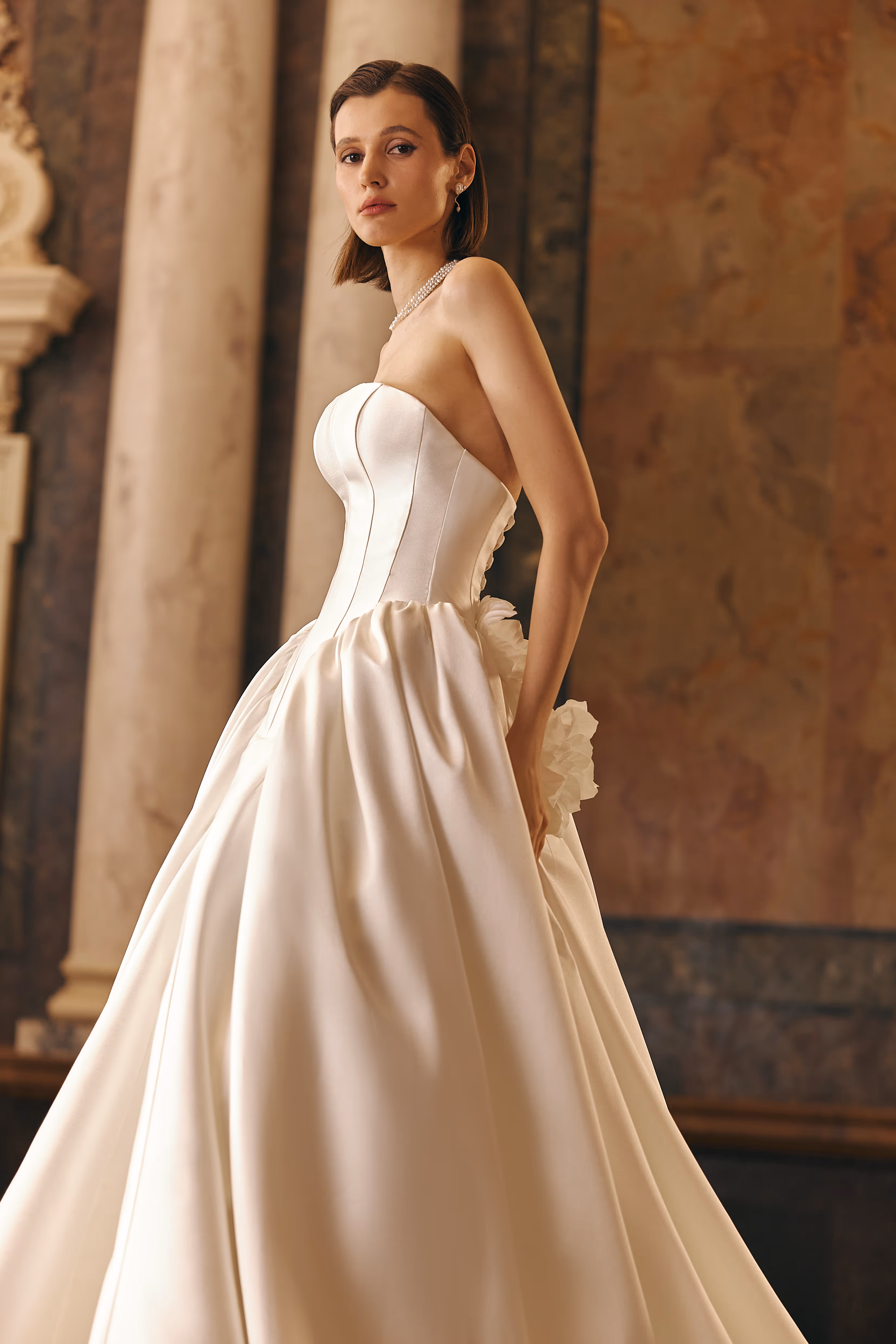 Велична весільна сукня з розкішного мікадо, з пониженим корсетом і витонченим прямим кроєм спереду. Об’ємна спідниця розширюється з боків і позаду, прикрашена ніжними квітковими деталями, що додають чарівності. Пишний шлейф завершує королівський образ, створений для нареченої, яка прагне захоплювати.