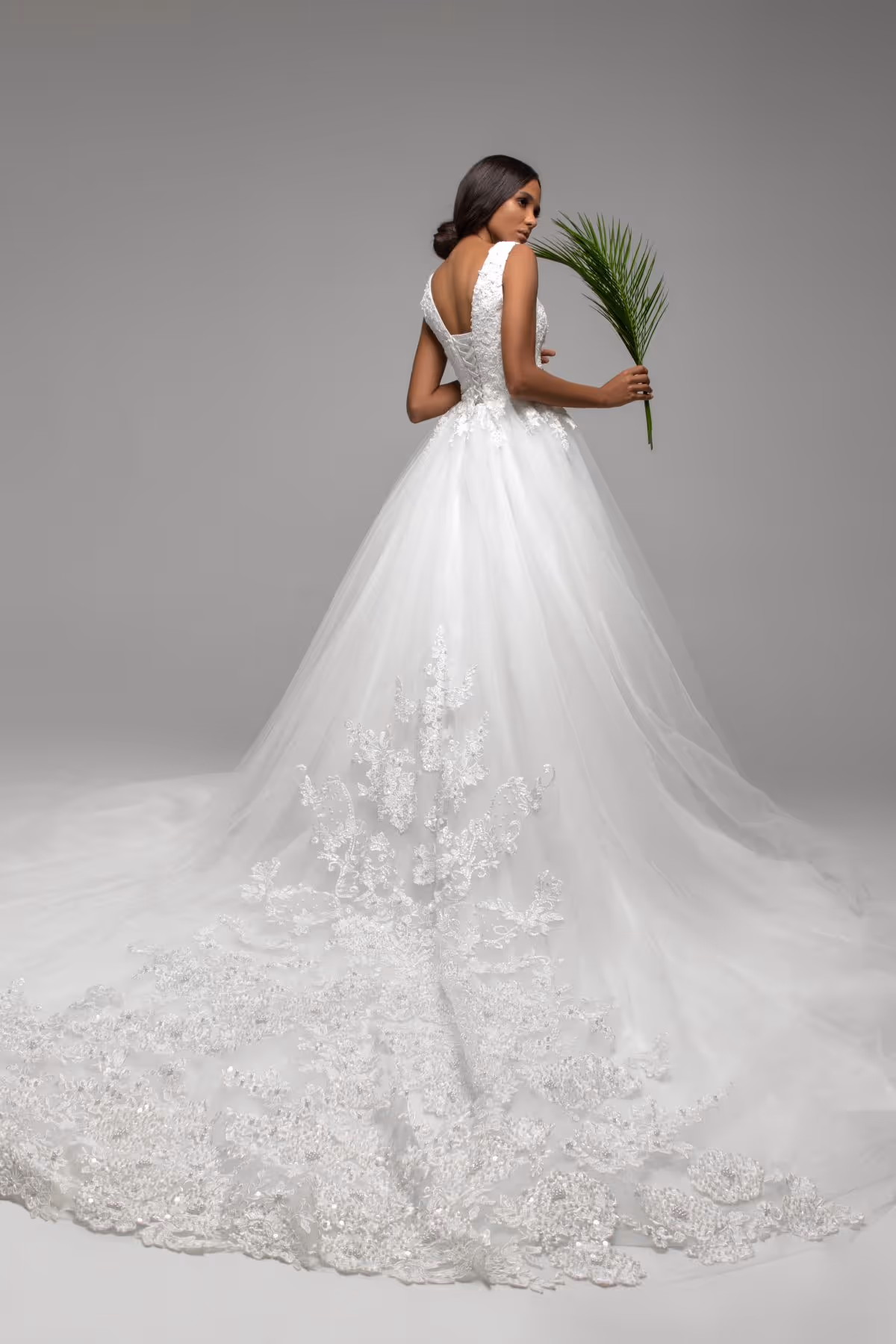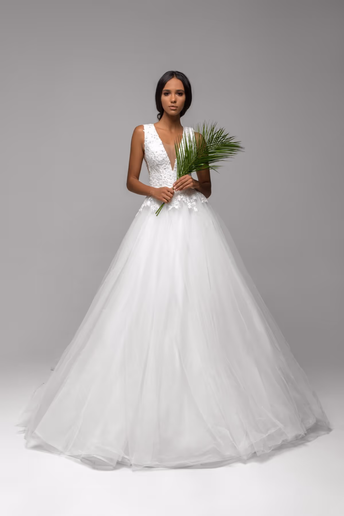 Cукня А-силуету вражає своїм чудово декорованим корсетом та шлейфом, що виражає елегантність та вишуканість. V-подібний виріз додає дотику спокуси до класичного силуету, роблячи його ідеальним вибором для сучасної нареченої, яка прагне вічної грандіозності.