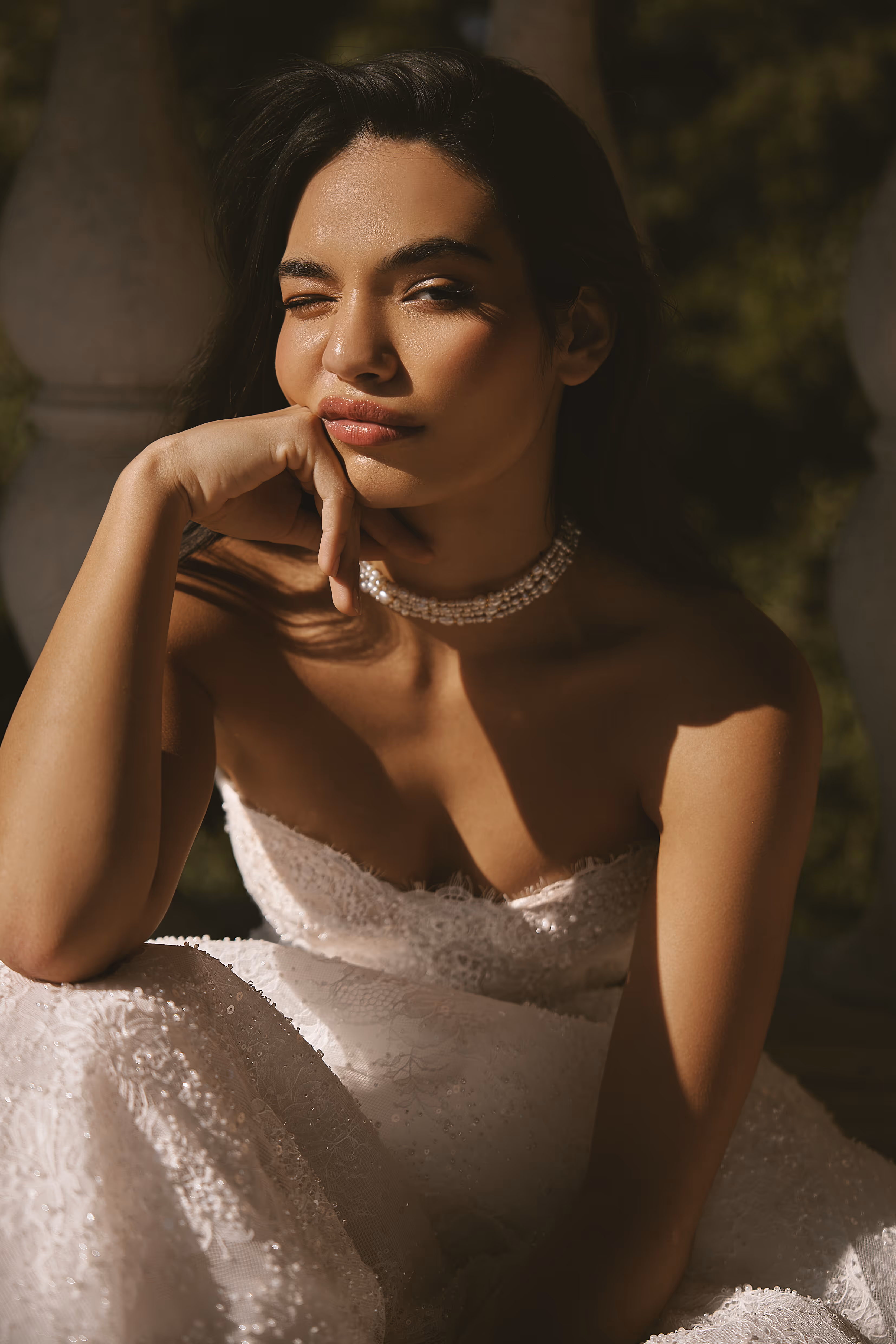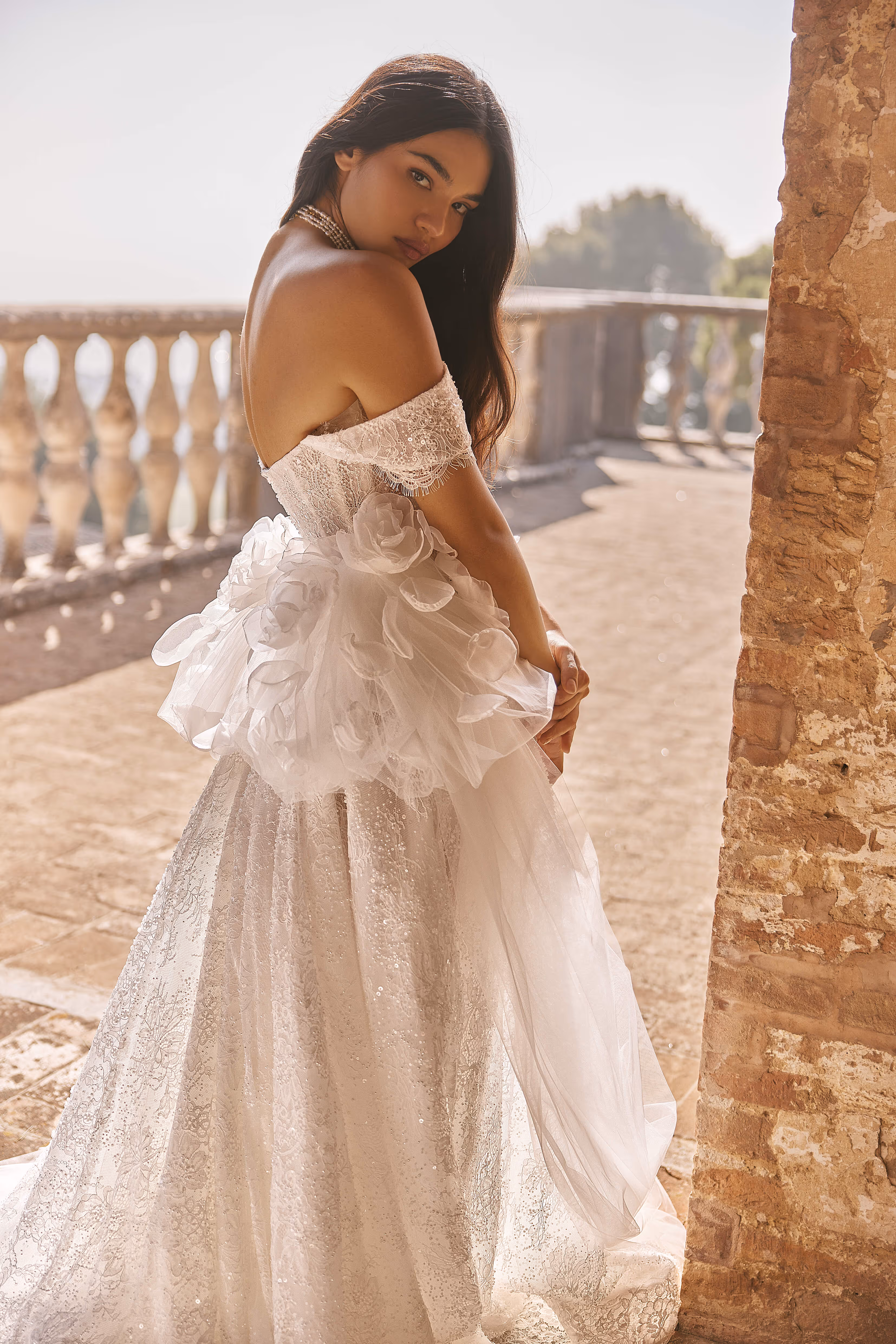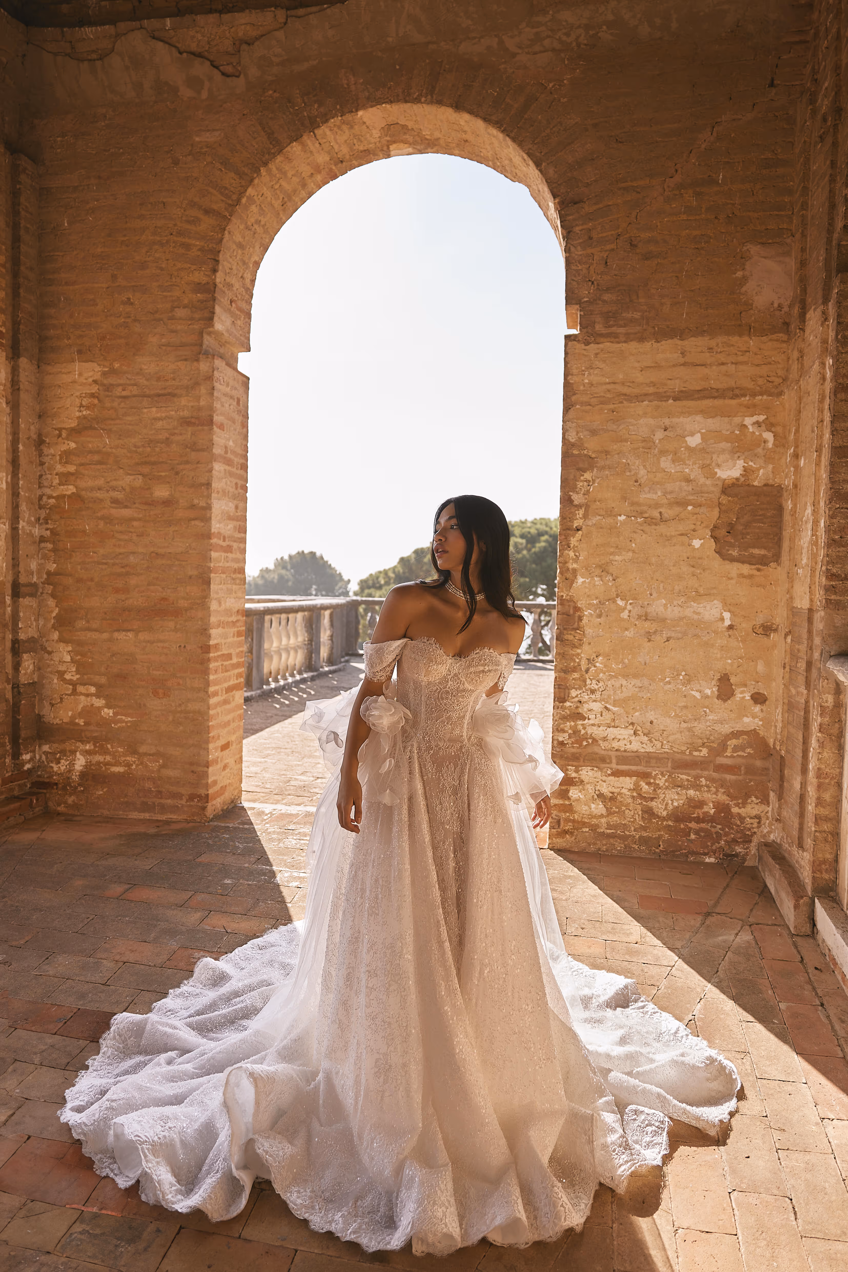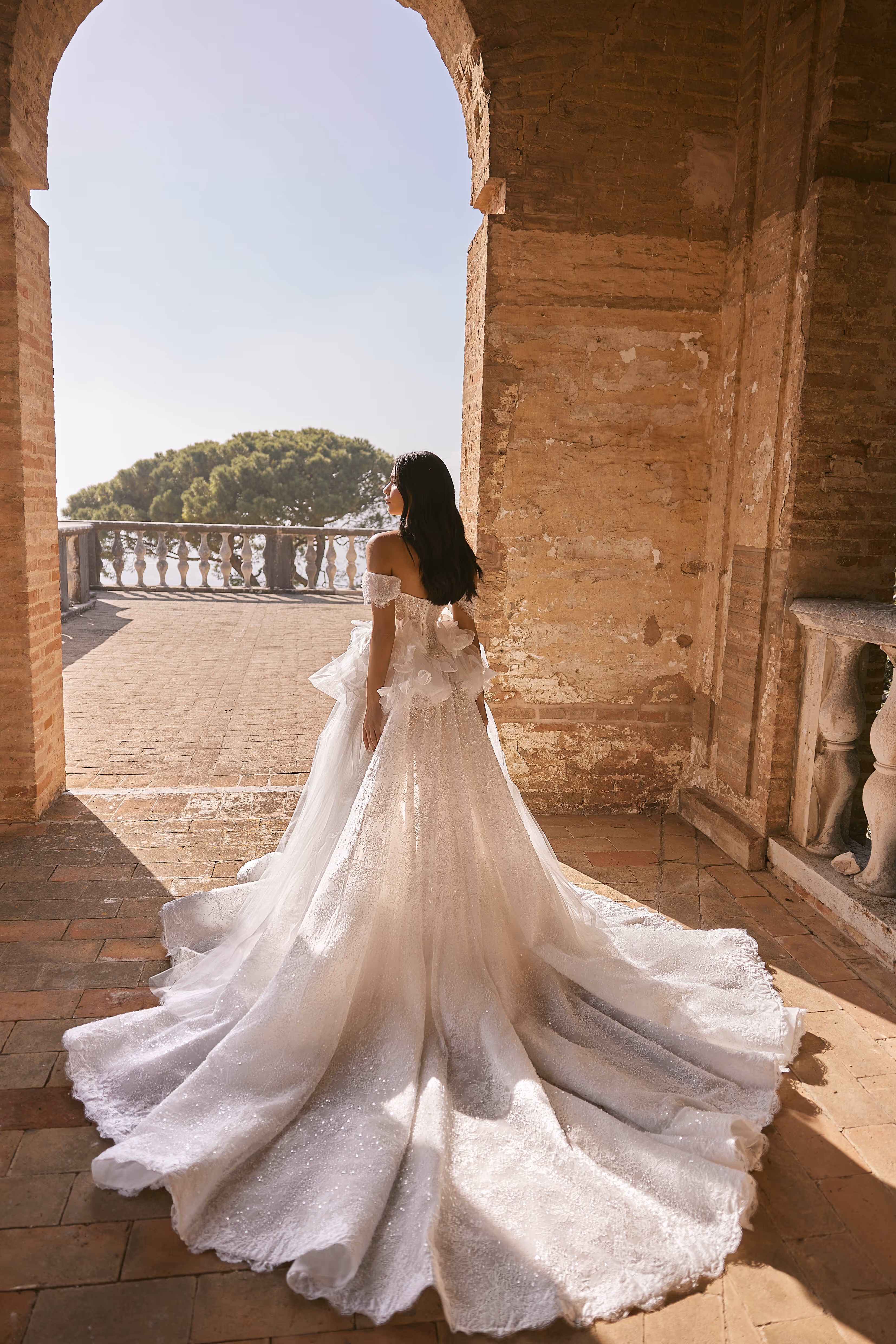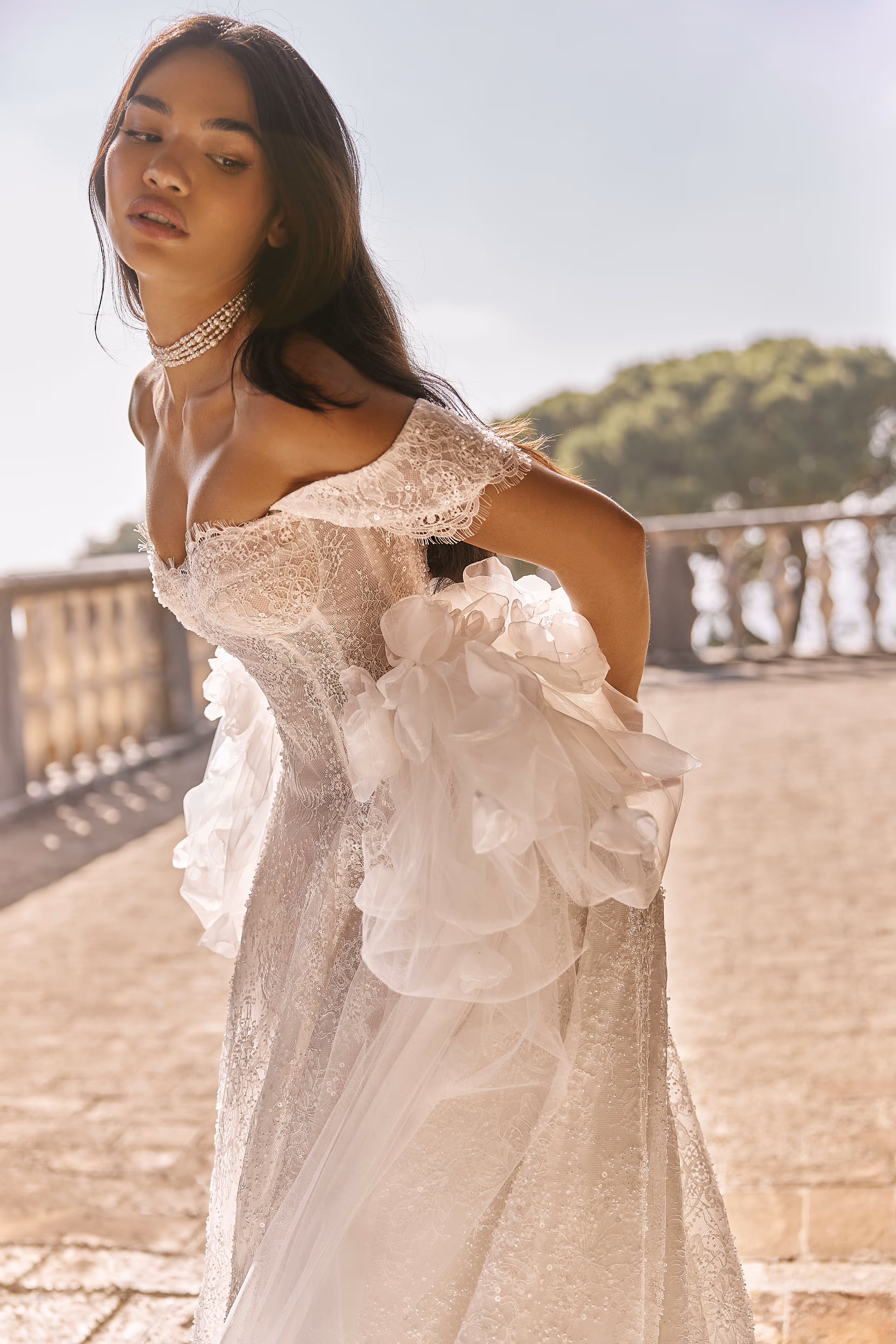 Зачаруйте витонченістю в цій сукні А-силуету з неповторного мережива шантильї. Спадаючі причіпні рукави додають образу романтики, а декоровані квітами причіпні елементи на спідниці створюють чарівний акцент. Довгий шлейф завершує композицію, даруючи образу розкіш та грацію.
