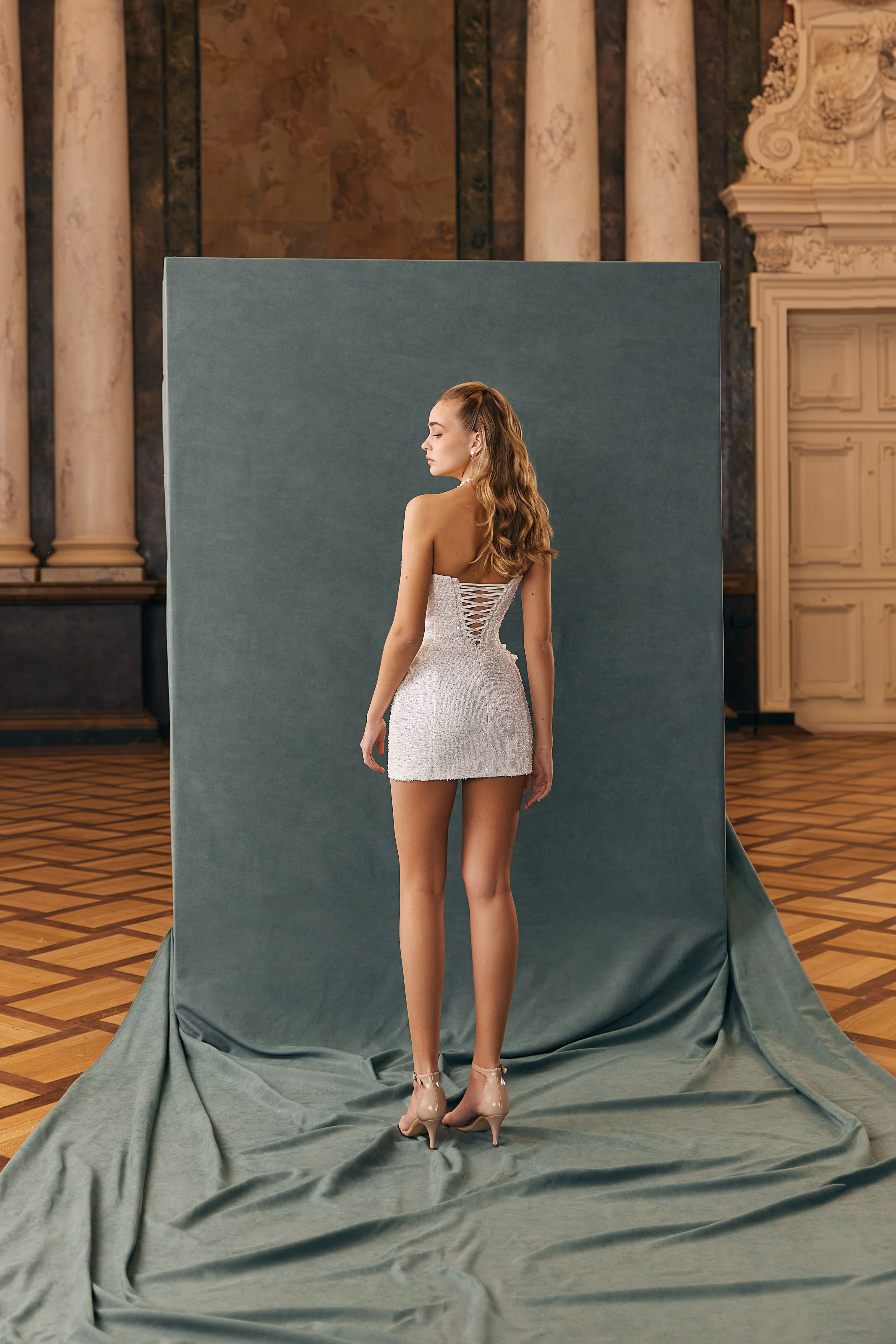 Блискуча міні-сукня, що ідеально підкреслює фігуру та мерехтить при кожному русі. Декорована ніжними квітами, вона поєднує в собі витонченість і чарівність. Сміливий, але водночас романтичний вибір для нареченої, яка хоче сяяти у свій особливий день.