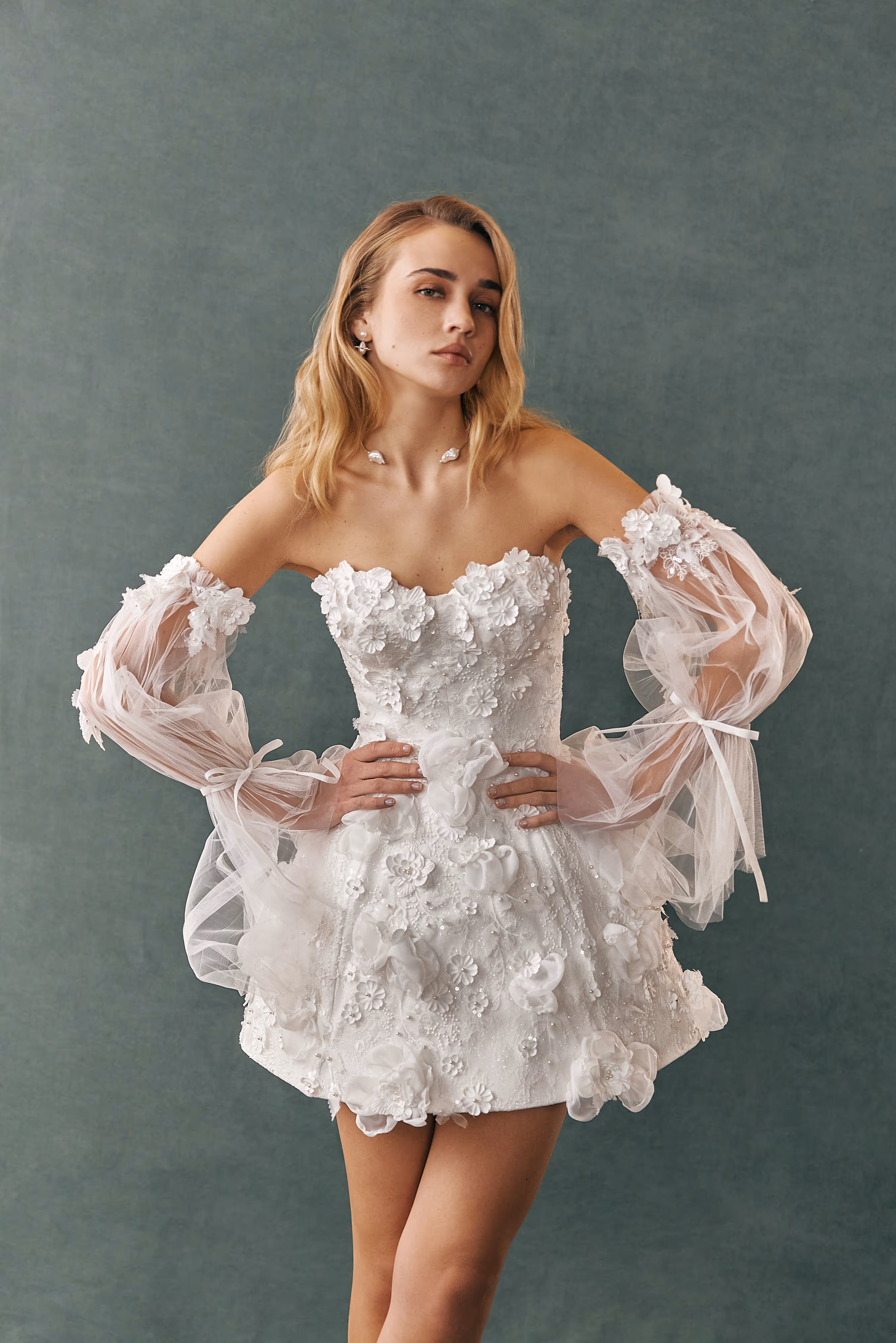 Ця розкішна міні-сукня з мережива поєднує вишуканий декор з ніжними деталями, створюючи чарівний та елегантний образ. Пишна спідниця додає образу драматизму та легкості, роблячи сукню поєднанням веселощів і вишуканості. Об'ємні рукавиці з декором можна носити окремо, що додає універсальності до образу. Ідеально для нареченої, яка хоче виразити свій унікальний стиль з сучасним, елегантним силуетом.