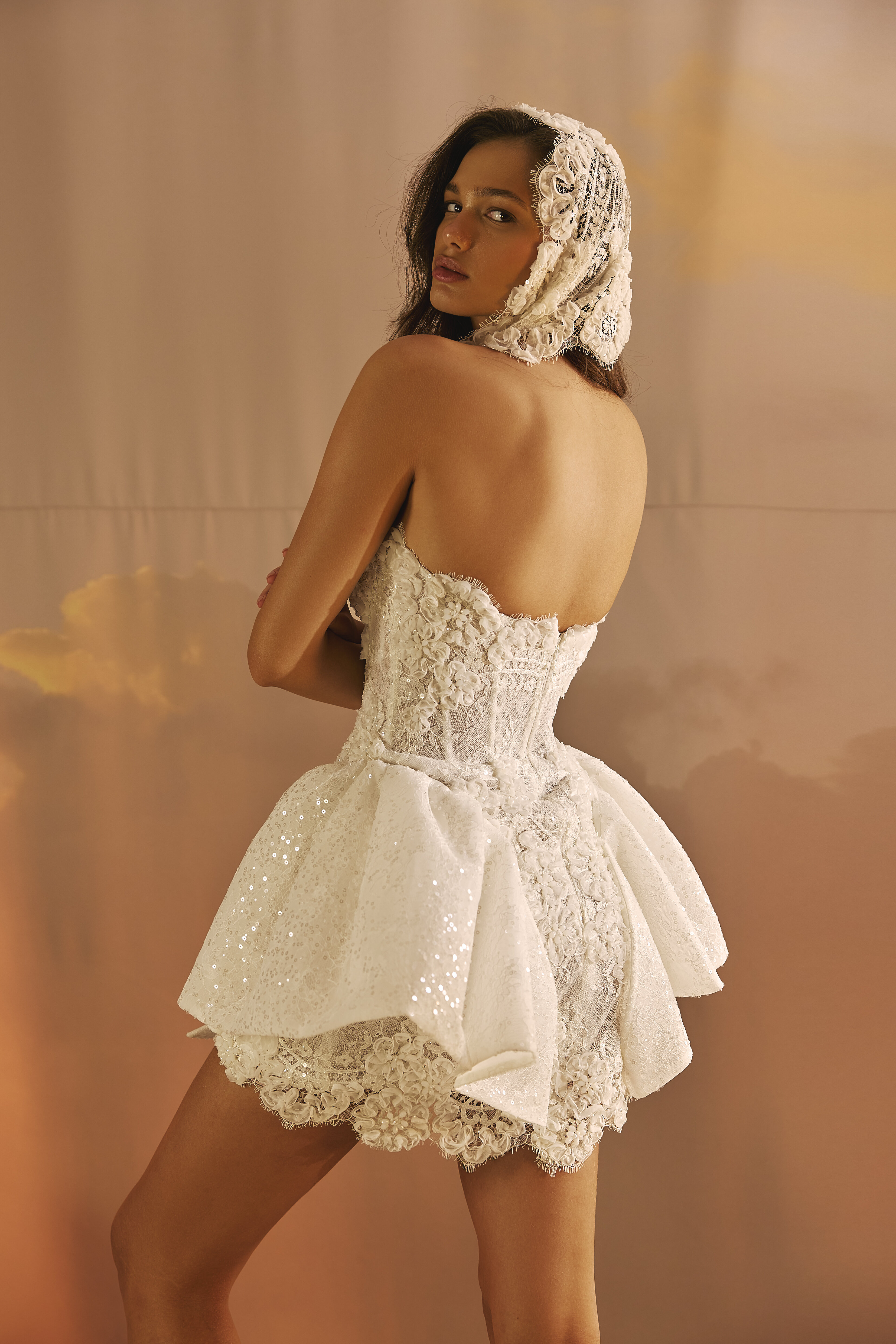 The detachable lace peplum adds dimension and versatility — easily transforming the look from graceful minimalism to grand sophistication.