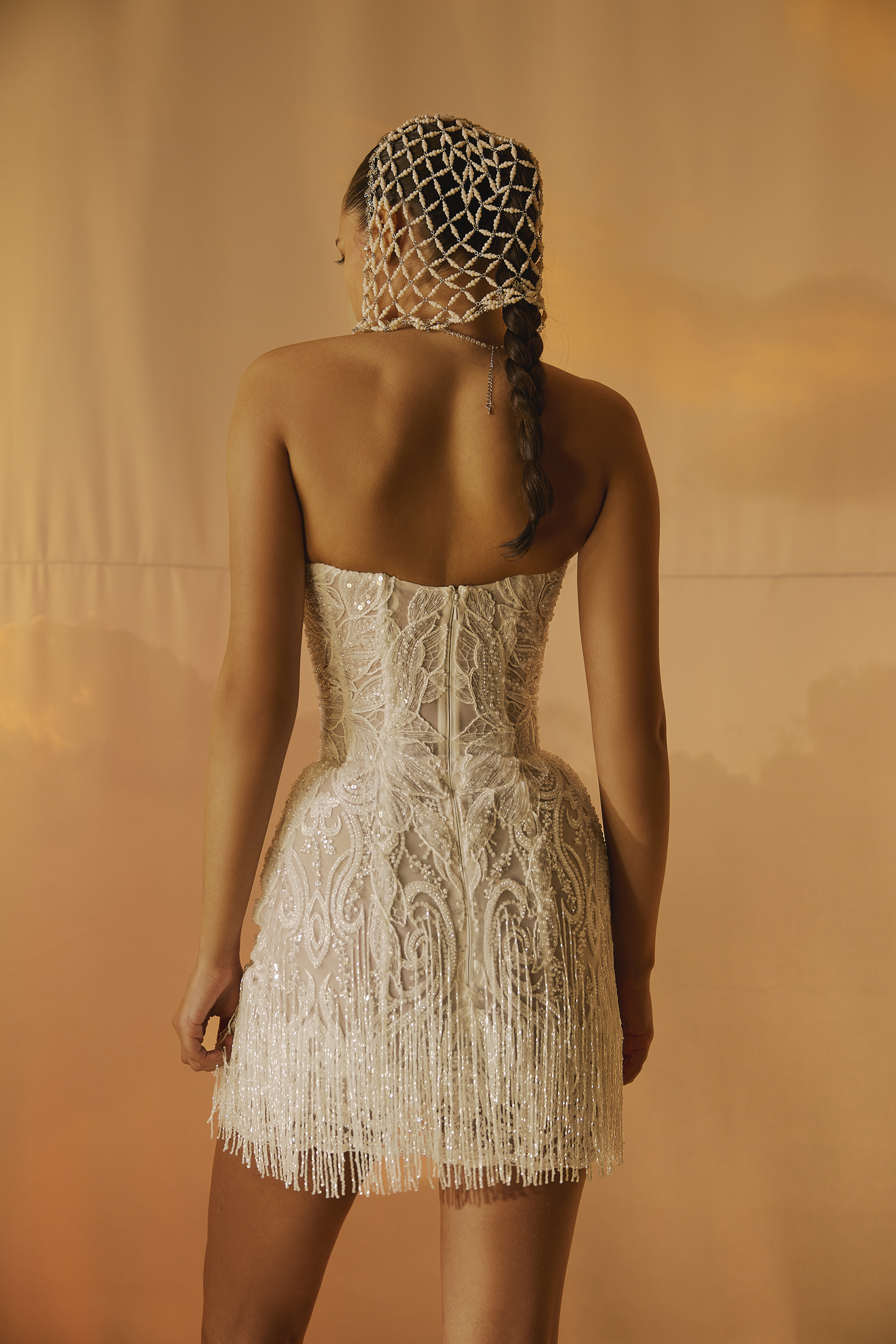 This fitted lace mini wedding dress beautifully contours the figure, while long lace fringes on the skirt create graceful movement.