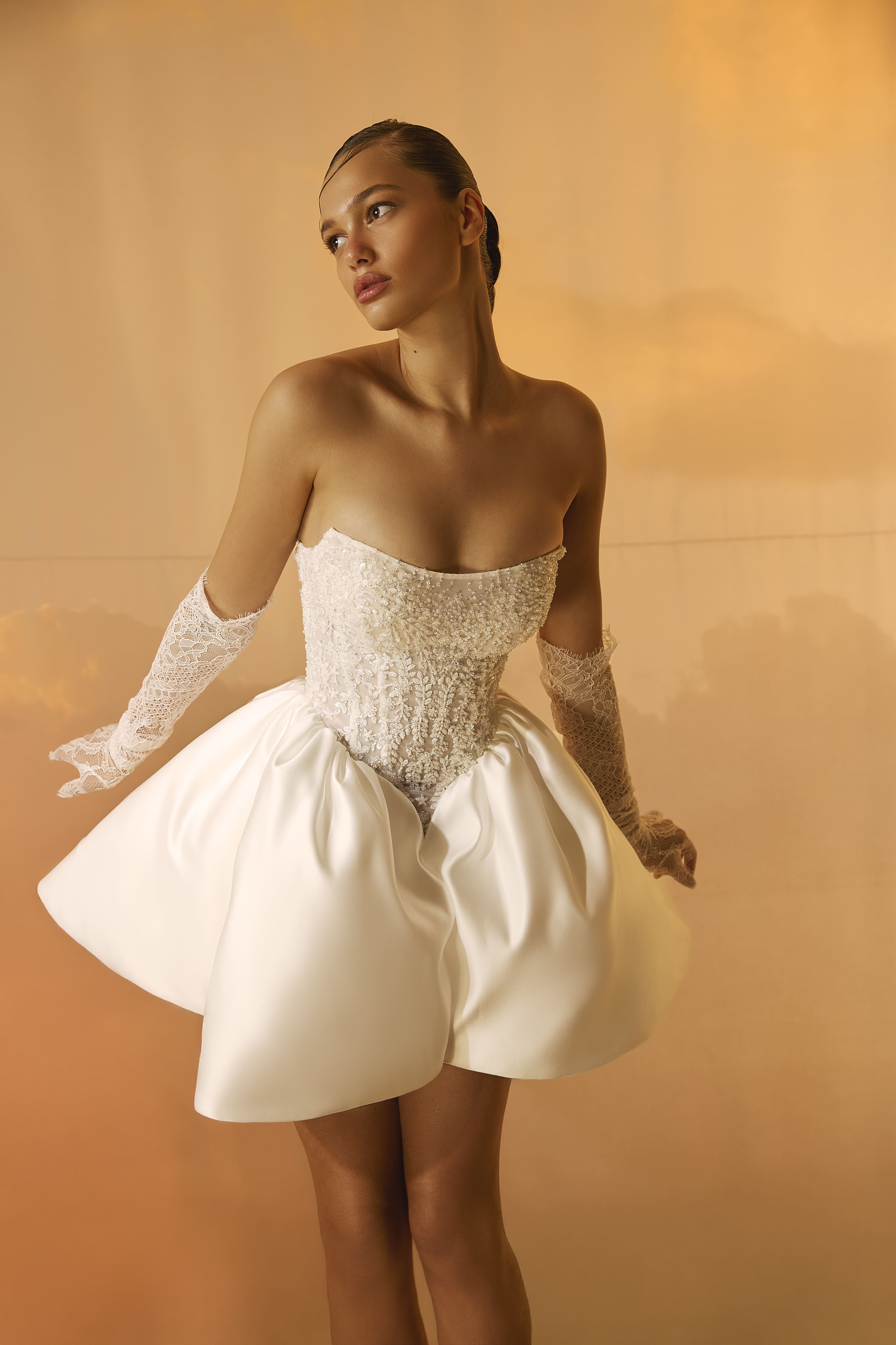 An additional satin corset with a voluminous train transforms the look — blending texture, contrast, and couture elegance.