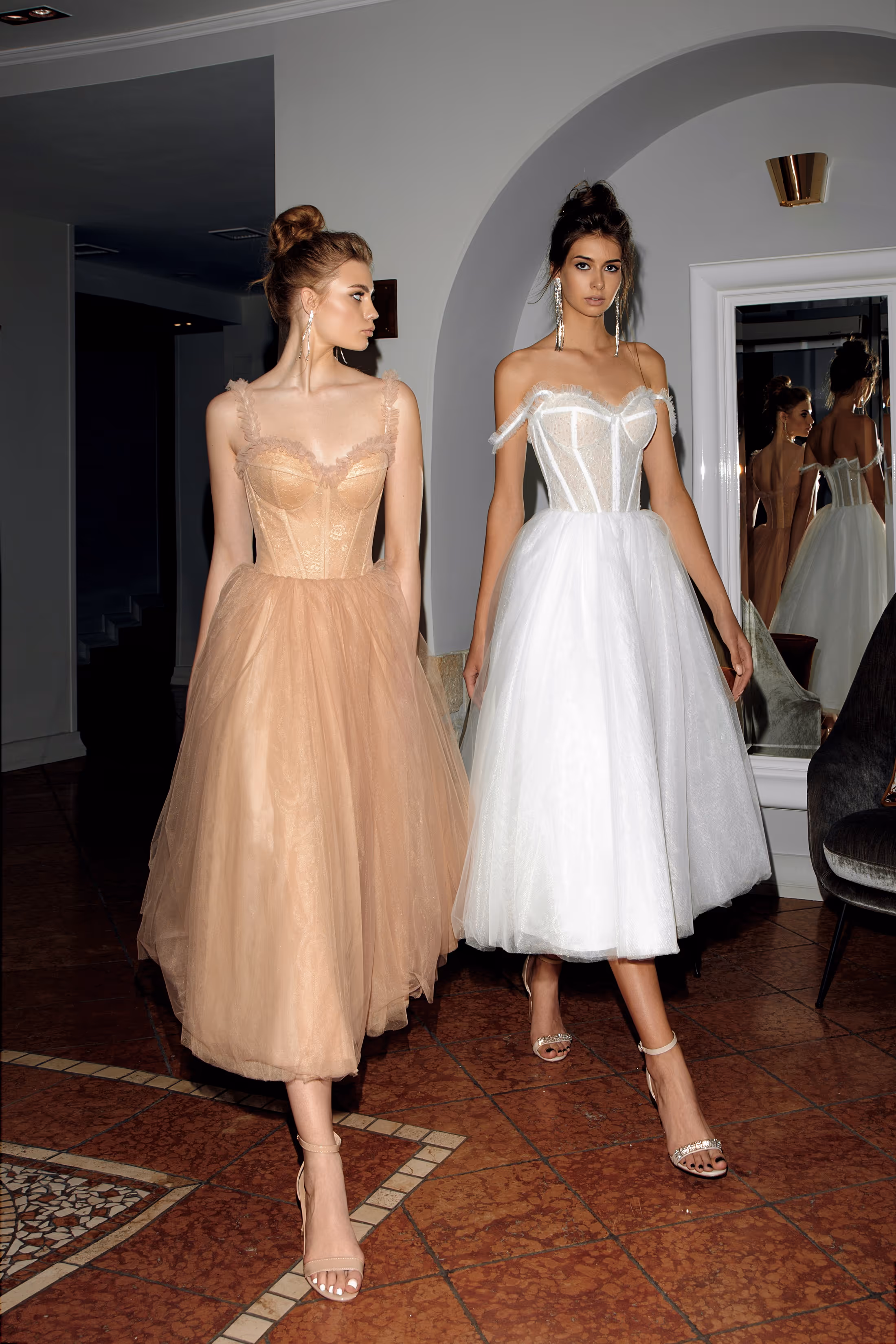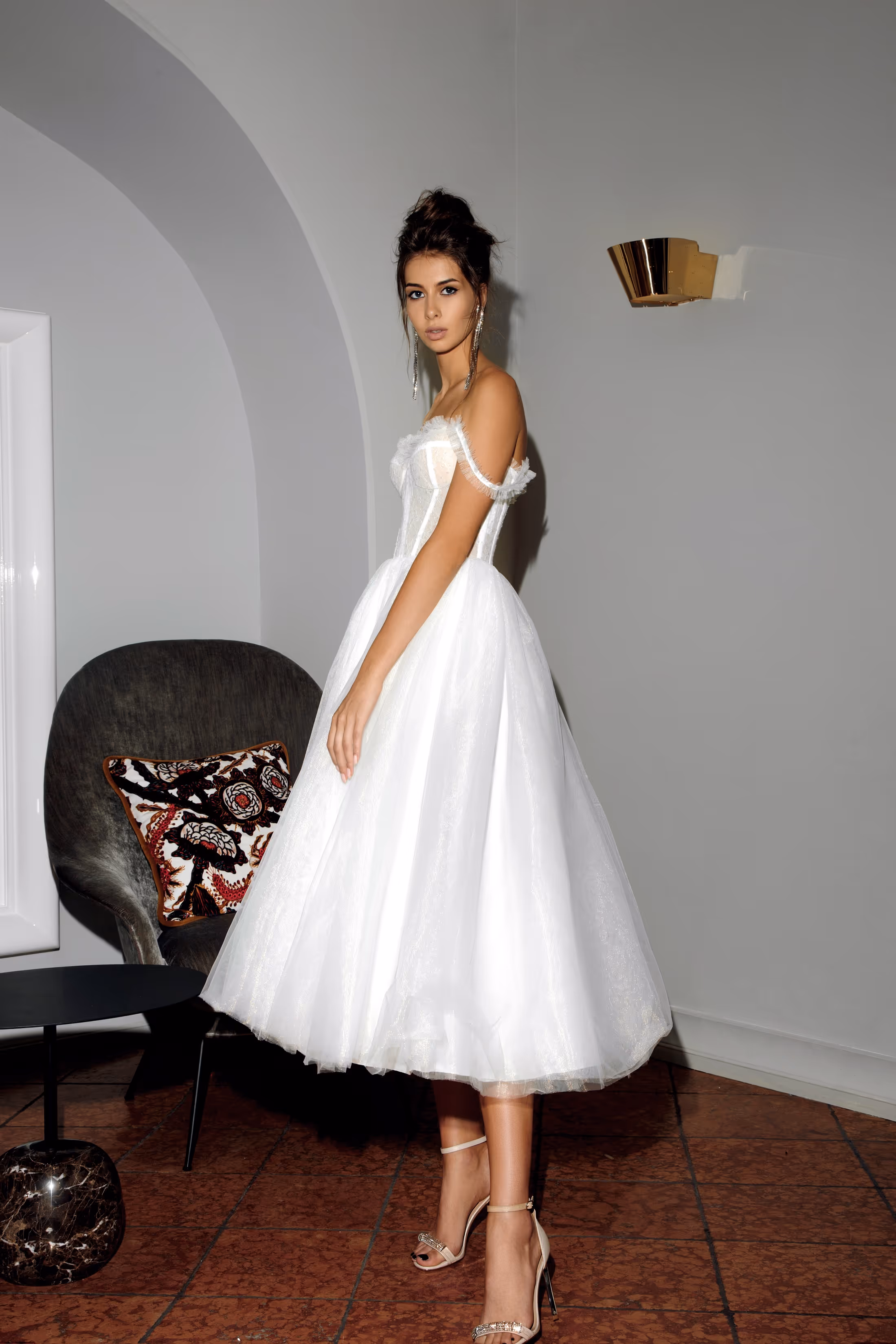 Midi-length dress features a sweetheart neckline corset and off-shoulder sleeves, exuding a blend of elegance and allure. The fitted bodice accentuates the figure, while the off-shoulder design adds a touch of romance, making it a perfect choice for a sophisticated yet enchanting look.