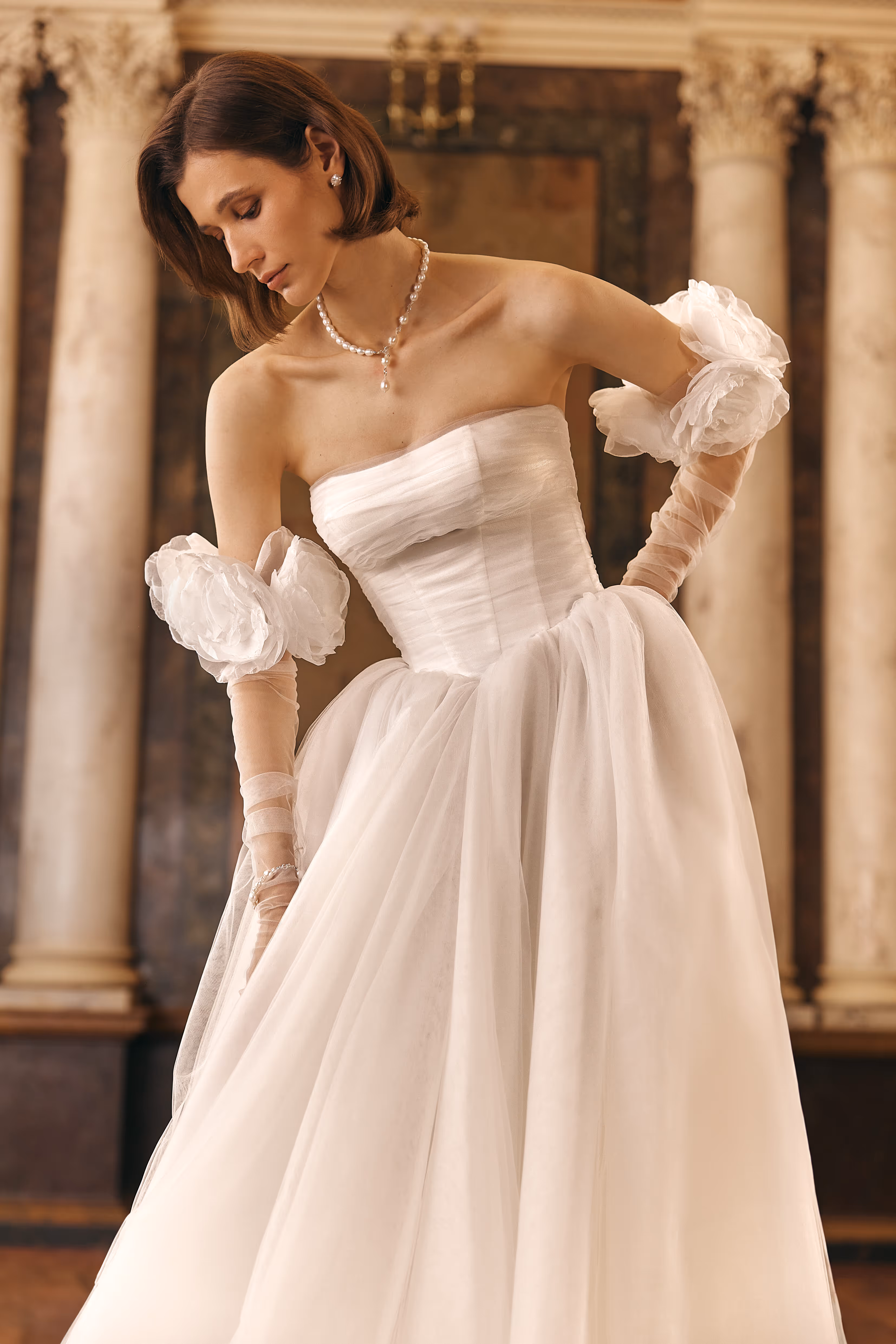 This airy A-line wedding dress creating a delicate and romantic silhouette. The structured corset with a V-shaped waistline beautifully enhances the figure, while the subtle underbust cut adds a modern touch. The look is completed with elegant detachable gloves adorned with floral embellishments, adding a unique and sophisticated detail. Perfect for the bride who desires a blend of femininity, elegance, and effortless beauty.
