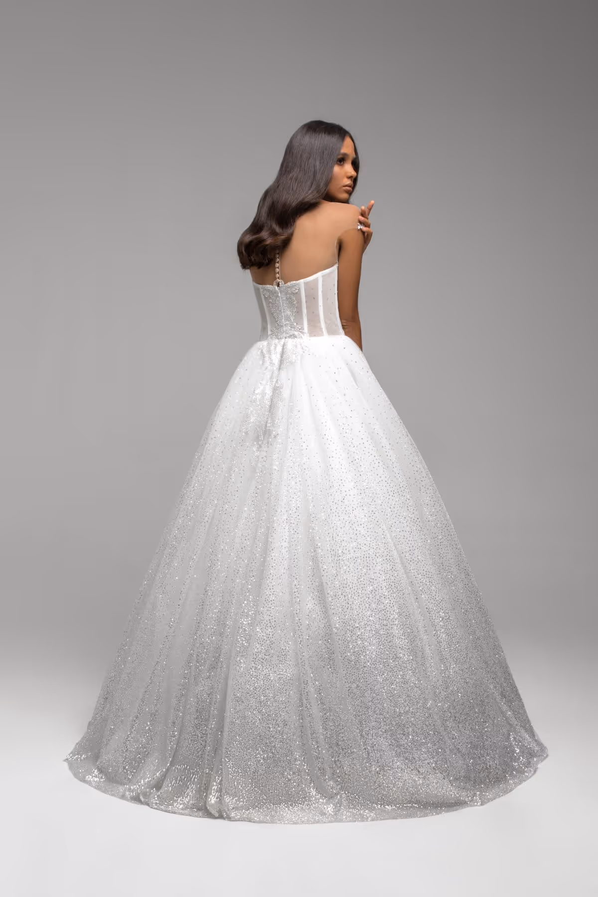 This lavish gown boasts a full silhouette with a sparkling skirt and a corset adorned with intricate lace. The shimmering skirt adds a touch of glamour, while the ornate lace detailing on the corset enhances its elegance. Perfect for the bride who desires opulence and sophistication on her special day.