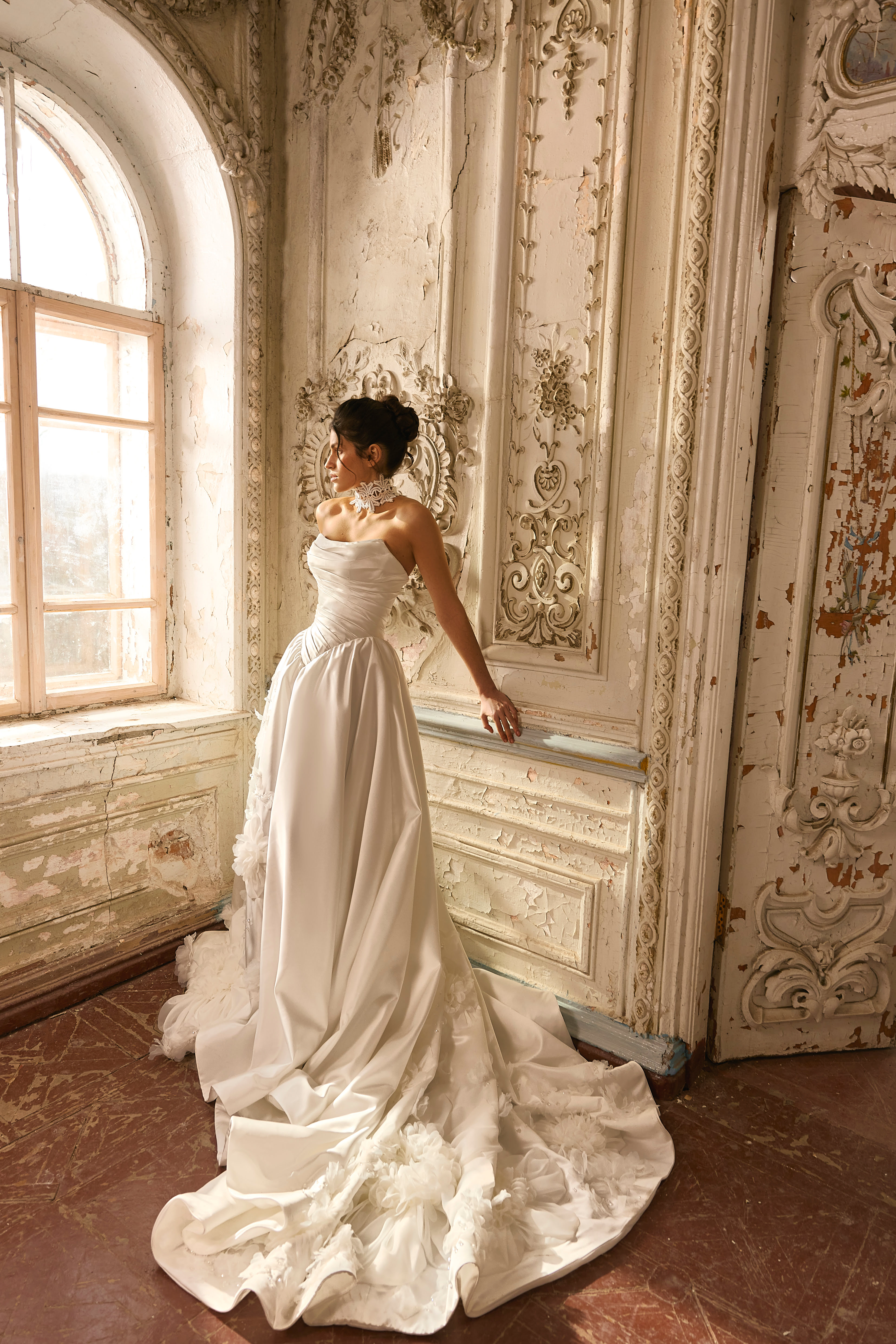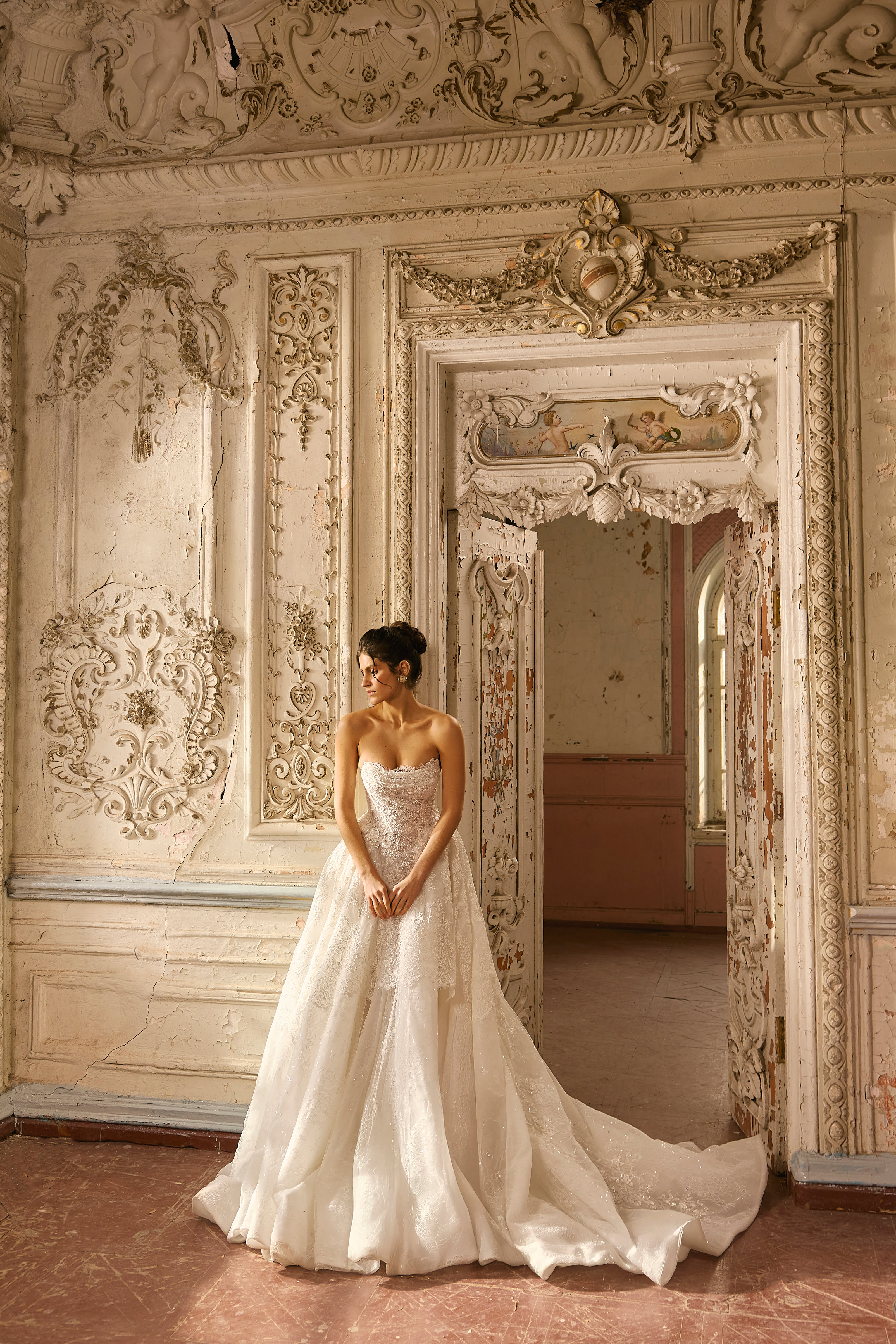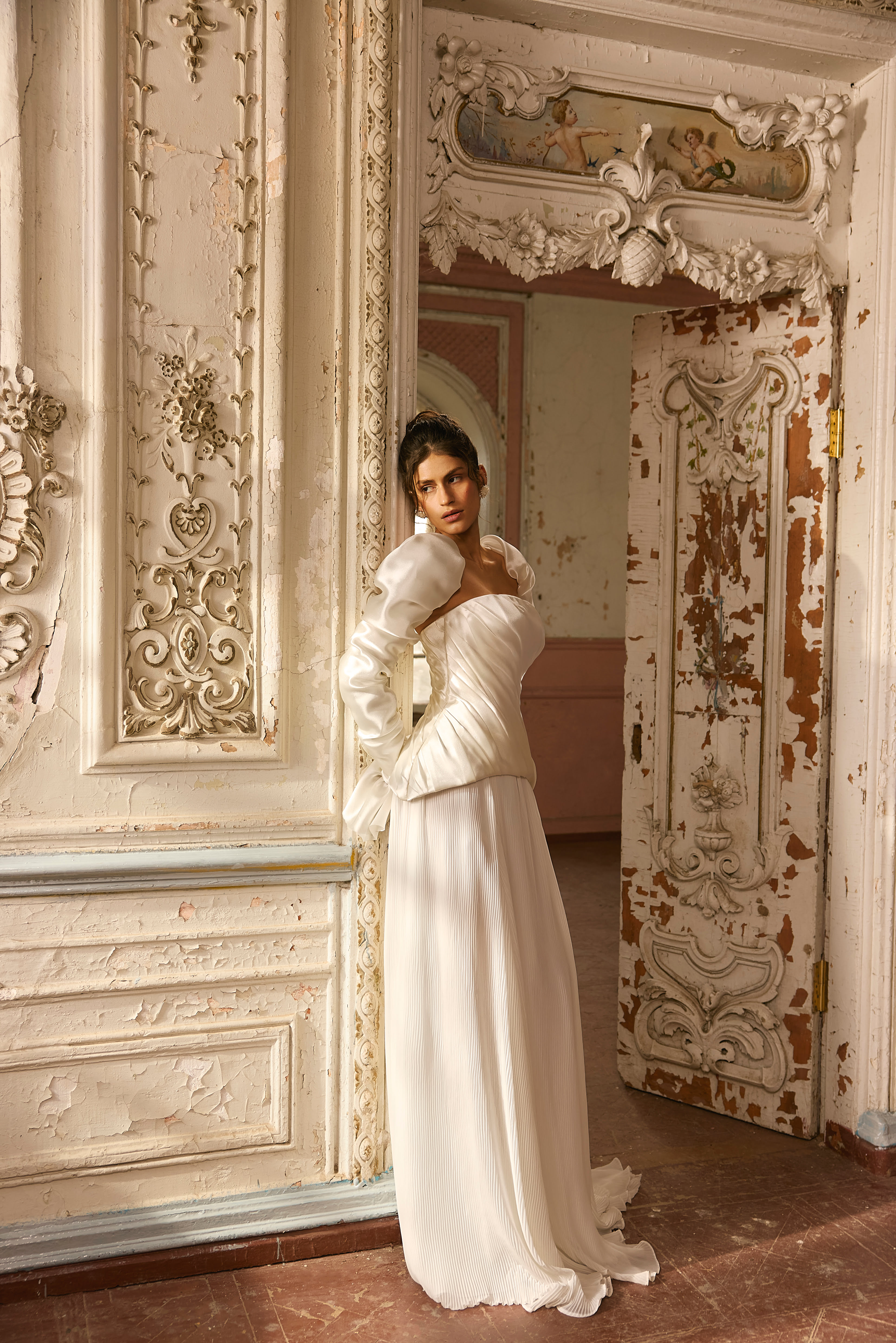 This mermaid silhouette dress embodies elegance and luxury. It is adorned with delicate lace that enhances its charm and sophistication. The double decorated bodice adds a touch of refinement, creating a unique look. The detachable cascading sleeves and neck decoration add a romantic and complete touch to the dress. A perfect choice for brides who want to look stunning on their special day.