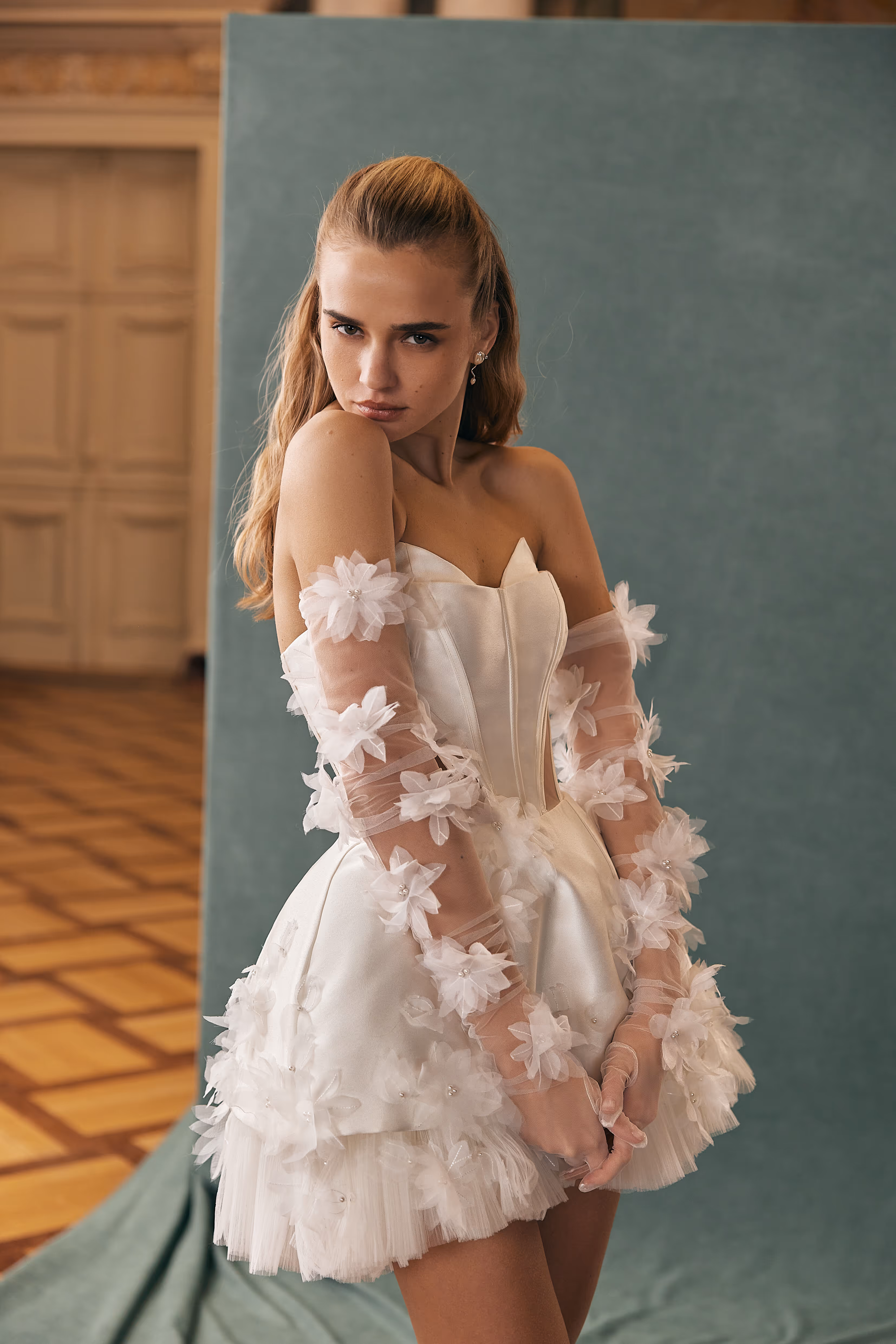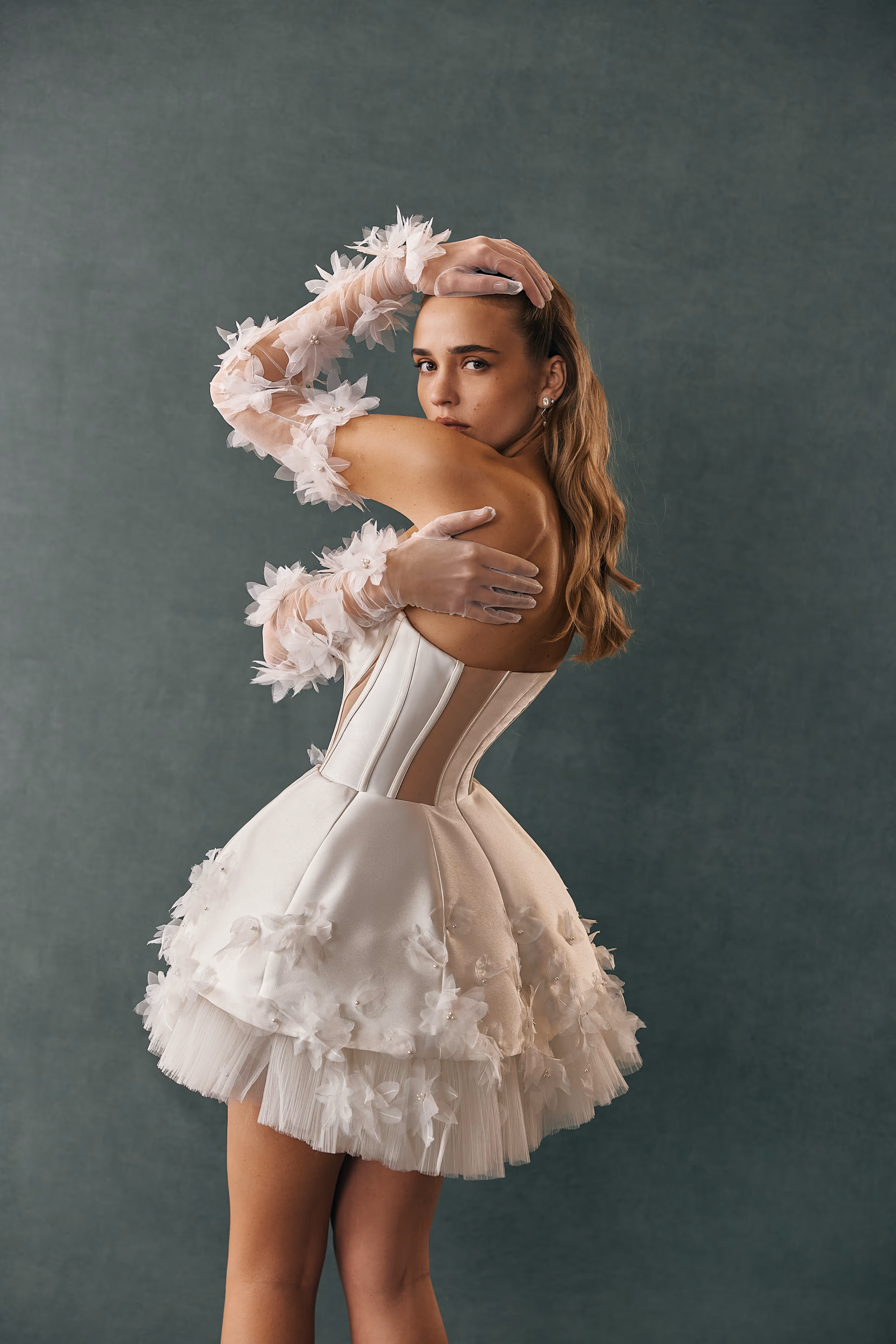 A stunning mini wedding dress made from luxurious Mikado fabric, featuring a corset with pointed cups and transparent inserts for a modern, bold touch. The voluminous skirt, made from Mikado with a pleated tulle crinoline, adds graceful movement. Floral embellishments decorate the dress and matching floral gloves complete the look, offering a perfect blend of elegance and romance.