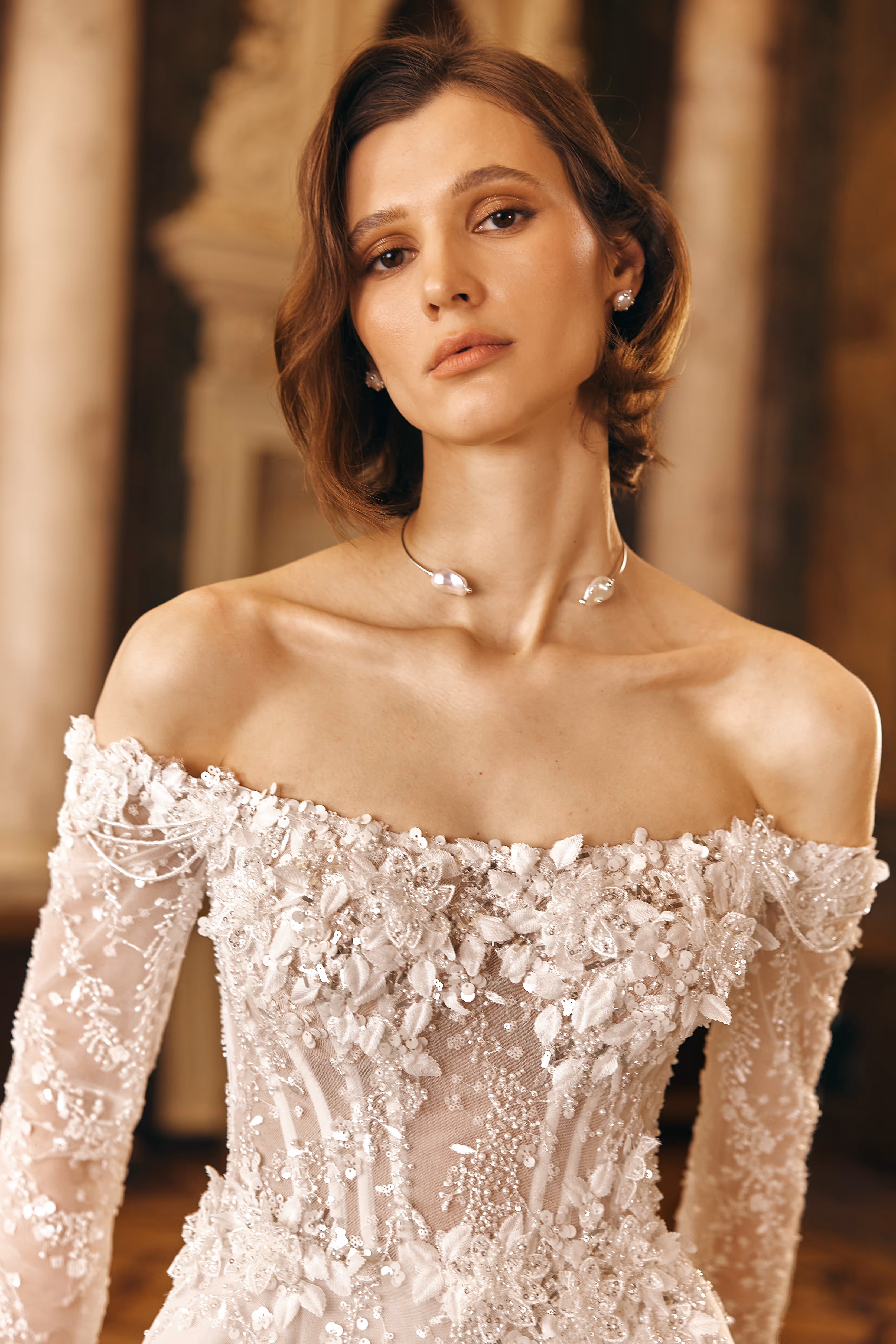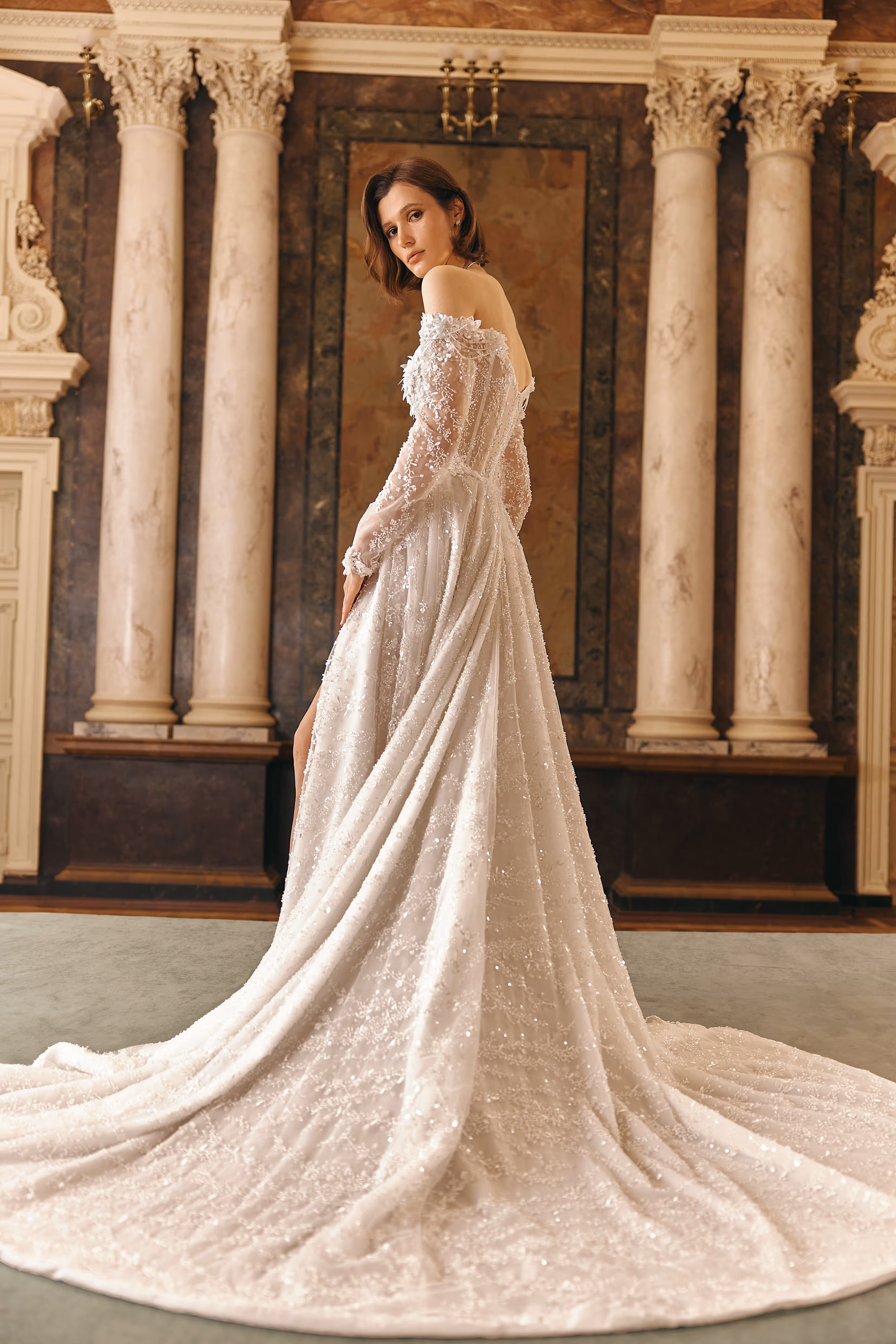 This exquisite A-line wedding dress features delicate lace and a flowing silhouette that flatters every bride. The long sleeves add grace and refinement, while intricate hand-sewn embellishments make the gown truly unique. A high slit in the skirt brings a hint of allure, perfectly complementing the regal train that trails behind. Designed for brides who seek romance, sophistication, and a touch of drama.