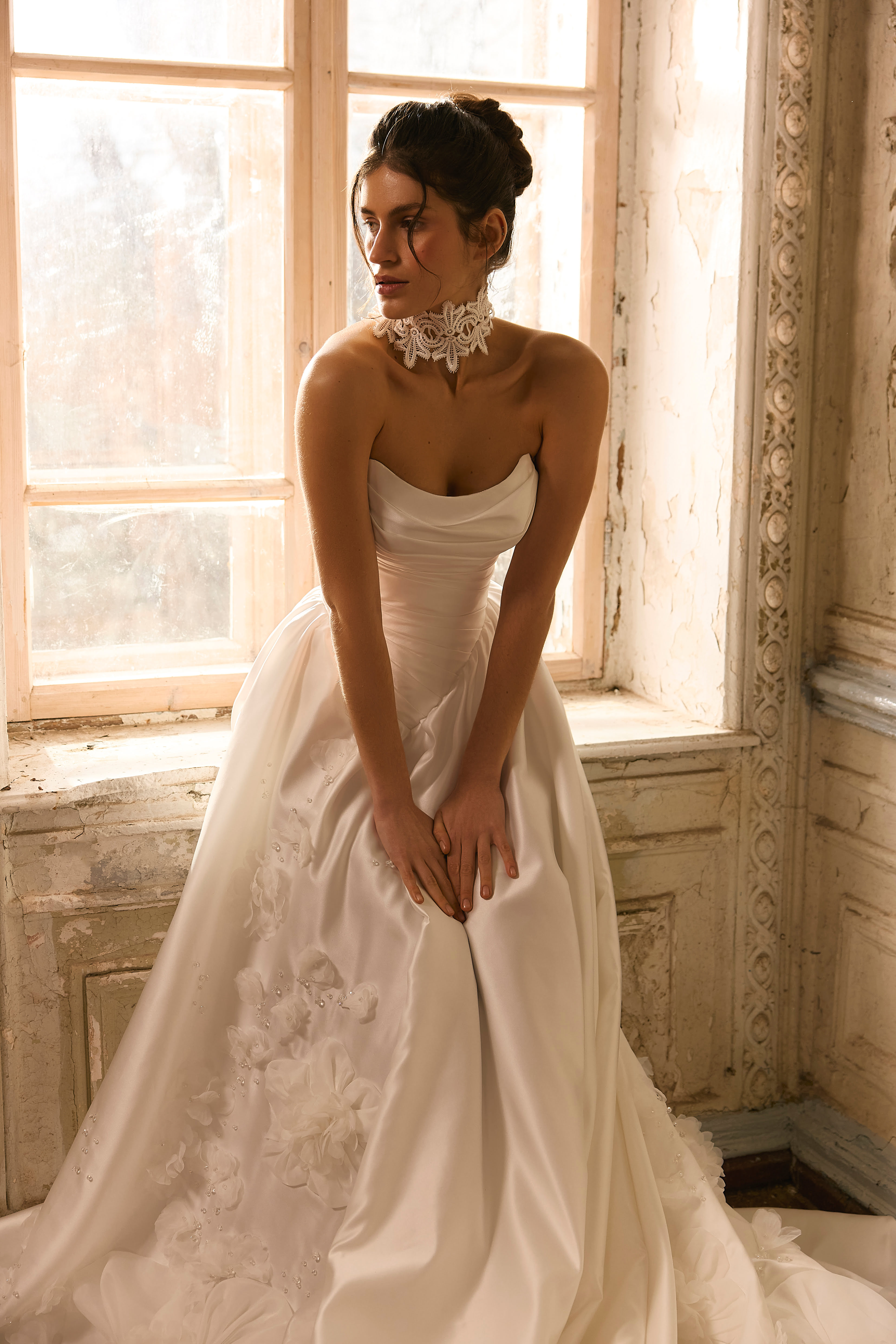 This A-line satin wedding dress blends modern bridal architecture with soft, romantic detailing. A sharp sweetheart neckline and a defined V-shaped waistline beautifully enhance the silhouette, creating a refined and flattering shape.