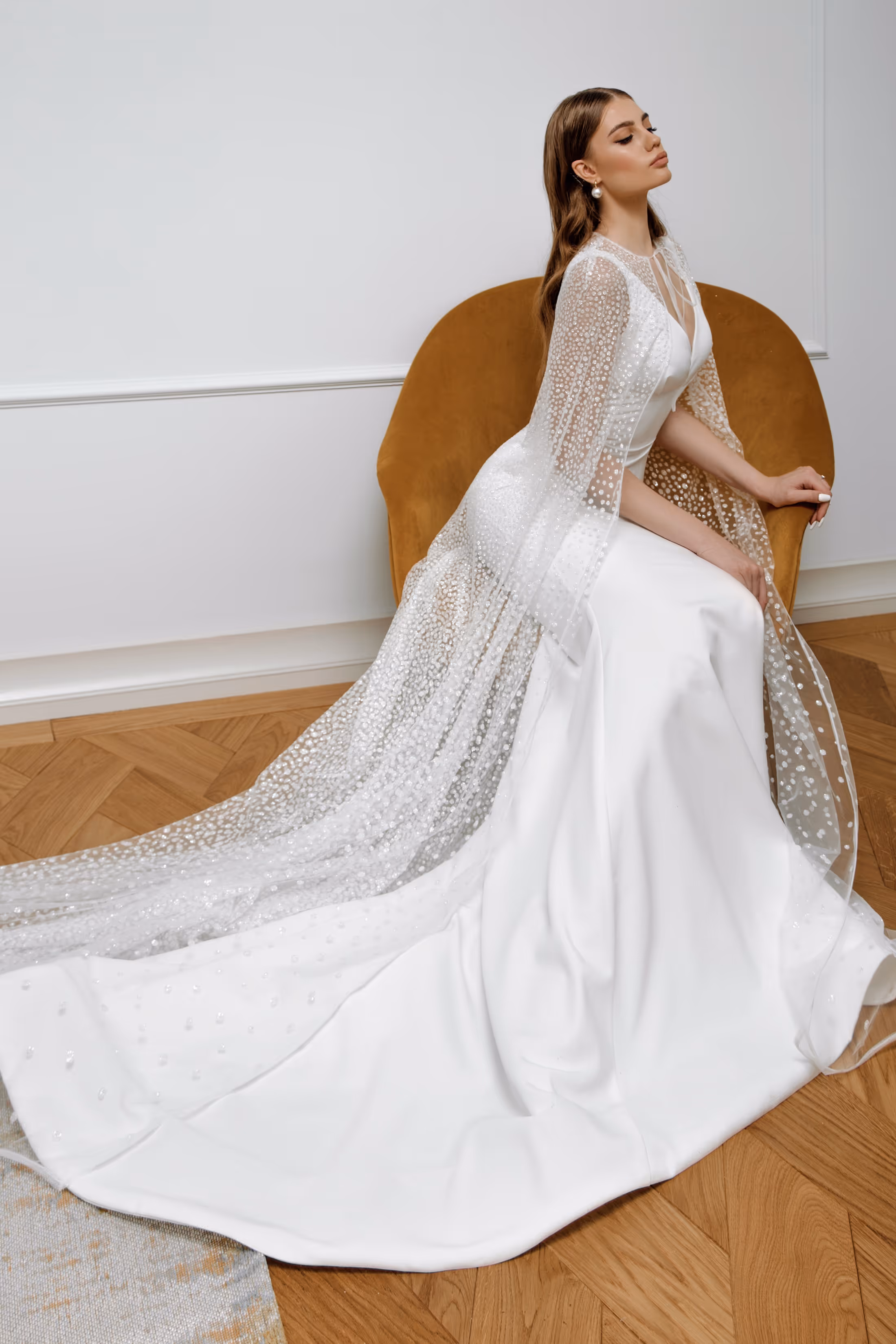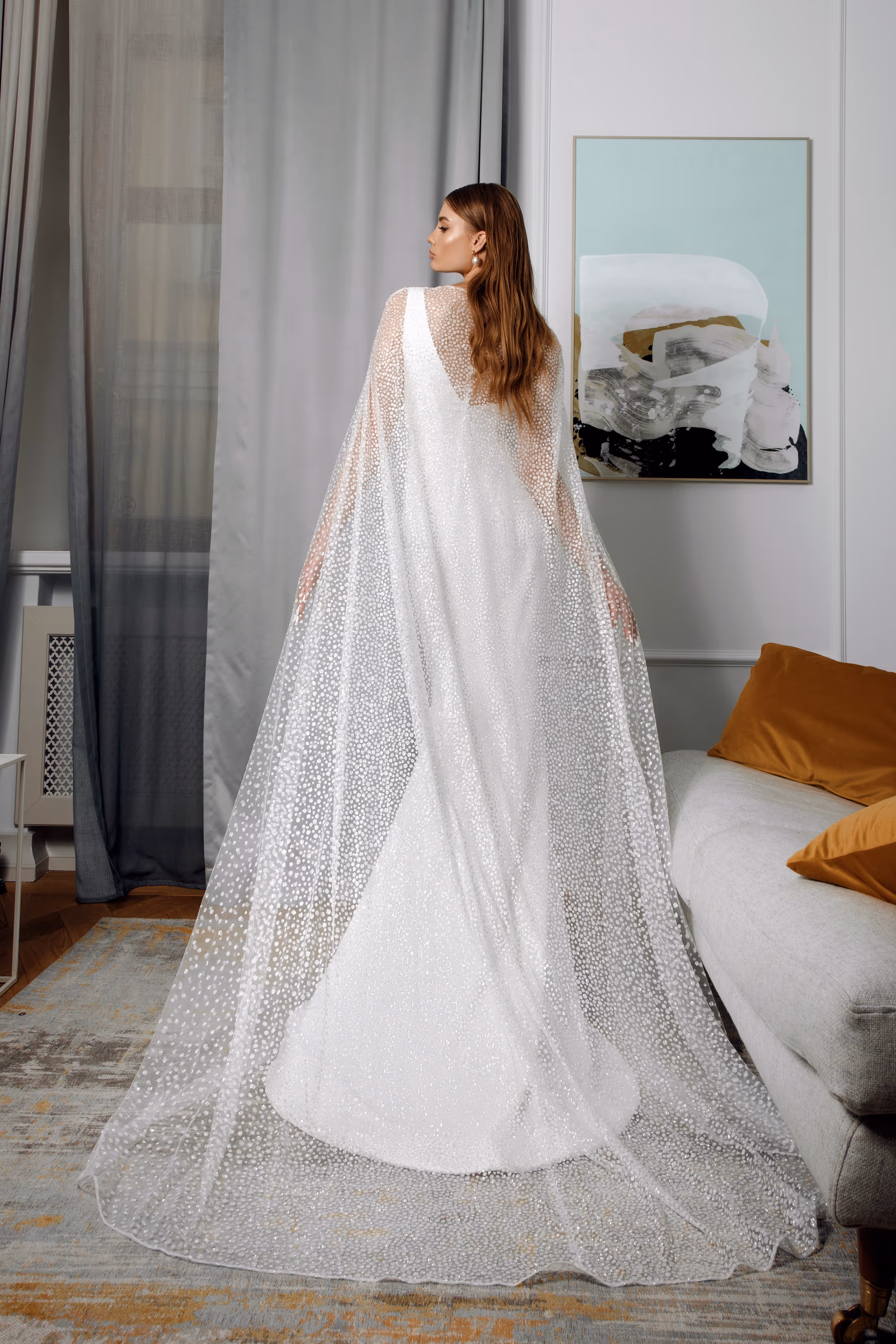 This mermaid gown crafted from mikado fabric accentuates the waist with a belt and features a V-neckline. The cape, embellished with glitter, is detachable and sold separately, adding a touch of glamour to the dress.