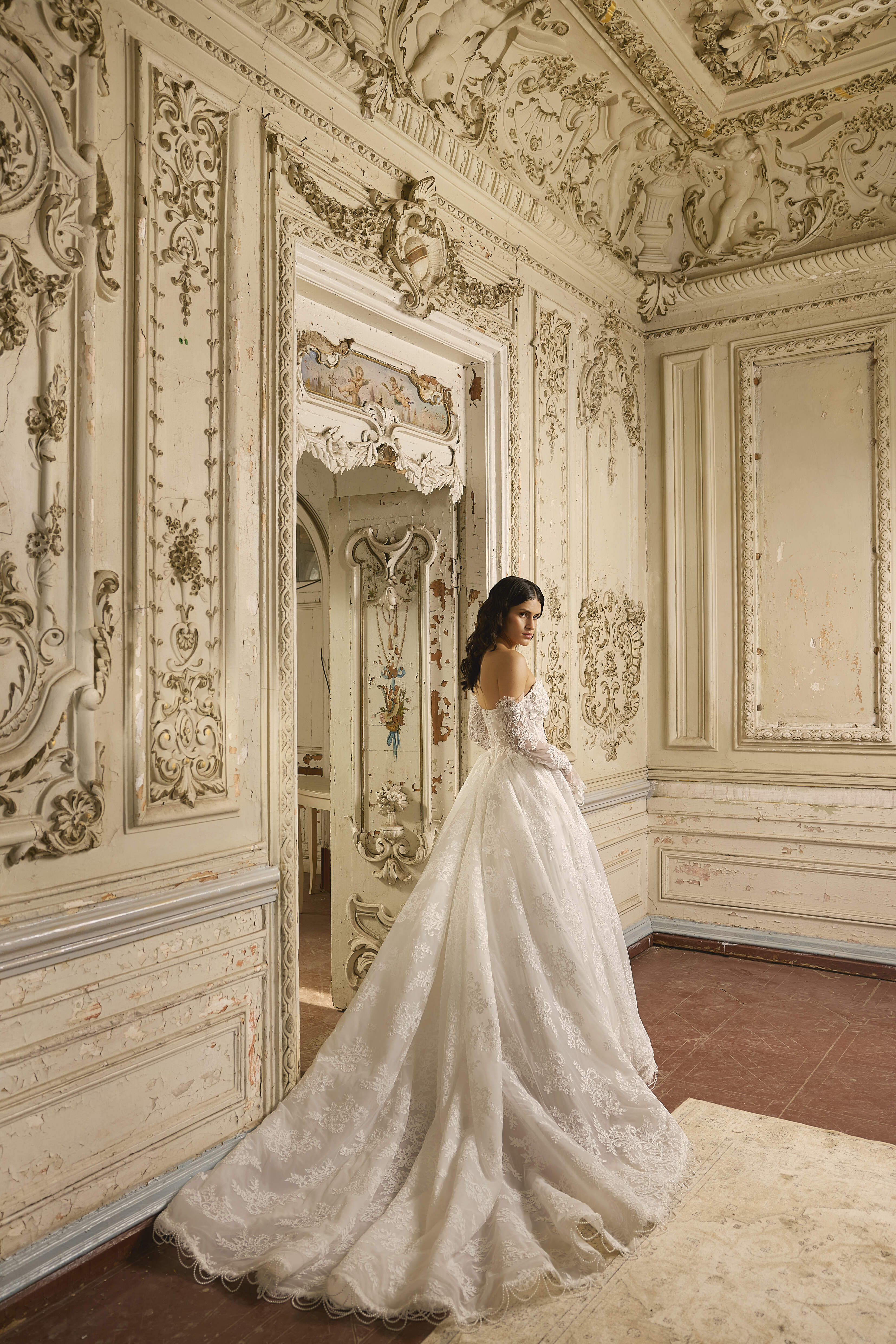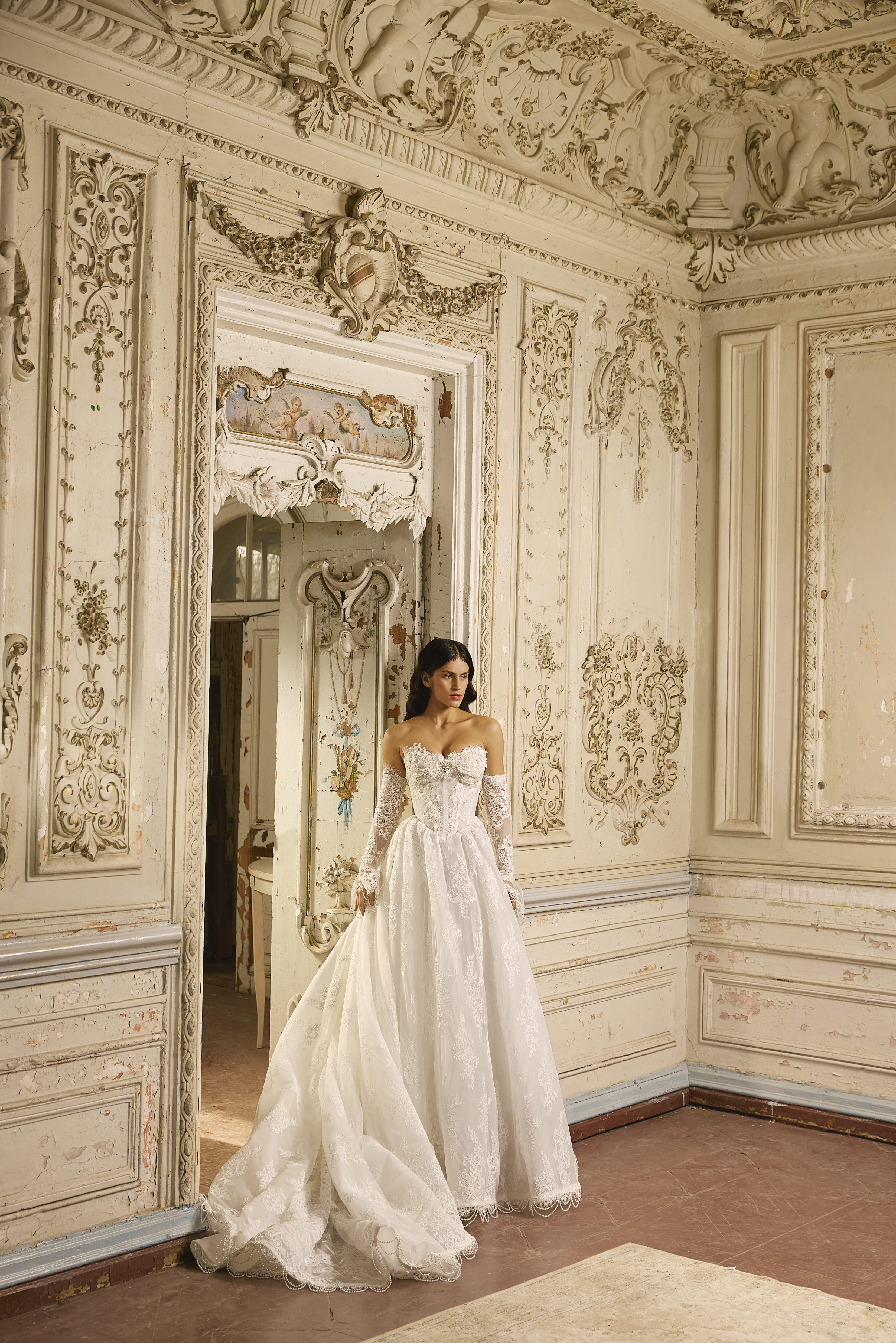 The bodice is adorned with soft tulle draping and stone embellishments, adding subtle luminosity and couture-inspired depth. The look is completed with lowered Chantilly lace gloves, finished with cascading pearl strands that gently frame the shoulders and bring graceful movement to the design.