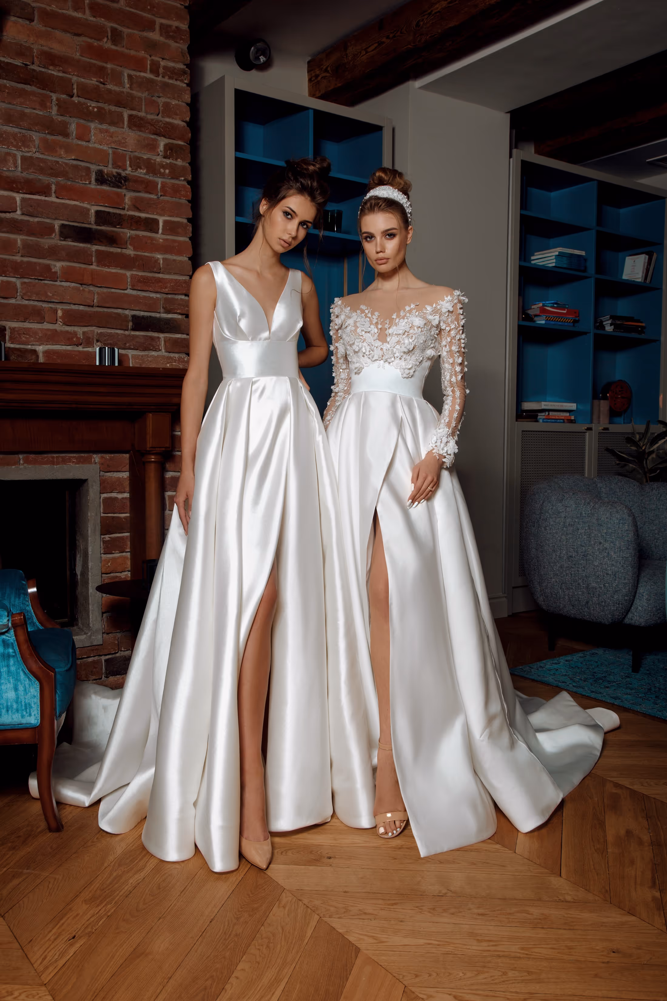 This magnificent gown crafted from Mikado fabric features a graceful train and a concealed slit, accentuating the waistline and boasting a stunning V-neckline. Additionally, it can be paired with a matching cape, perfect for those desiring an extra touch of elegance.