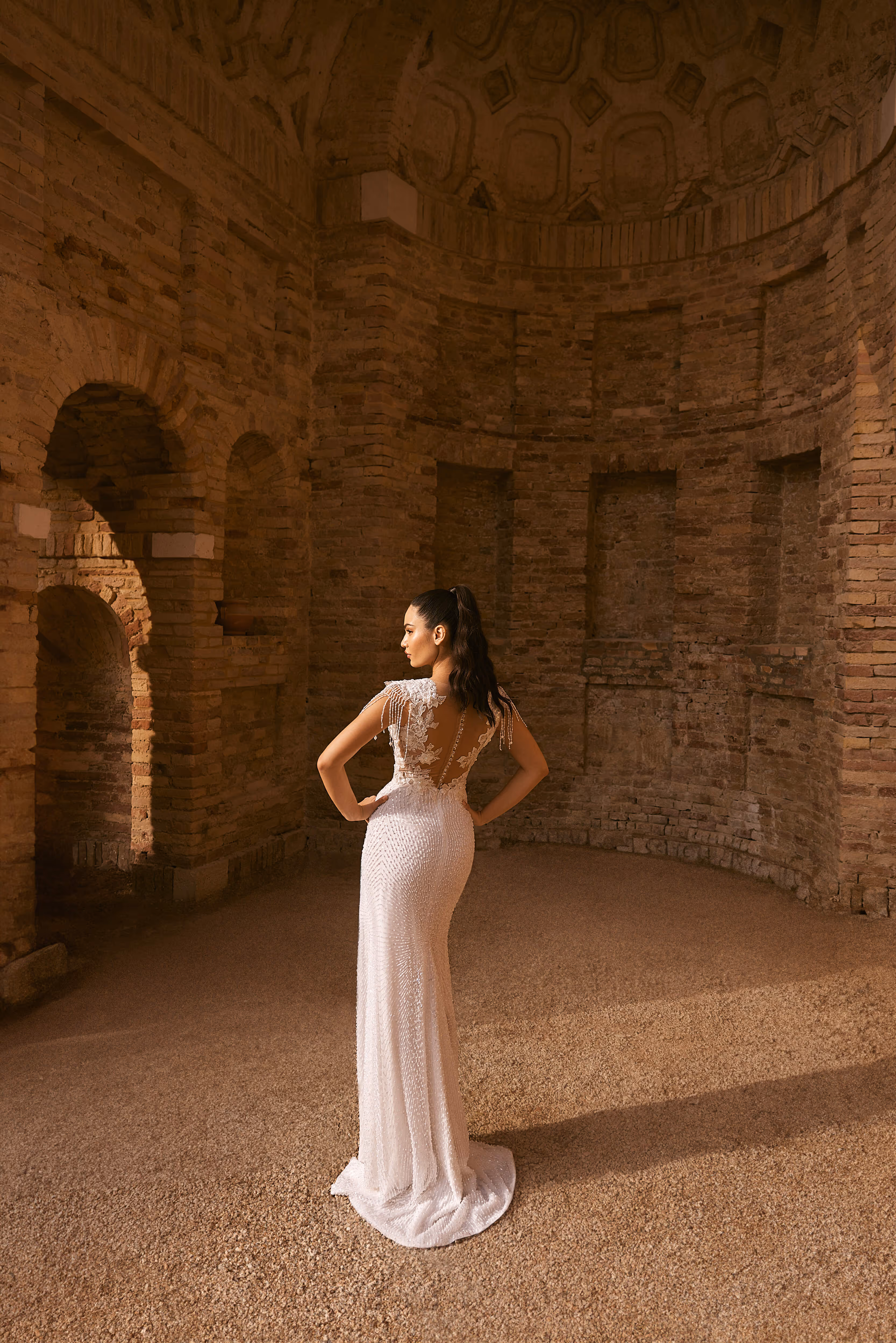 Redefine elegance with this intricately adorned lace gown. Featuring a flattering V-neckline and wide straps, this design beautifully frames your silhouette. Delicate beadwork cascades over the shoulders in sparkling strands, adding a touch of luxury. The buttoned back offers timeless sophistication, while the daring slit on the skirt ensures modern allure.