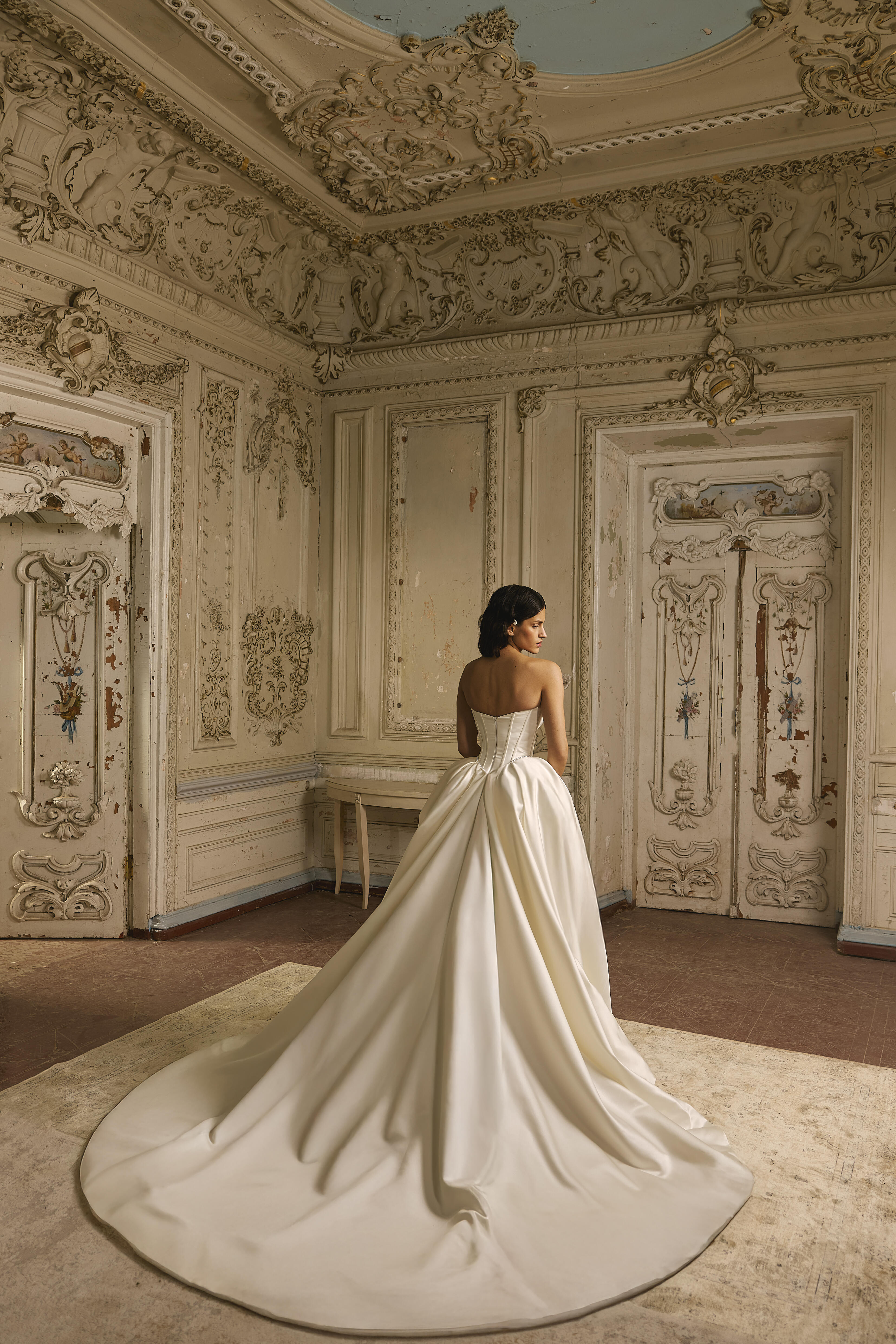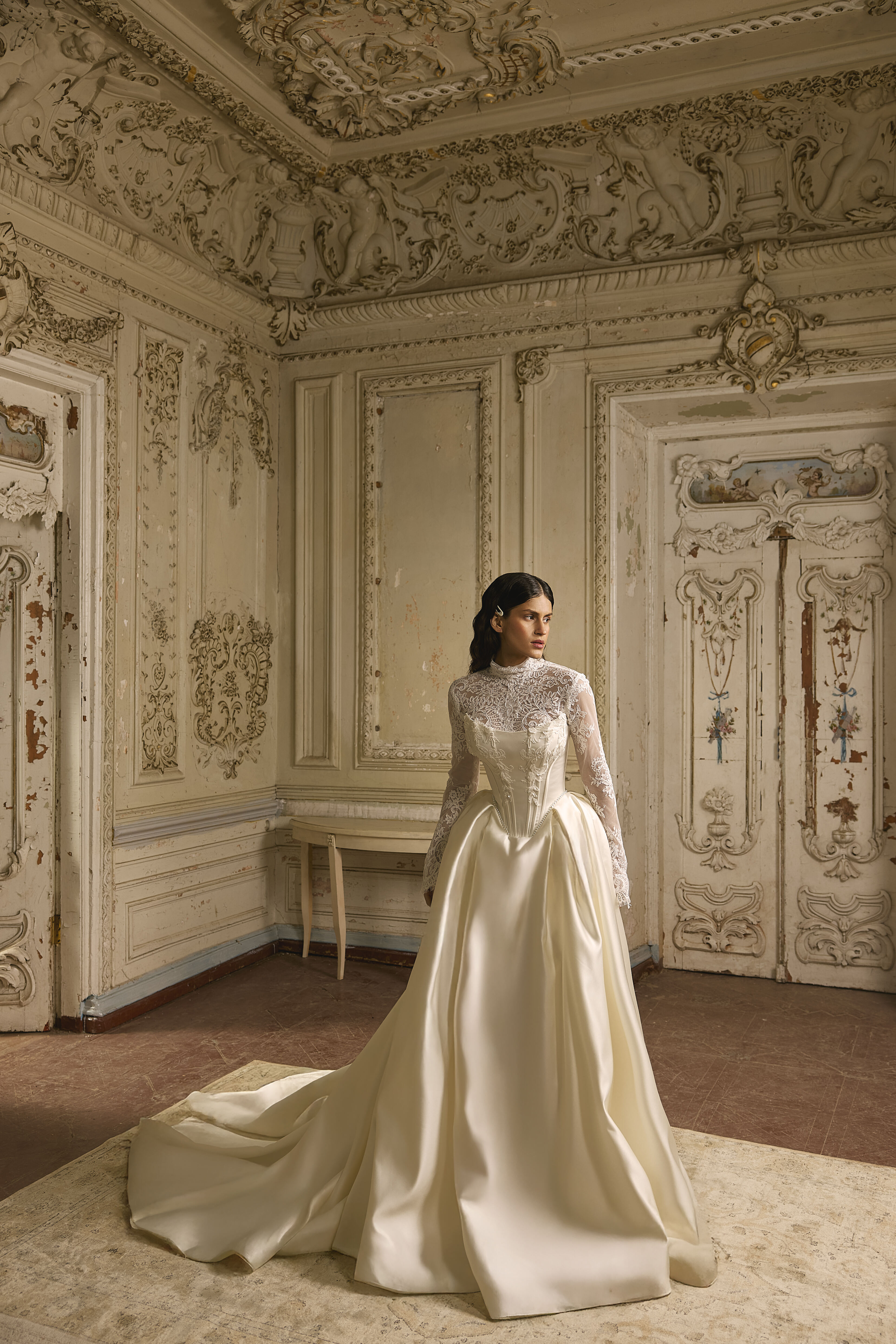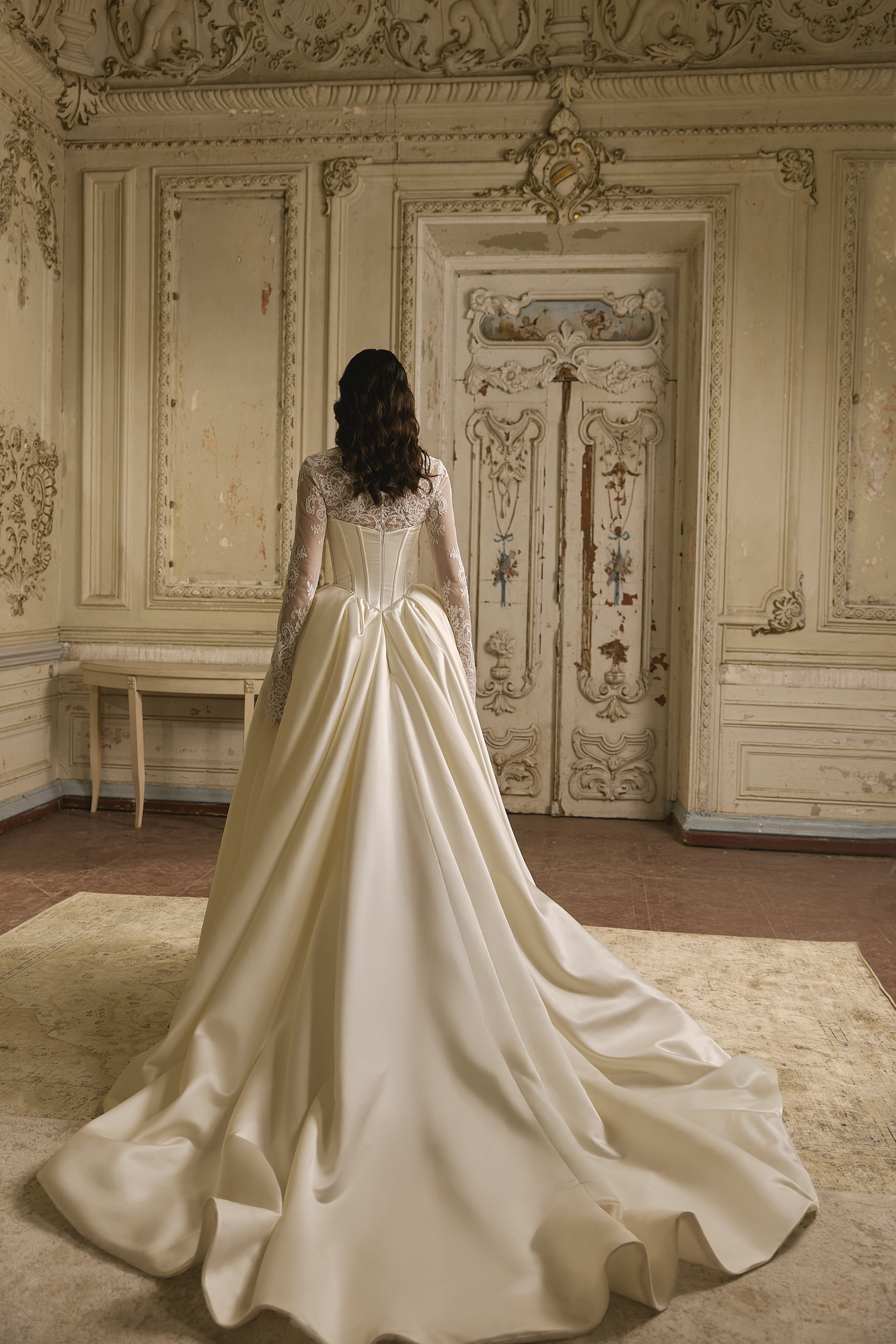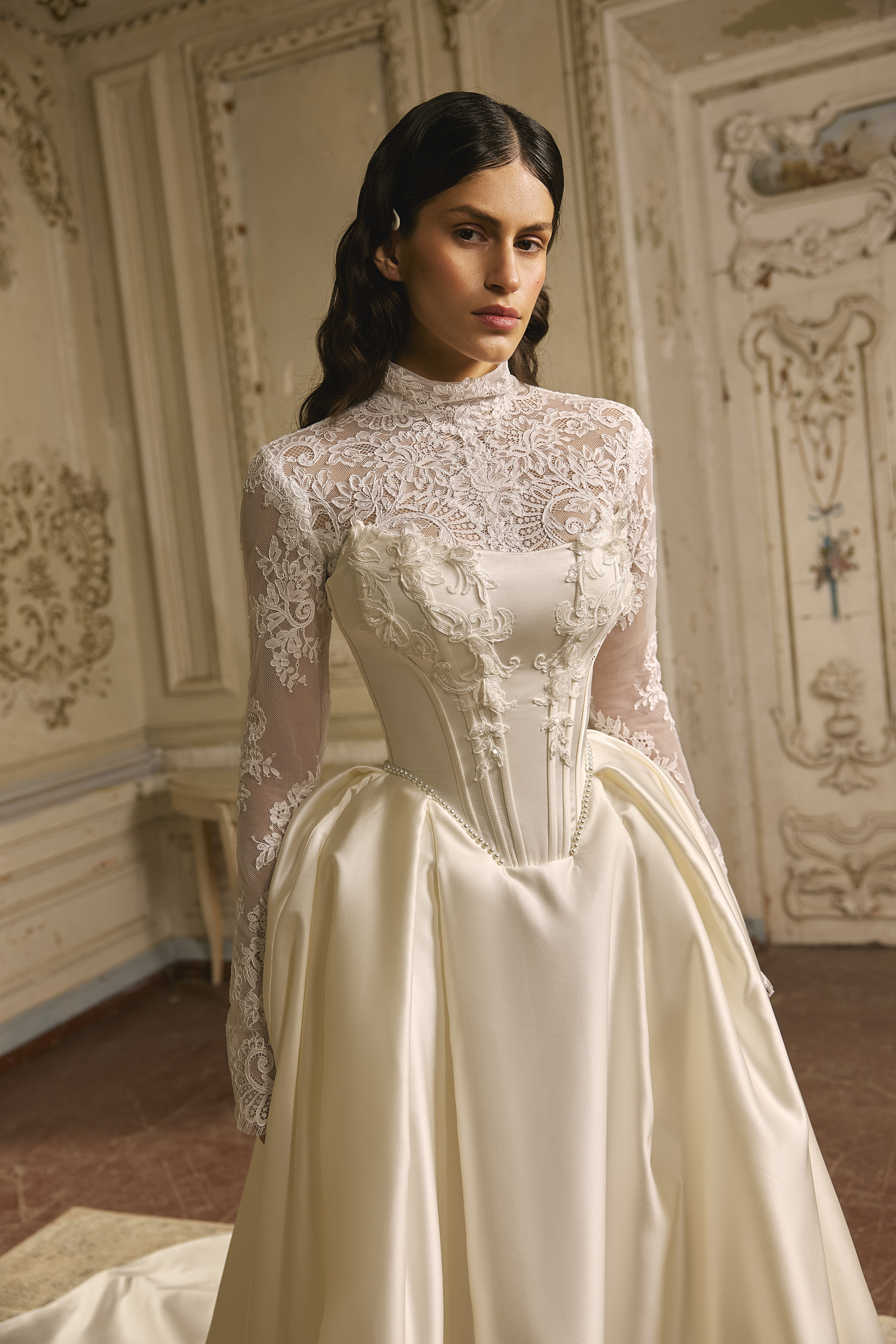 This satin wedding dress with a V-shaped waistline balances structured elegance with refined detailing. The corset is adorned with lace, adding depth and softness to the clean, architectural silhouette.