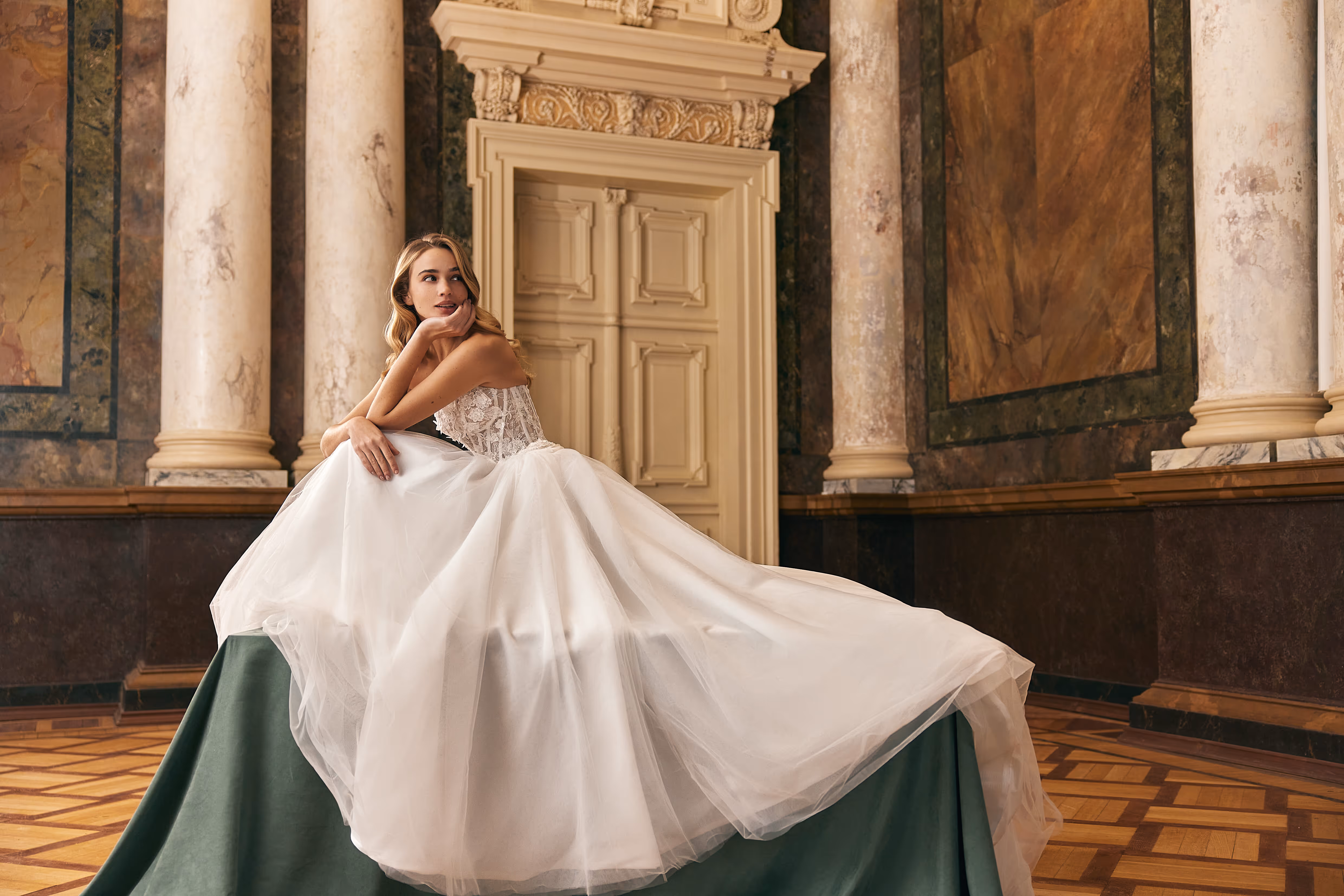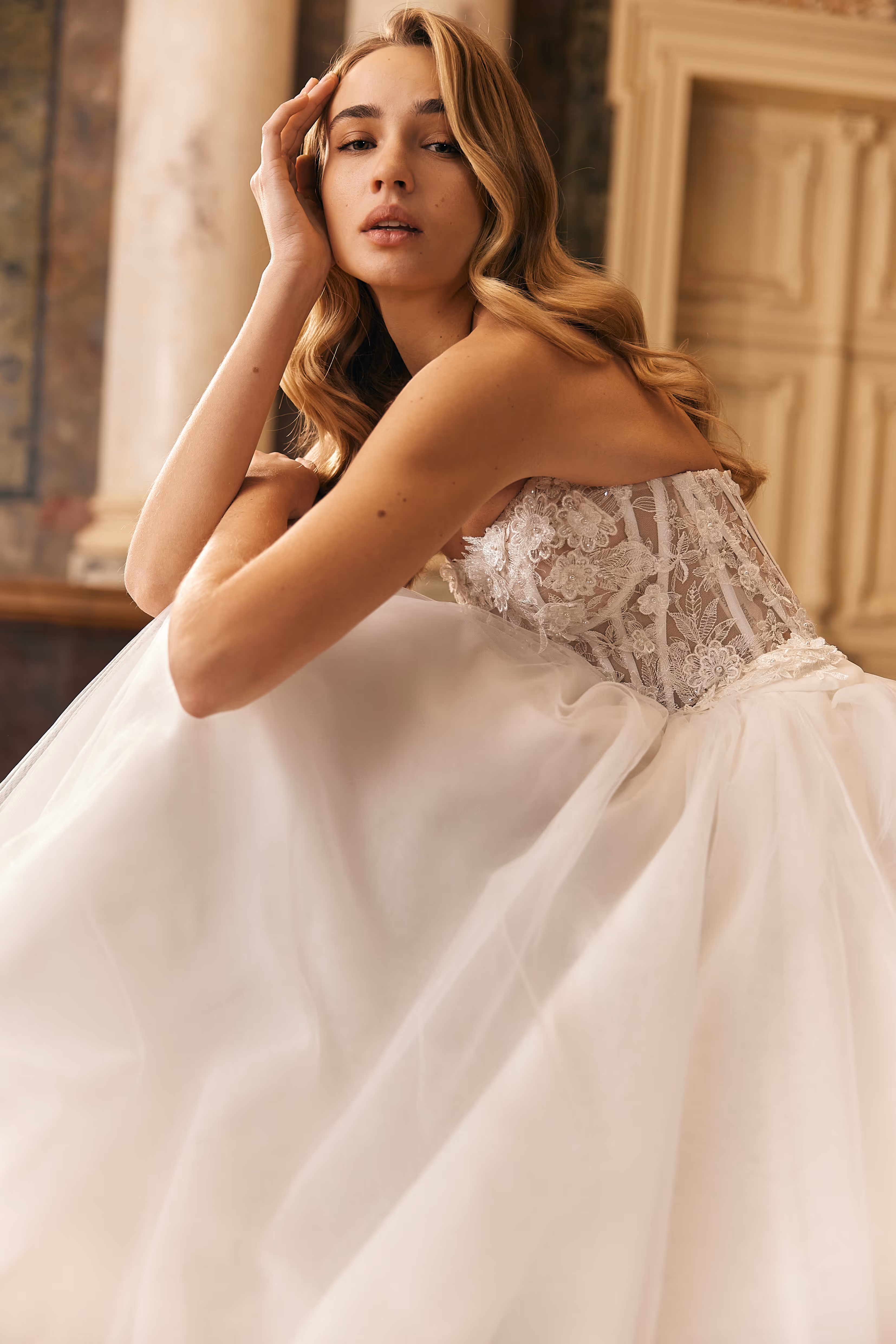 A breathtaking A-line wedding gown designed to highlight elegance and femininity. The beautifully decorated corset accentuates the waistline, creating a refined and flattering silhouette. A soft tulle skirt cascades effortlessly, adding lightness and movement, while the flowing train enhances the gown’s romantic allure. A perfect choice for a bride seeking grace, sophistication, and timeless beauty.