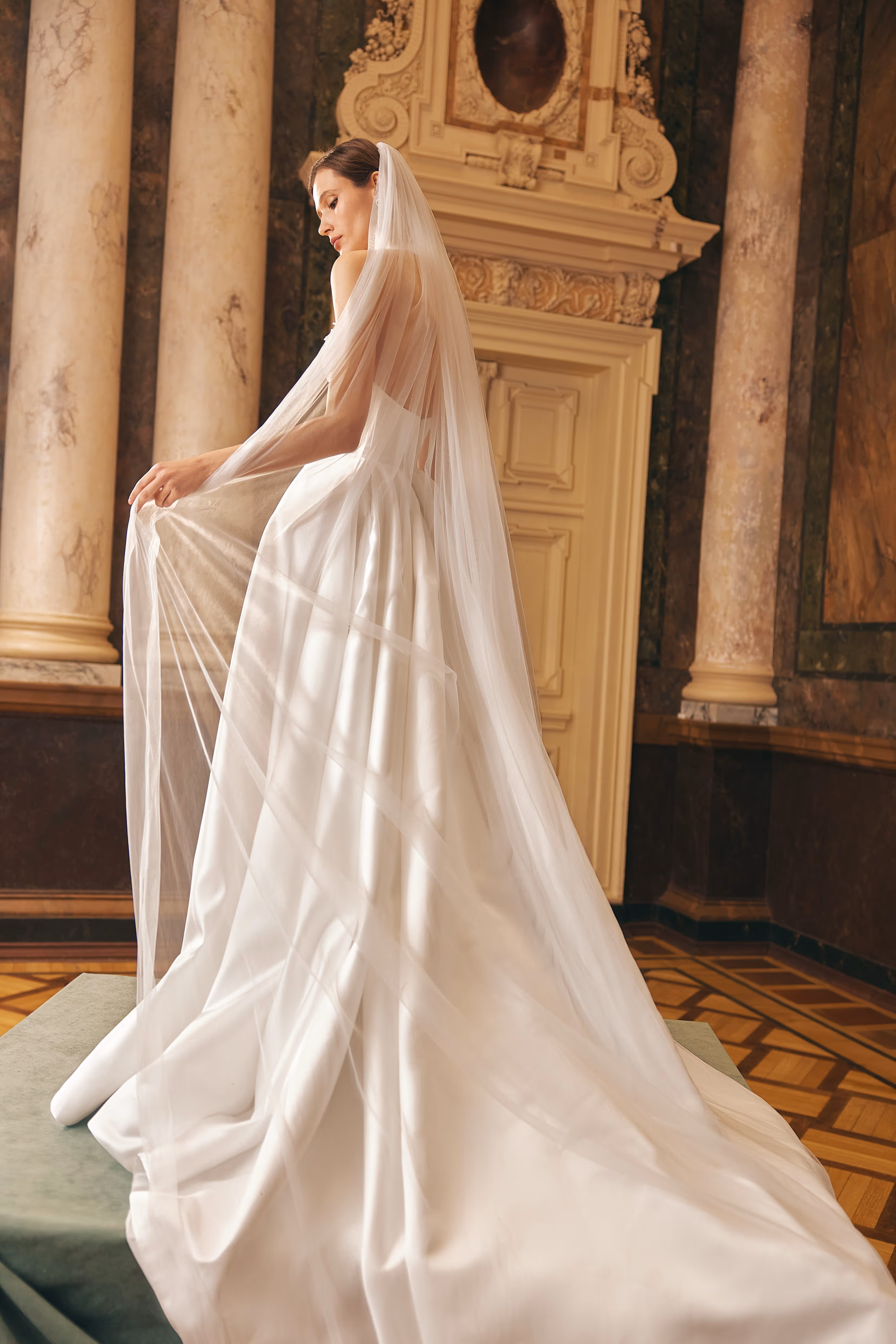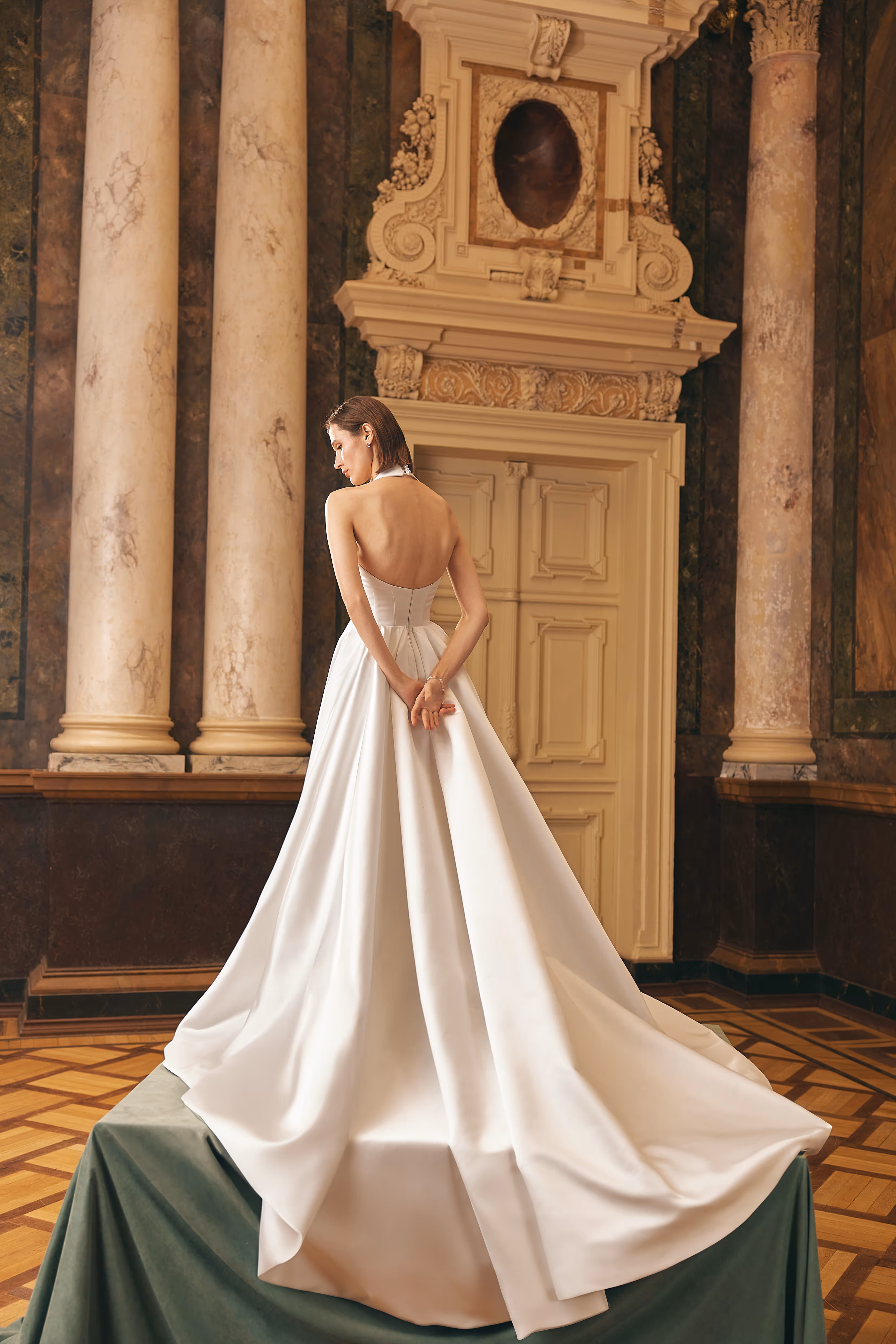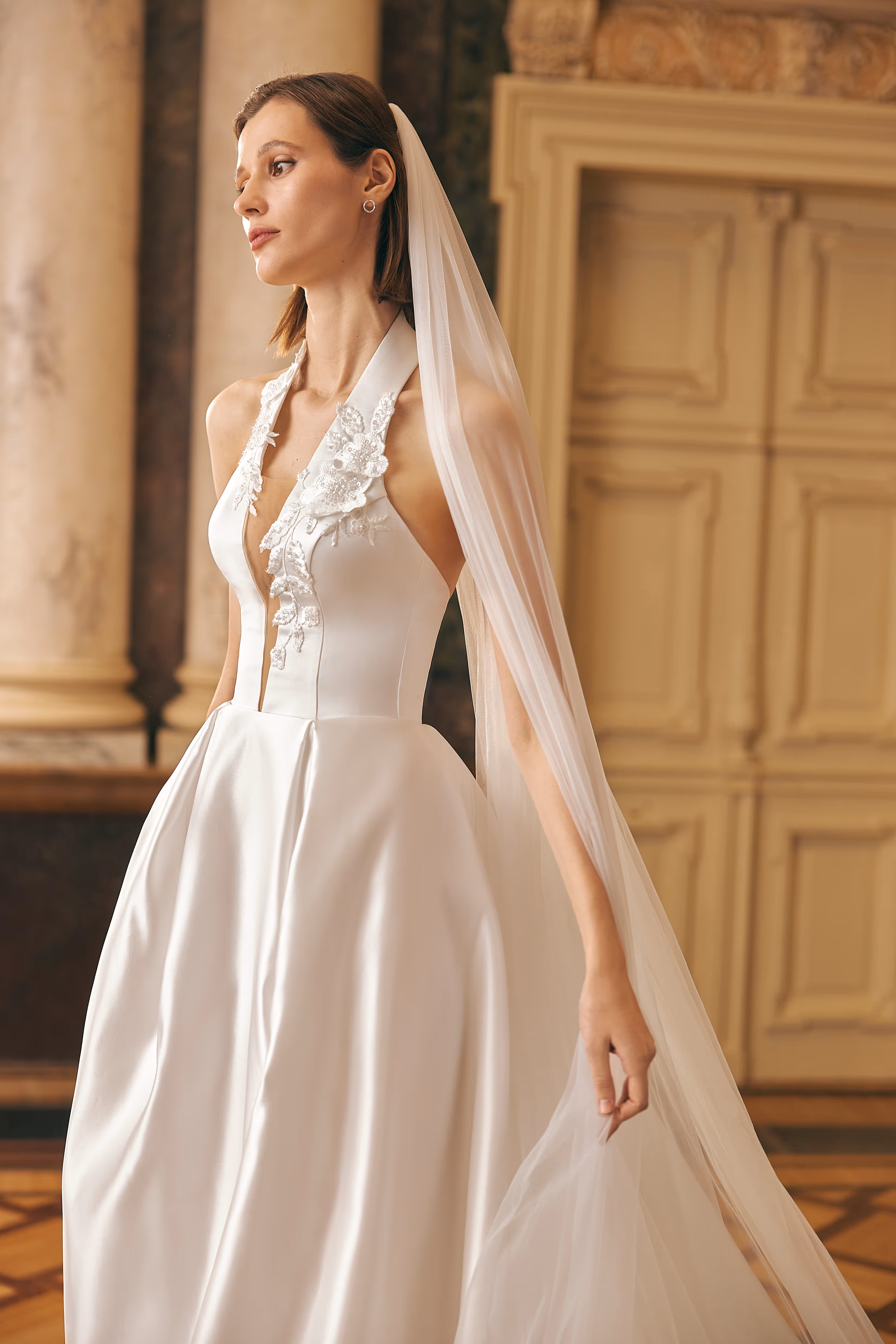 This minimalist satin wedding dress exudes sophistication with its sleek silhouette and luxurious fabric. The halter neckline gracefully frames the shoulders, while the lace-adorned corset adds delicate detailing. A deep V-neckline enhances the feminine allure, creating a refined yet captivating look. Perfect for the modern bride who appreciates timeless beauty with a contemporary twist.